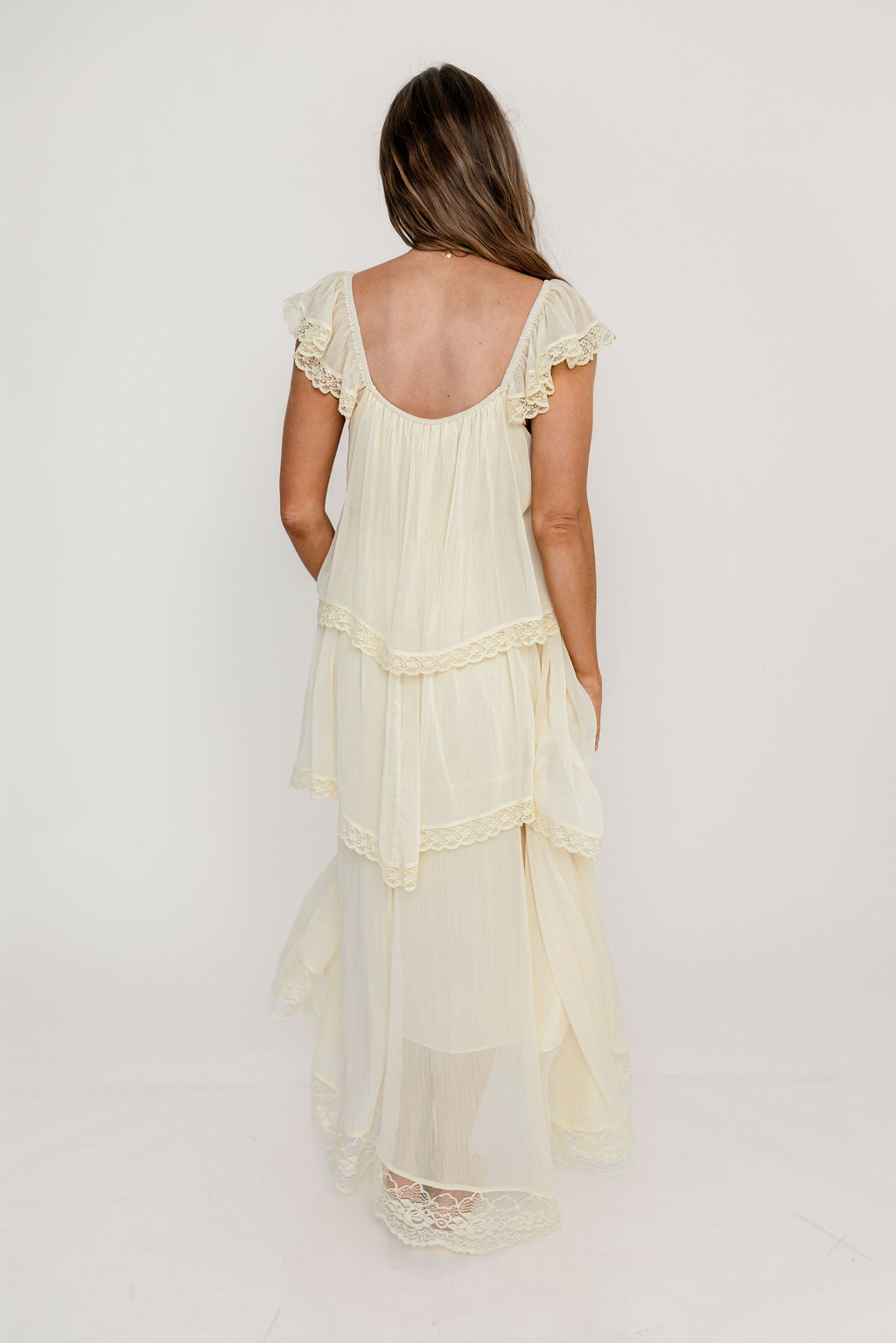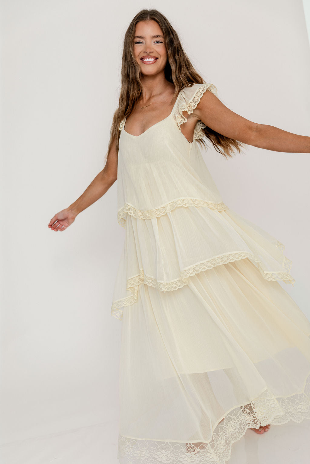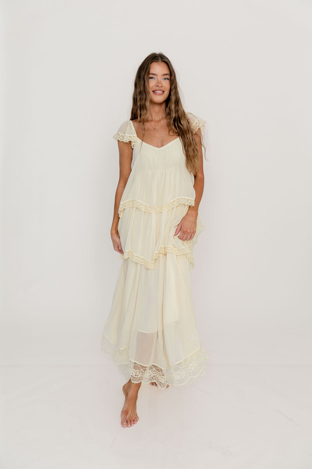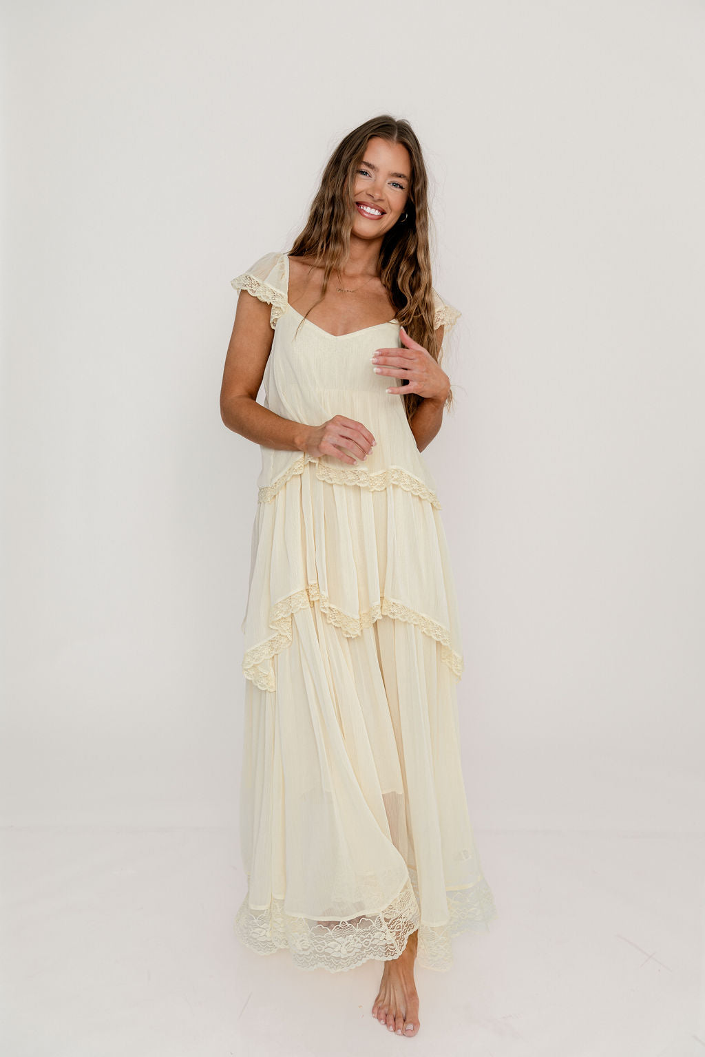 GARMENT DETAILS: Elegant, lightweight maxi dress with flattering sweetheart neckline, sheer cap sleeves, and an empire-waisted silhouette. Features a waterfall-style tiered design with lace-trim. Fully lined.