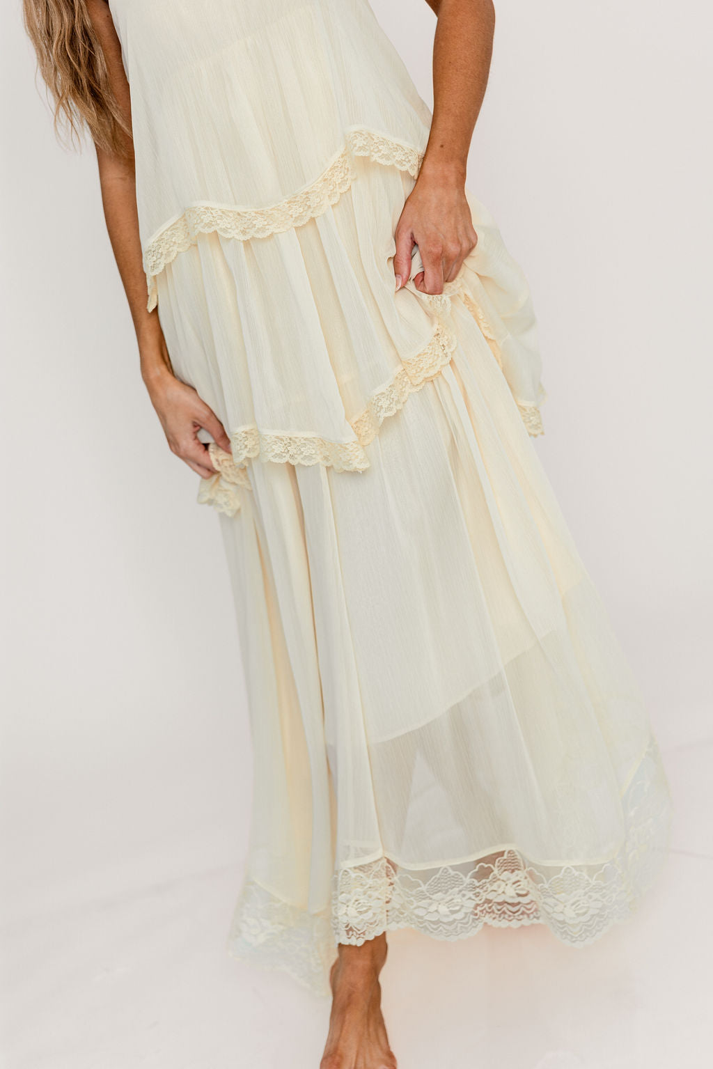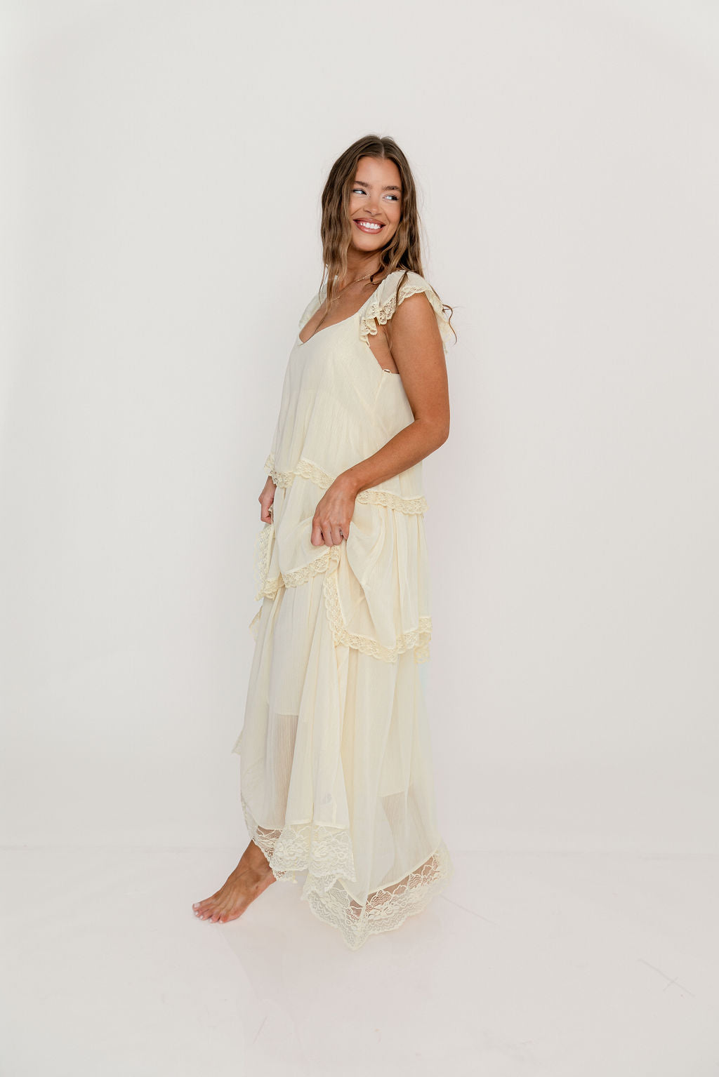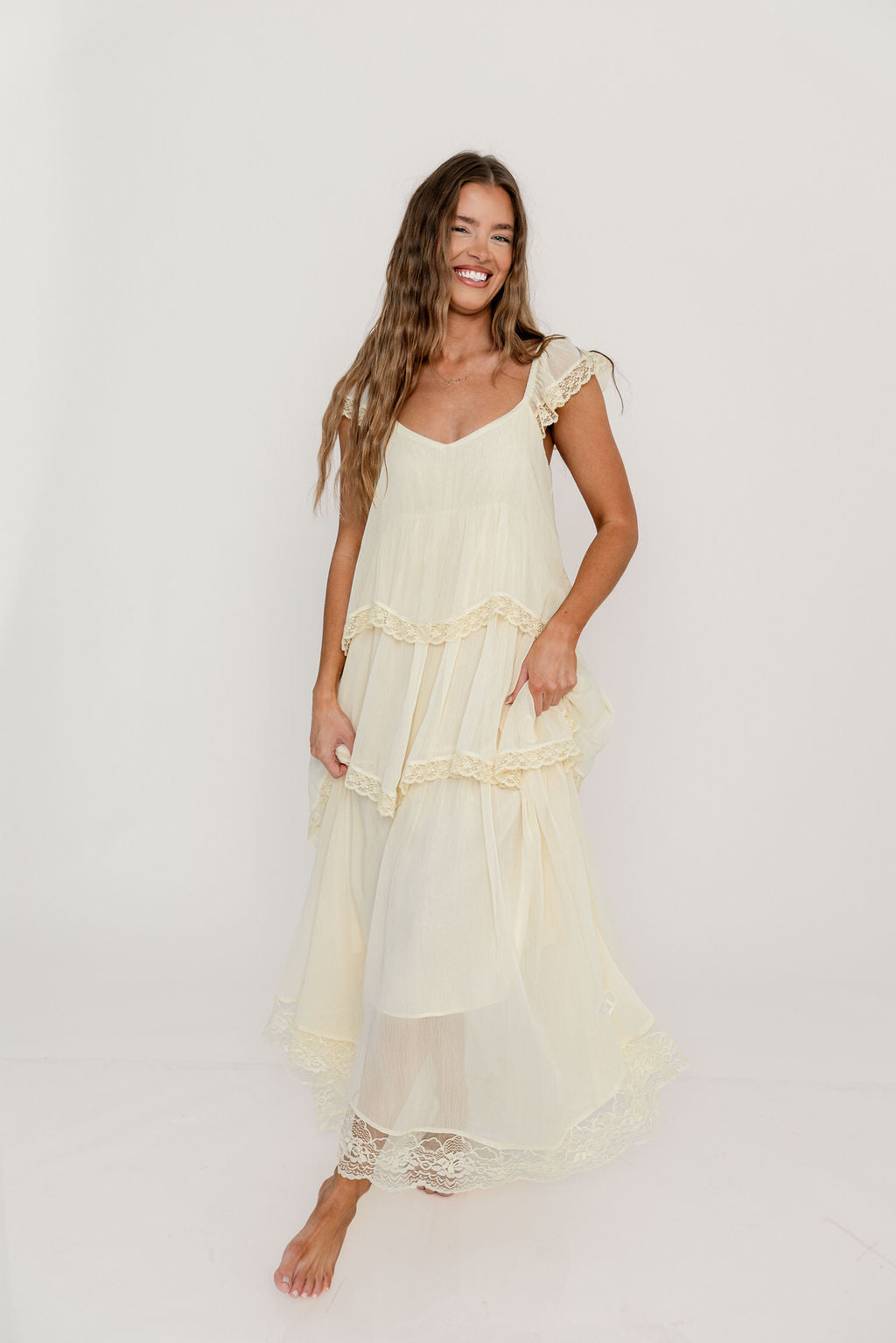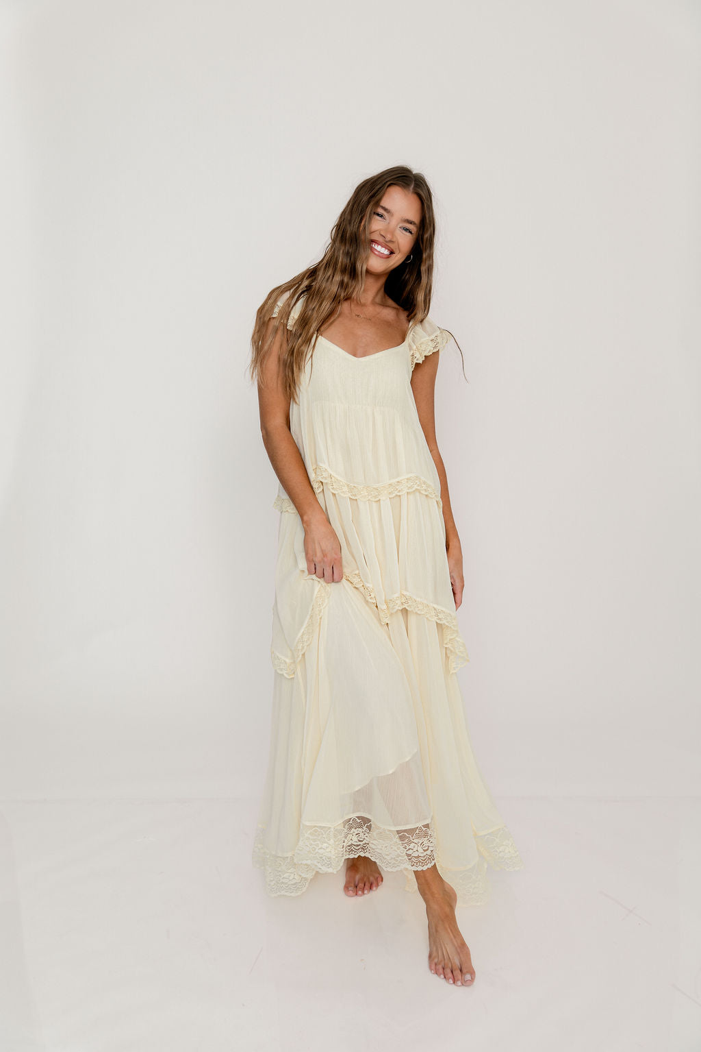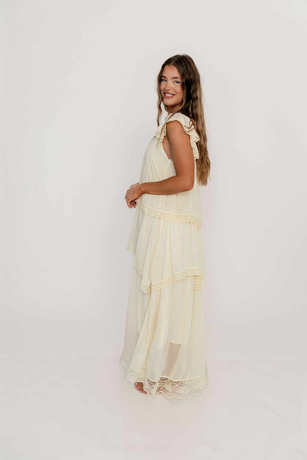 Meet the romantic new Nicola Maxi Dress, a darling addition to the Dress Shoppe (and to your closet!). This lightweight gown is stunning in its simplicity, with a waterfall tiered design and lace trim that makes every movement graceful. It's charming, feminine, and entirely picturesque.