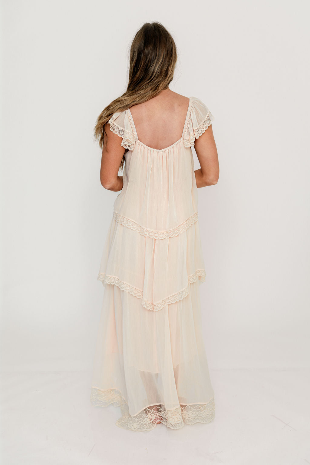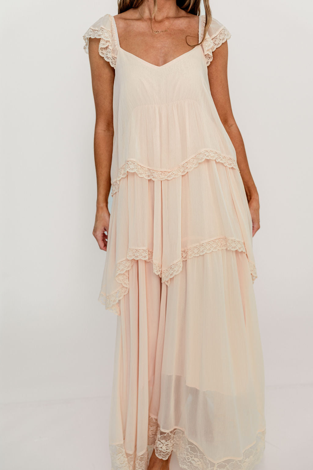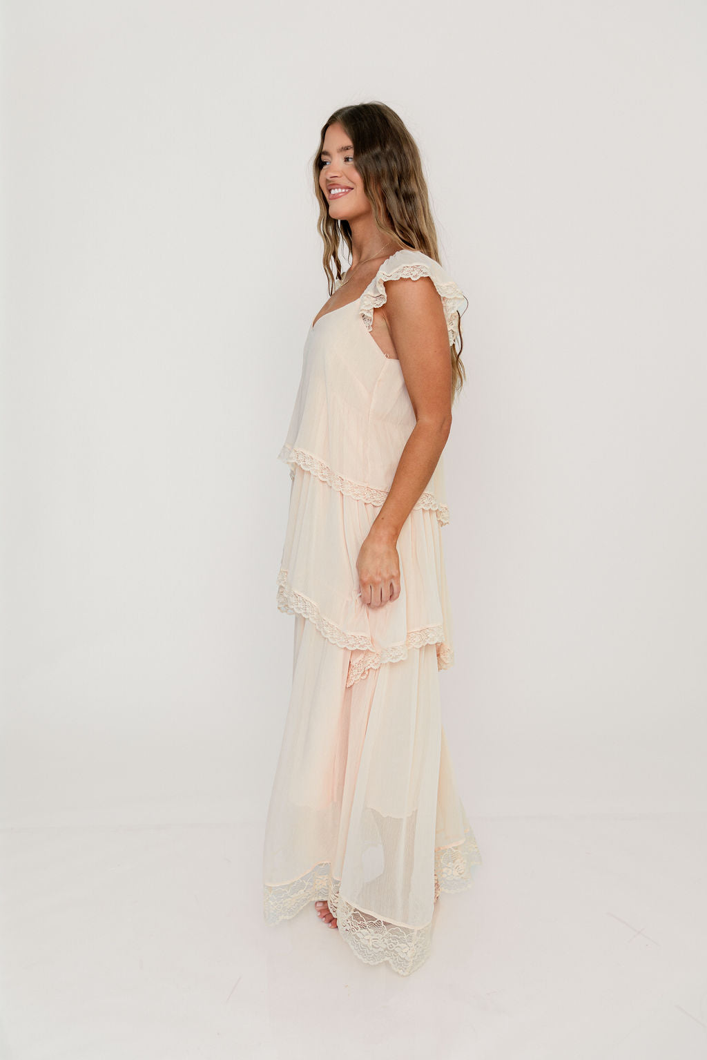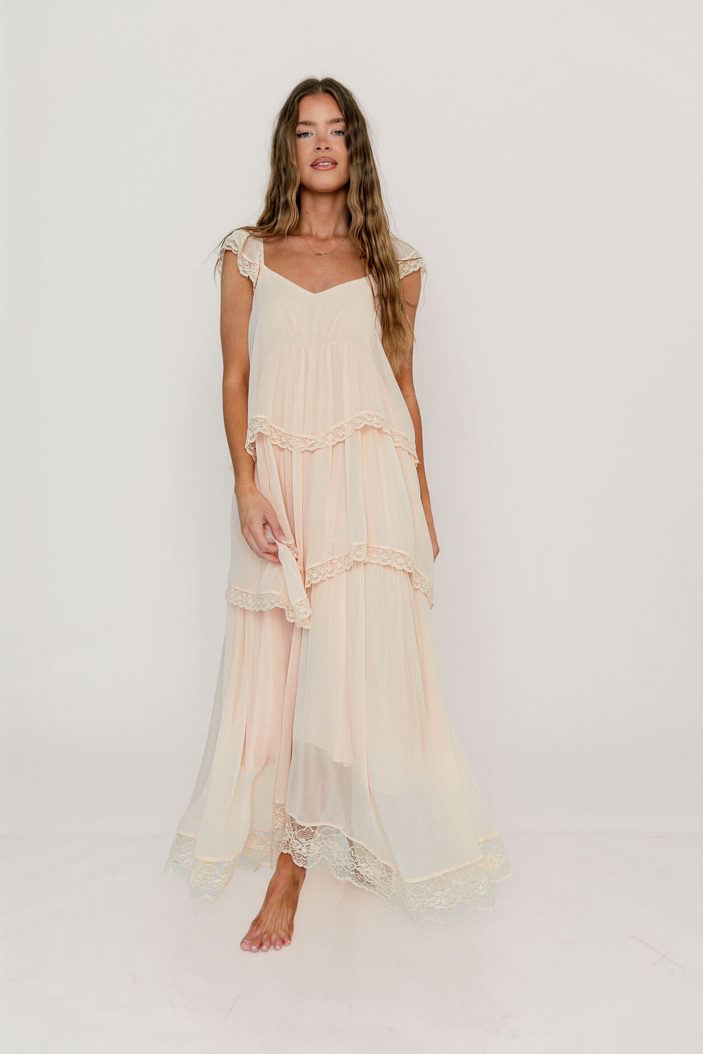 GARMENT DETAILS: Elegant, lightweight maxi dress with flattering sweetheart neckline, sheer cap sleeves, and an empire-waisted silhouette. Features a waterfall-style tiered design with lace-trim. Fully lined.
