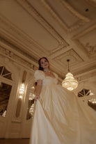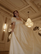 GARMENT DETAILS: Elegant, lightweight maxi dress with a flattering sweetheart neckline and front tie detail. Features short puffed sleeves, empire-waisted silhouette, and an open back with smocked panel. Finished with dual side pockets and delicate ruffle accents throughout.