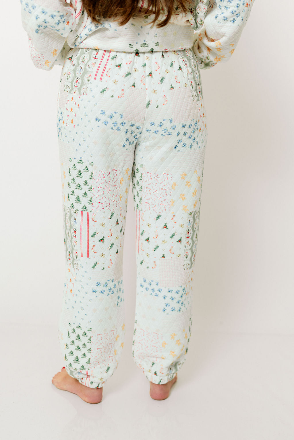 MATERIAL: Soft, relaxed-fit joggers in a pastel patchwork print with quilted design. Features an elasticated waist with drawstring, and cuffed legs.