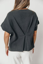 GARMENT DETAILS: Elegant knit cardigan top with rounded neckline, relaxed short sleeves, and a gathered back accent. Features a hidden front button placket with layered hem detail and ribbed edges.