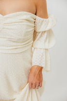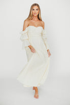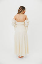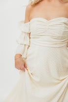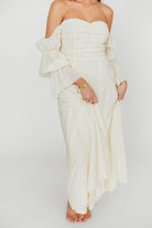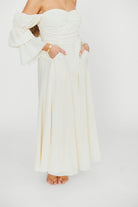 GARMENT DETAILS: Elegant maxi dress with ruched bodice and sweetheart neckline, with 3/4 length tiered Marie sleeves; neckline can be worn on or off the shoulder. Bodice features silicone tape. Features dual in-seam pockets and a textured, lightweight fabric. Lined.