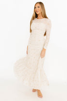 This elegant maxi manages to be both feminine and sleek, thanks to its combination of dainty florals and sheer mesh sleeves! The Camille is whimsical and lovely, a beautiful choice for any special occasion.