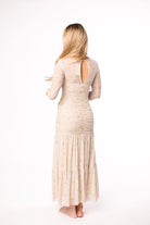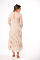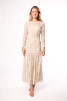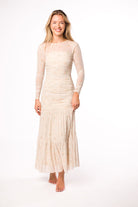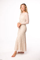 GARMENT DETAILS: Elegant fitted maxi dress with a high rounded neckline, long sleeves, and a dropped waist. Bodice features a sheer overlay, and skirt is multi-tiered and flowy.