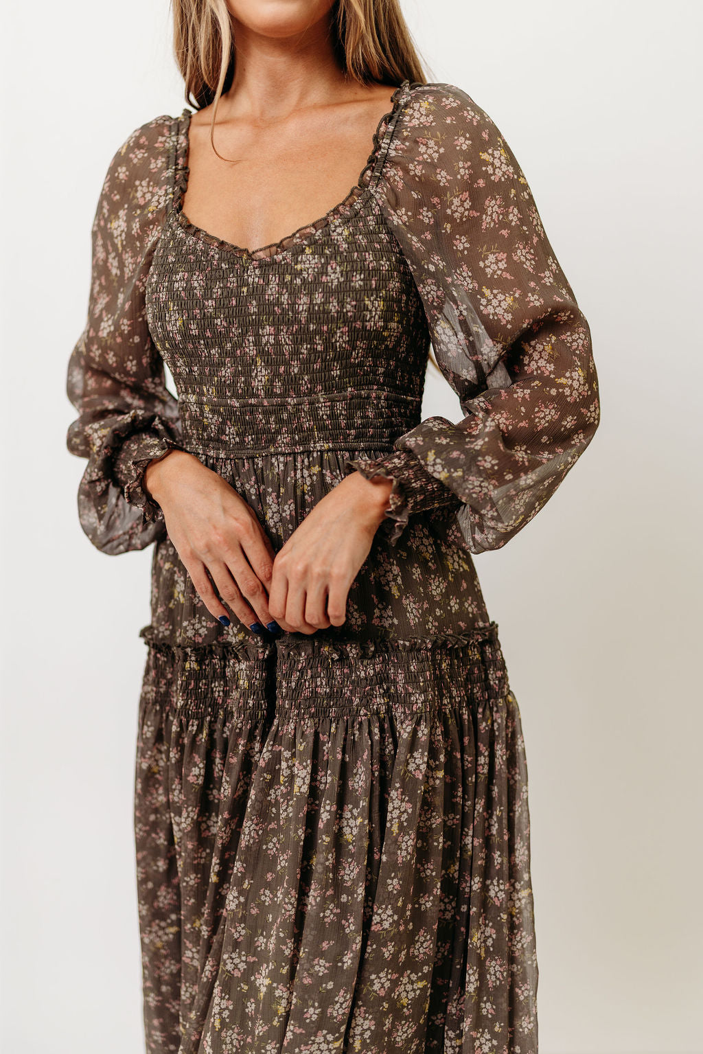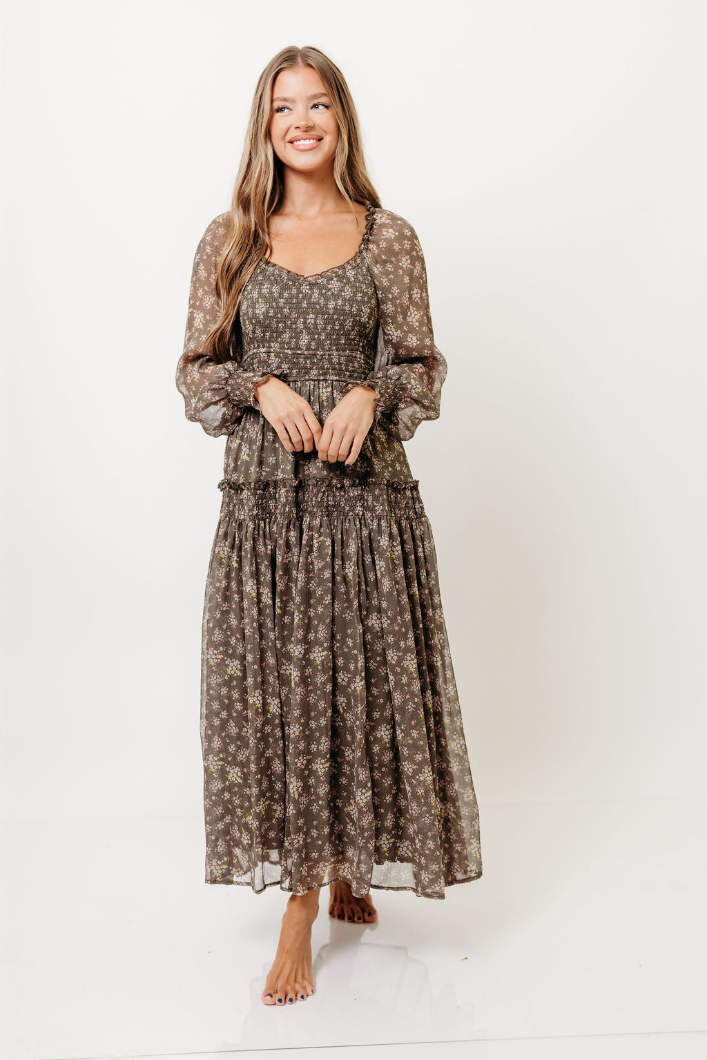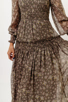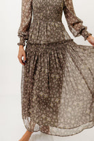 GARMENT DETAILS: Lightweight Yoru chiffon maxi dress with a subtle floral print, scooped neckline, and puffed long sleeves with elasticated cuffs. Features a fully smocked bodice, with flowy skirt and ruffled tier detail. Fully lined.