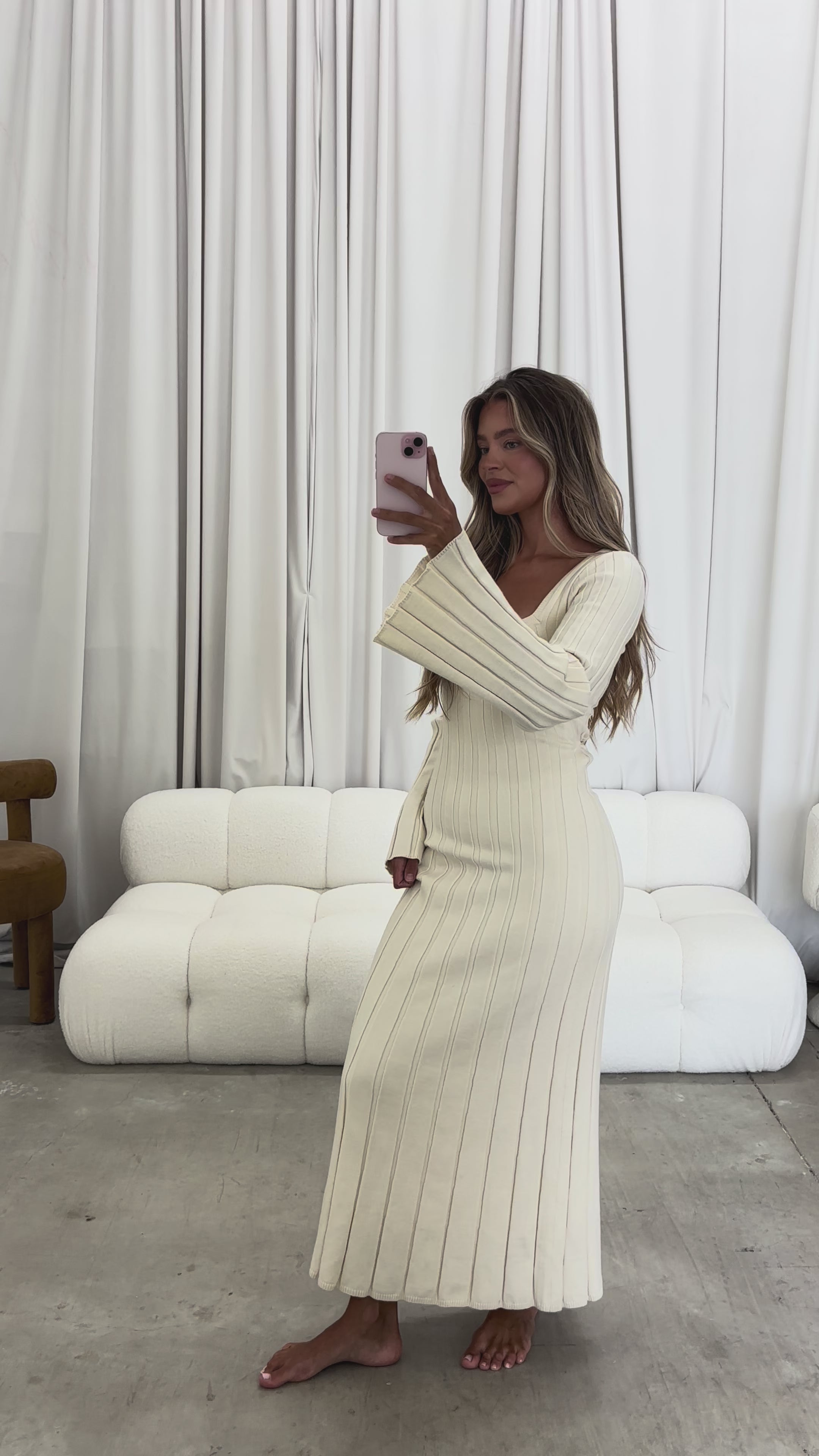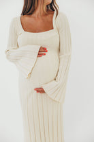 GARMENT DETAILS: Glamorous ribbed knit maxi dress with flattering square neckline, long flared sleeves, and a feminine fit-and-flare silhouette. Buttercream and Cream colorways are fully lined.