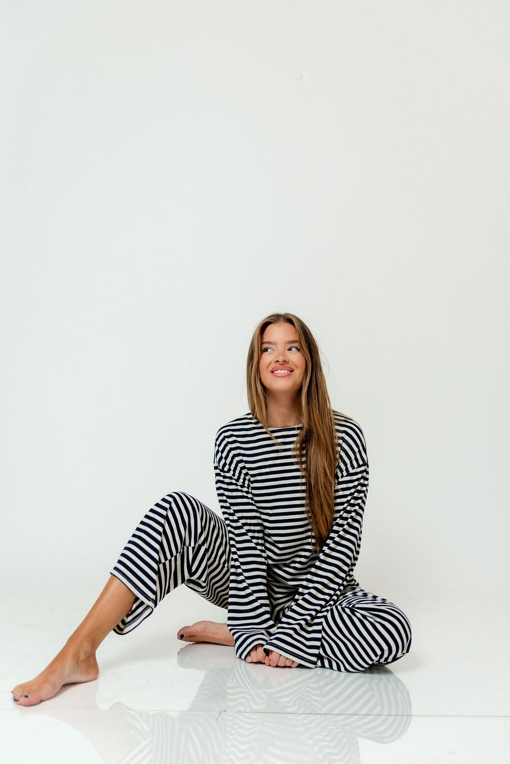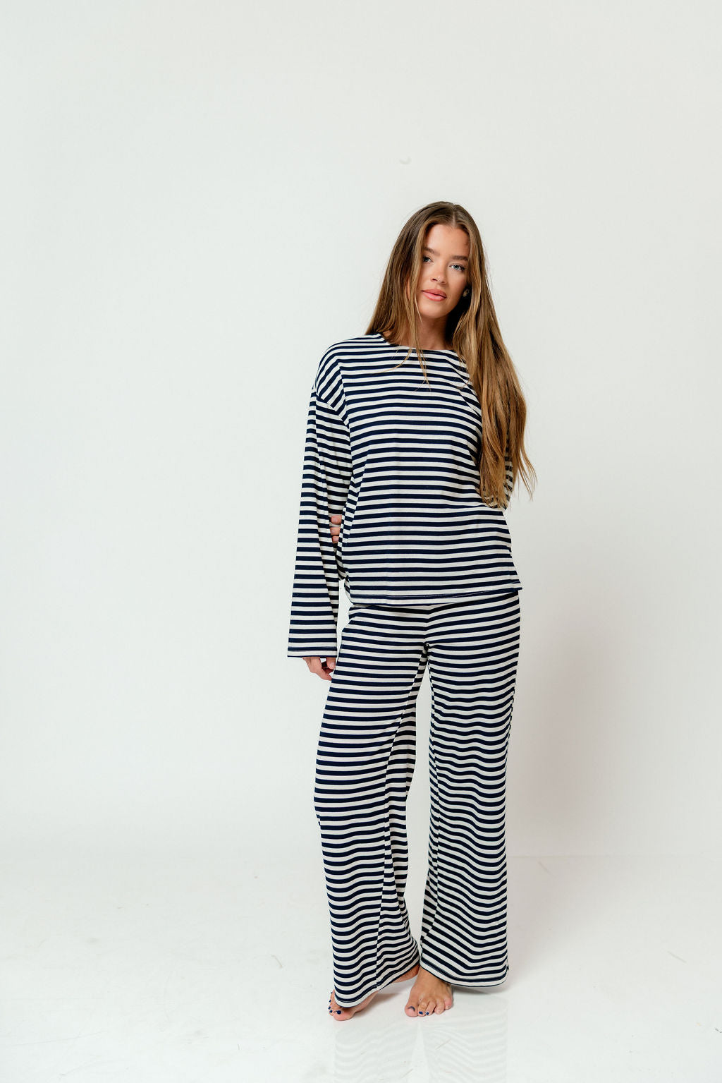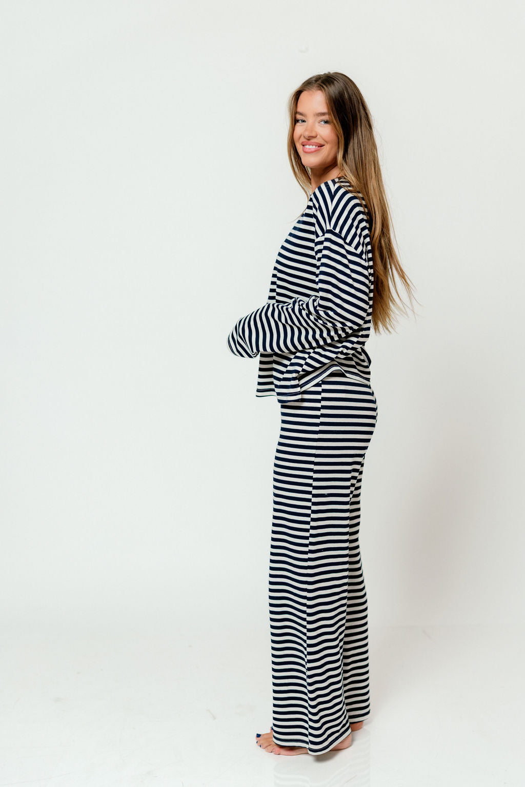 These fresh stripes from Things Between are everything you're looking for in leisurewear this season! With an ultra-soft construction and classic navy and white pattern, the Elaine Striped Top is laid-back but still chic--just the right vibe for your holidays.