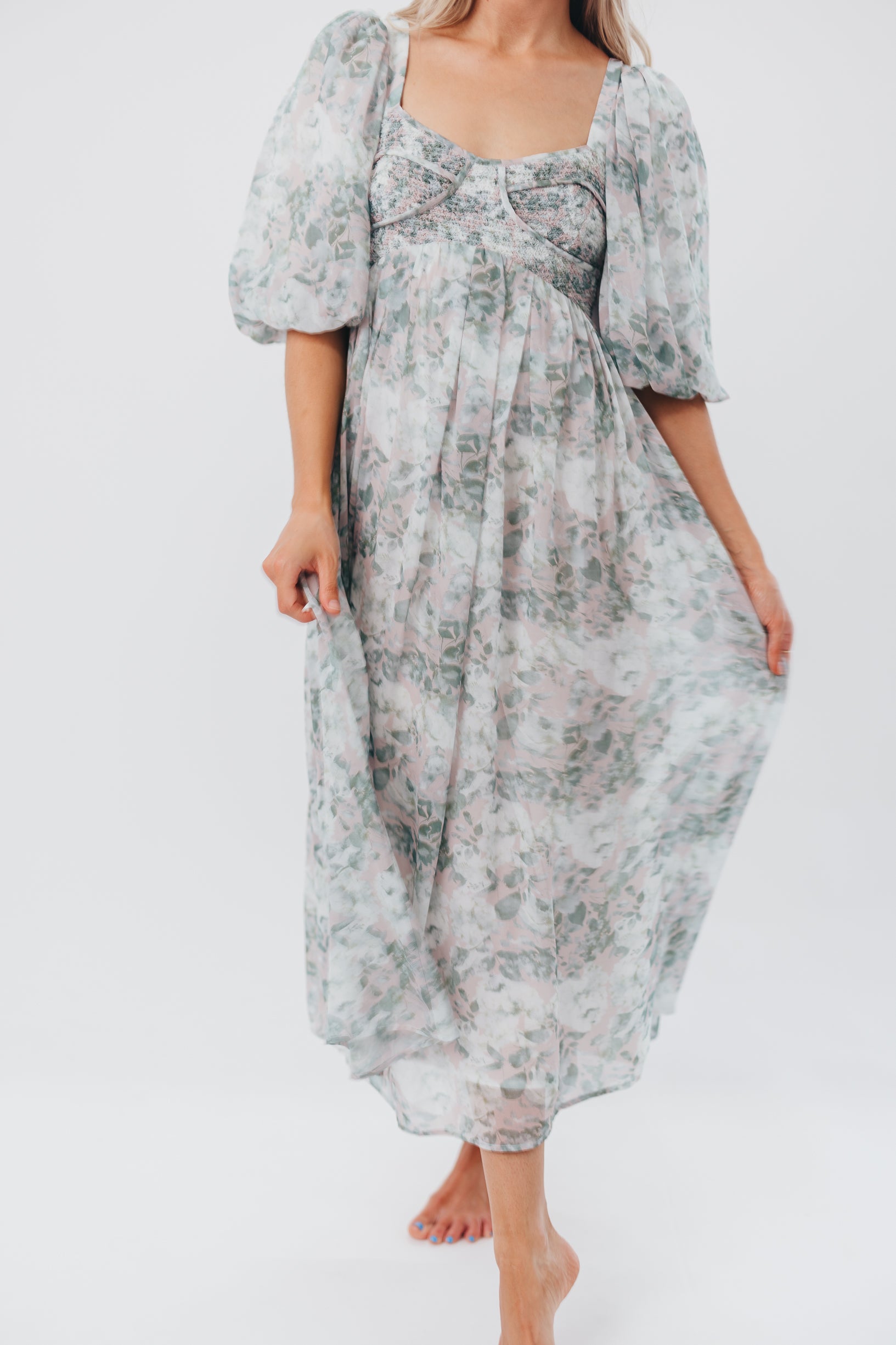 GARMENT DETAILS: Lightweight maxi in a floral print. Features an empire waist silhouette and structured bustier-style bodice, with smocking in the back. Finished with statement puffed sleeves, voluminous skirt, and back zipper. Lined.