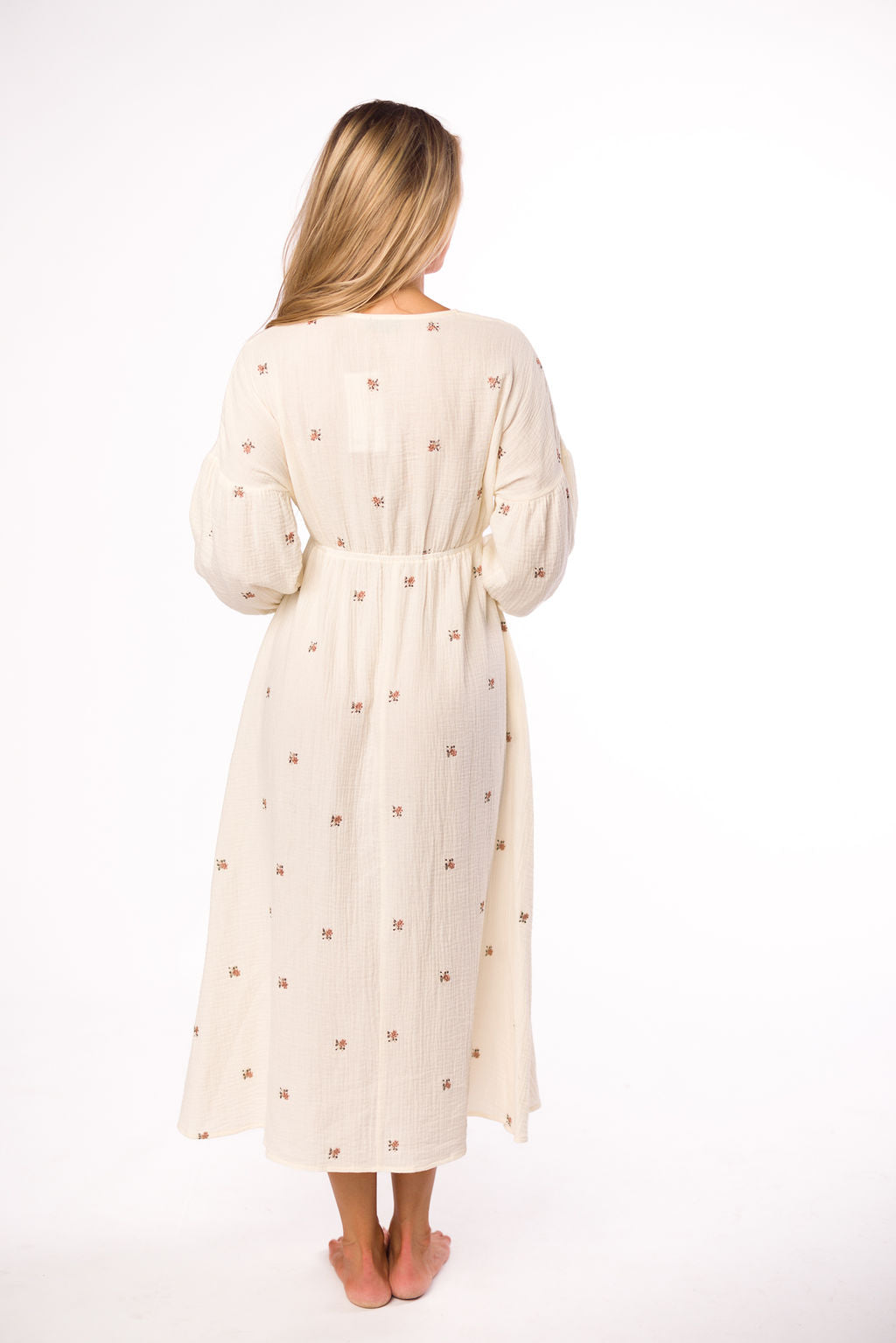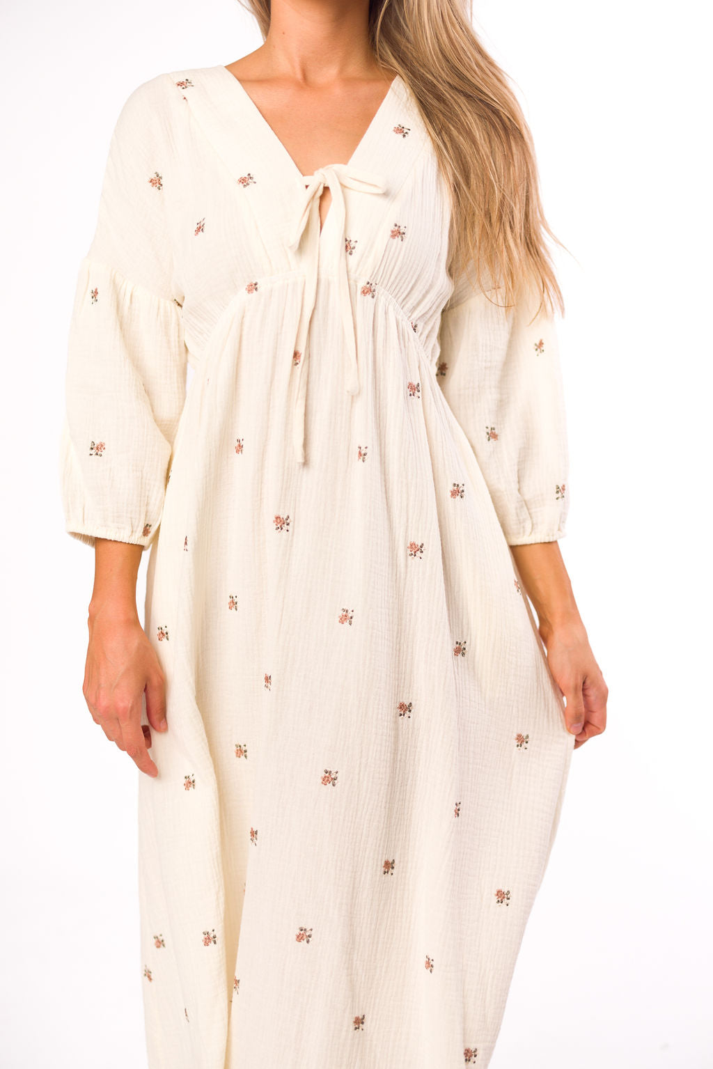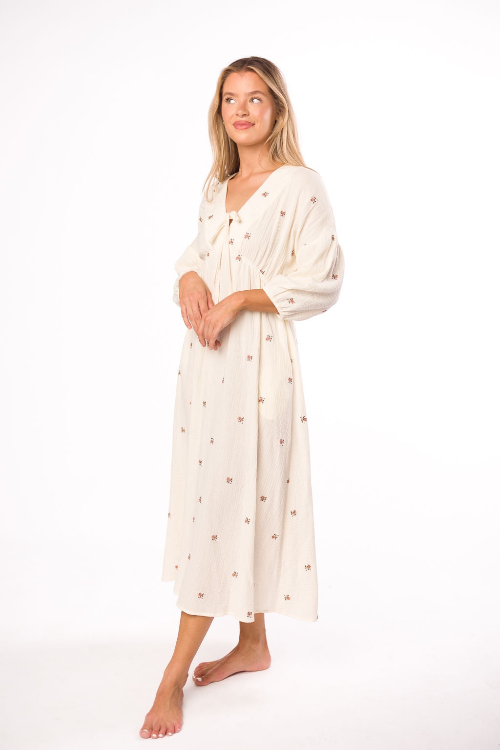 GARMENT DETAILS: Lightweight cotton gauze midi dress. Features V-neckline with self-tie detail, inverted empire waist, and full skirt with in-seam pockets. Finished with long balloon sleeves. No lining.