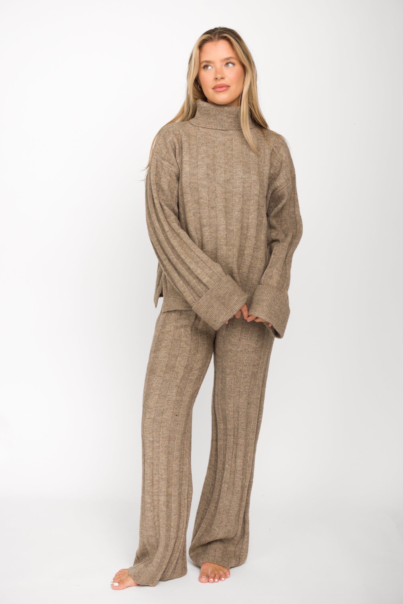 GARMENT DETAILS: Cozy knit sweater set in a thick ribbed knit material. Top features a chunky turtleneck and long sleeves; pants feature an elasticated waistband and wide-leg silhouette.