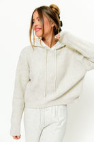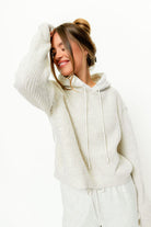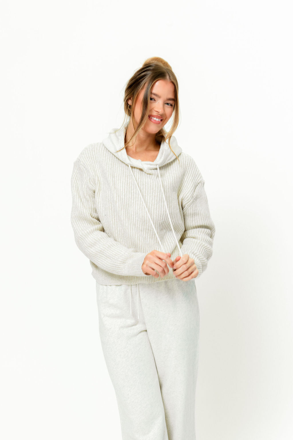 GARMENT DETAILS: Mixed knit hoodie and pants set. Top features an attached hood and drawstring detail; pants feature a slouchy, relaxed fit with pull-on elastic waistband.