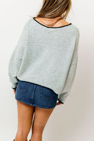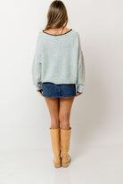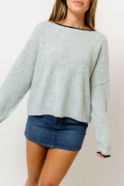 GARMENT DETAILS: Cozy knit sweater with dropped shoulders, relaxed fit, and soft boatneck. Features exposed seams and contrast color trim.