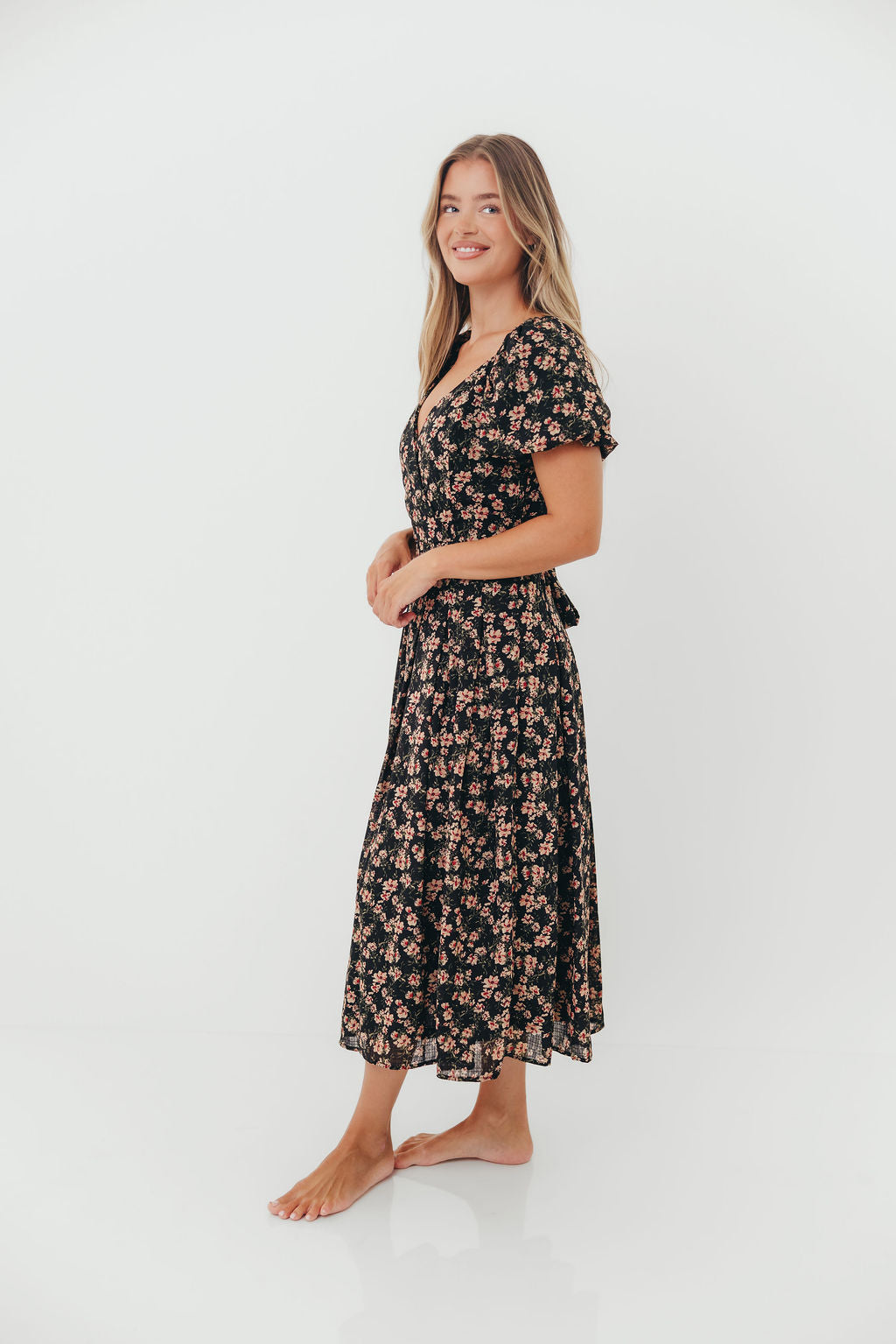 Drift into fall with the Milania Midi Dress, the newest addition to the Dress Shoppe! This elegant floral gown offers a stunning faux-wrapped bodice with plunging V-neck, plus an adjustable back tie to highlight your curves. Style this gown with white booties or your favorite heels for an unforgettable outfit!