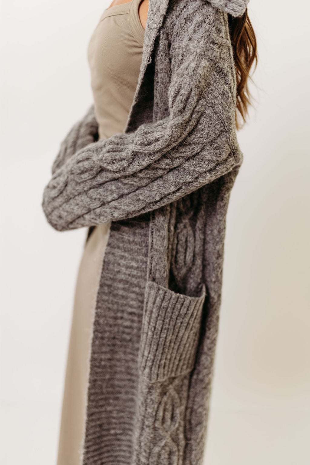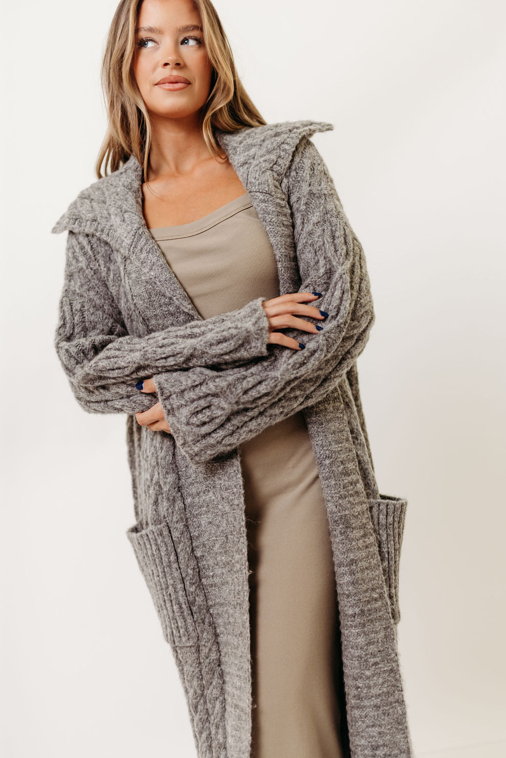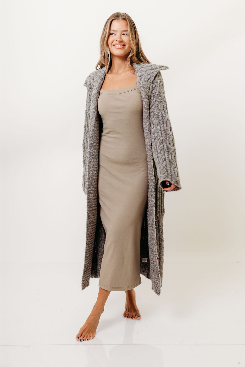 Amina Ribbed Knit Long Cardigan Jacket in Light Taupe