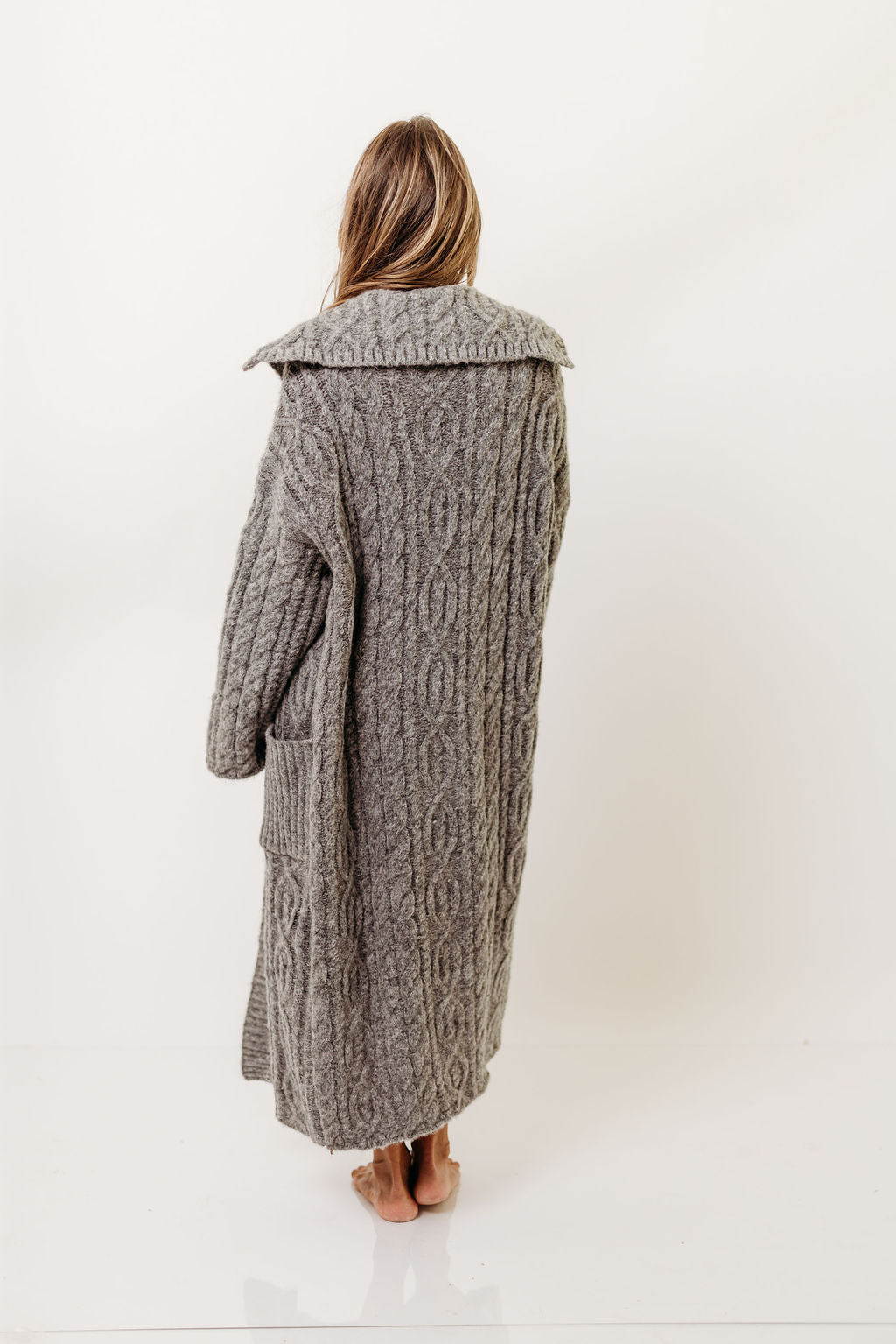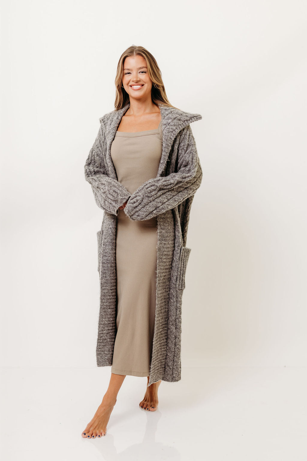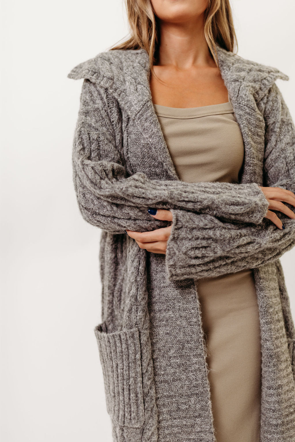 Amina Ribbed Knit Long Cardigan Jacket in Light Taupe