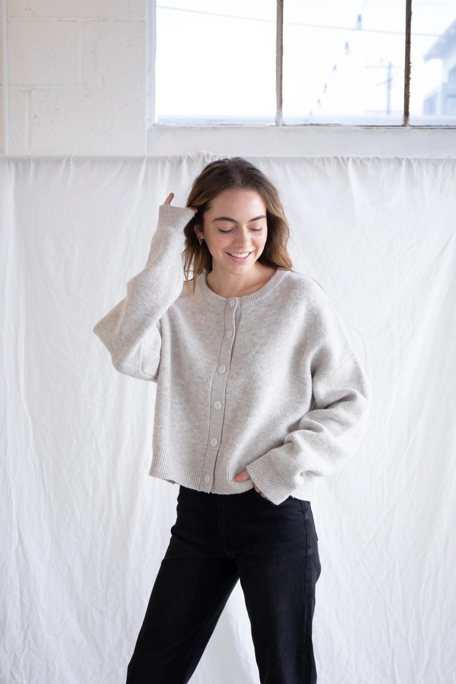 GARMENT DETAILS: Cozy knit cardigan, with rounded neckline, dropped shoulders, and long sleeves. Features front button placket and gentle crop.