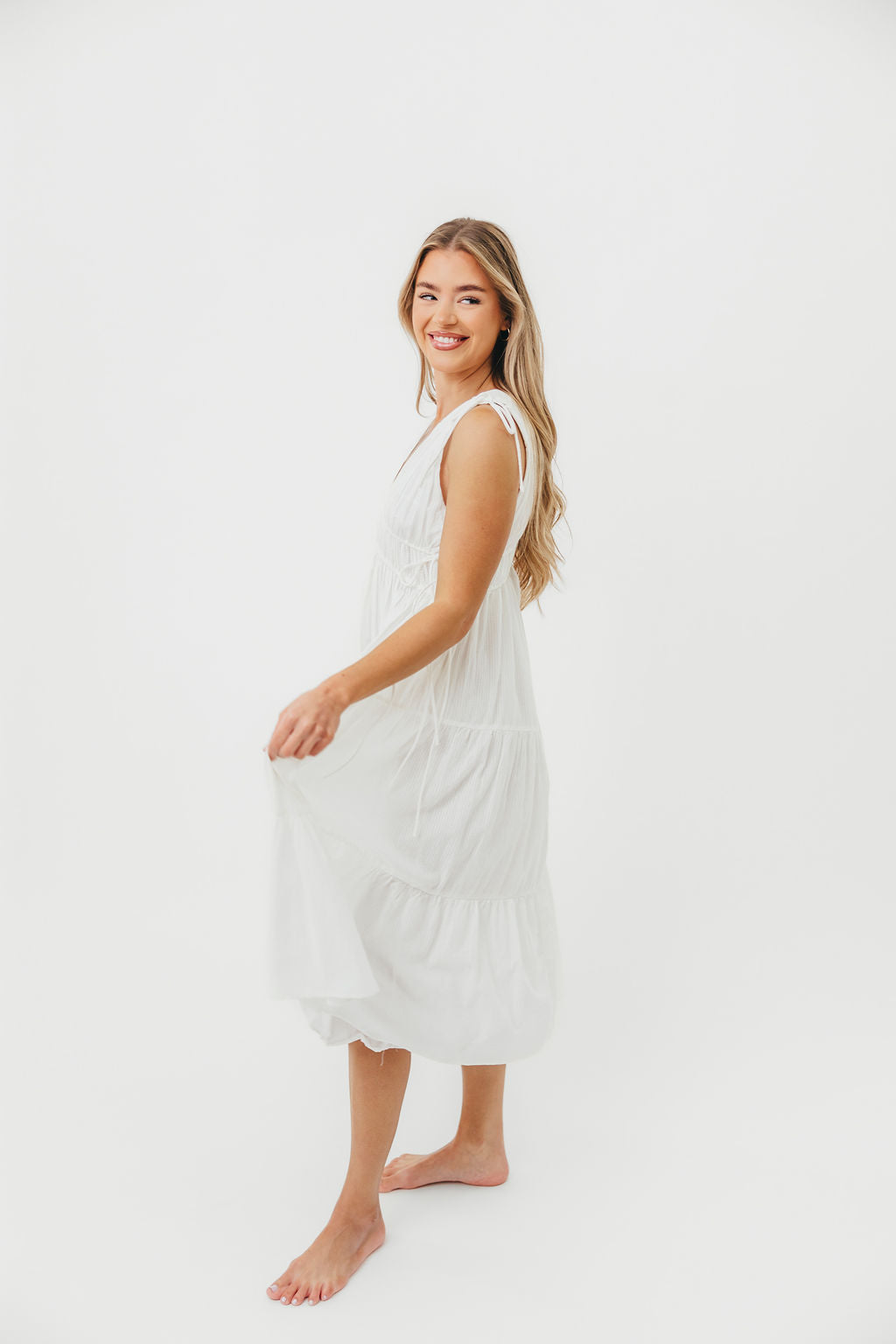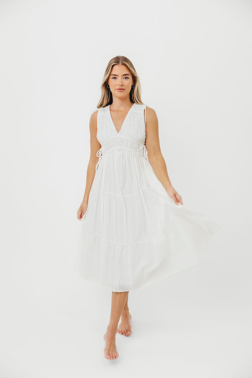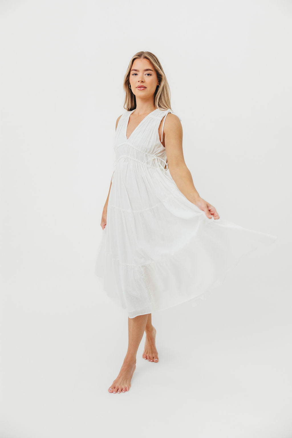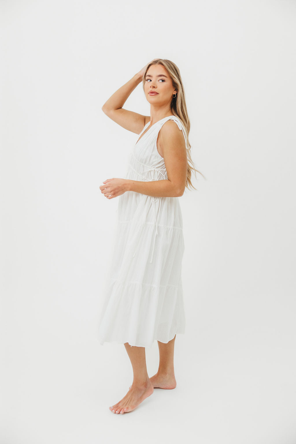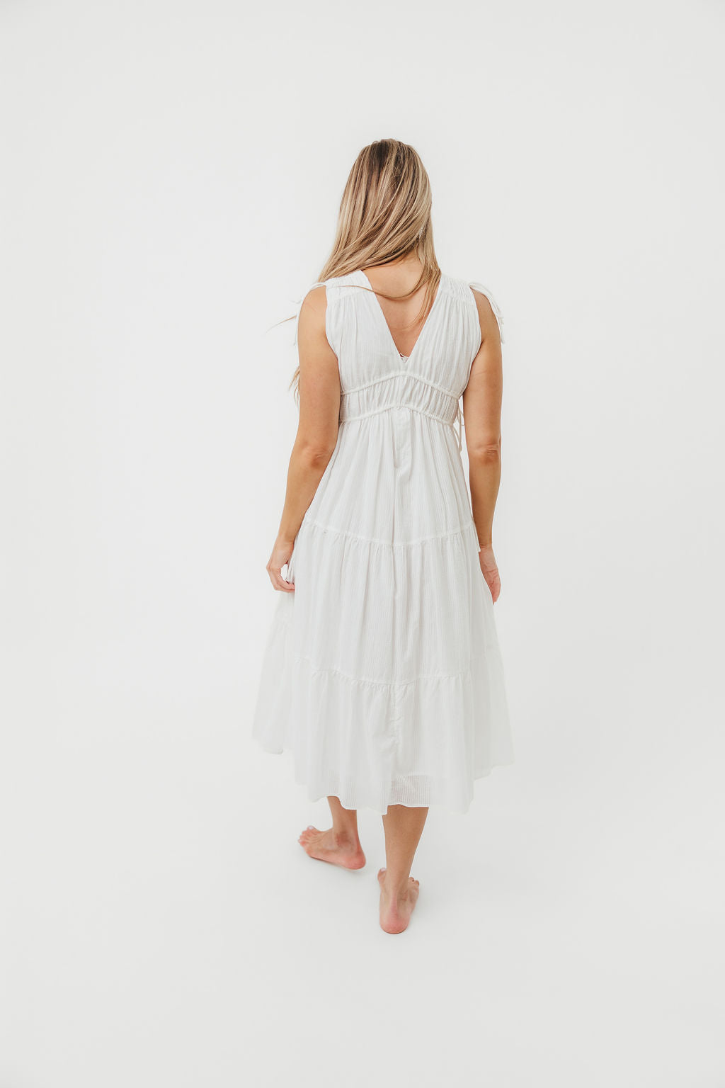 GARMENT DETAILS: Lightweight cotton midi dress with V-neckline with a tiered bodice and adjustable ties at the shoulders and waist. Finished with a tiered skirt and full lining.