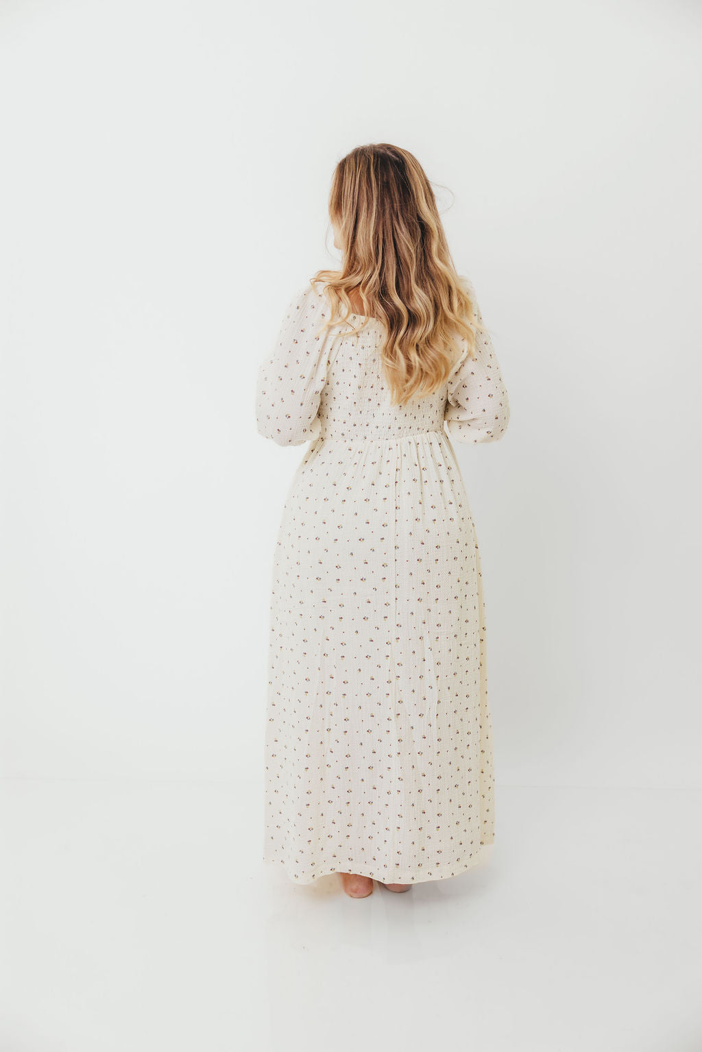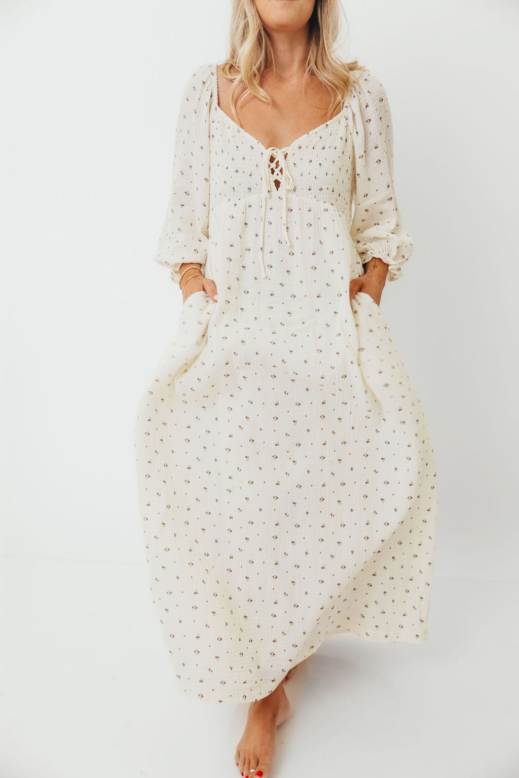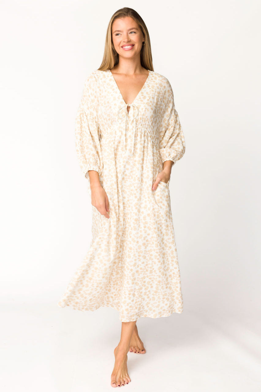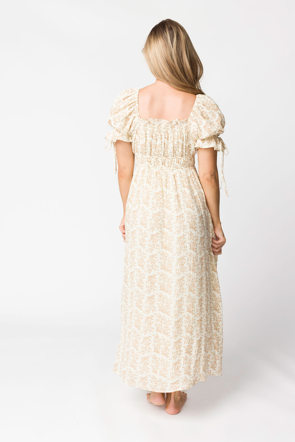 Hunter 100% Cotton Gauze Midi Dress in Natural/Fawn Floral - Bump Friendly