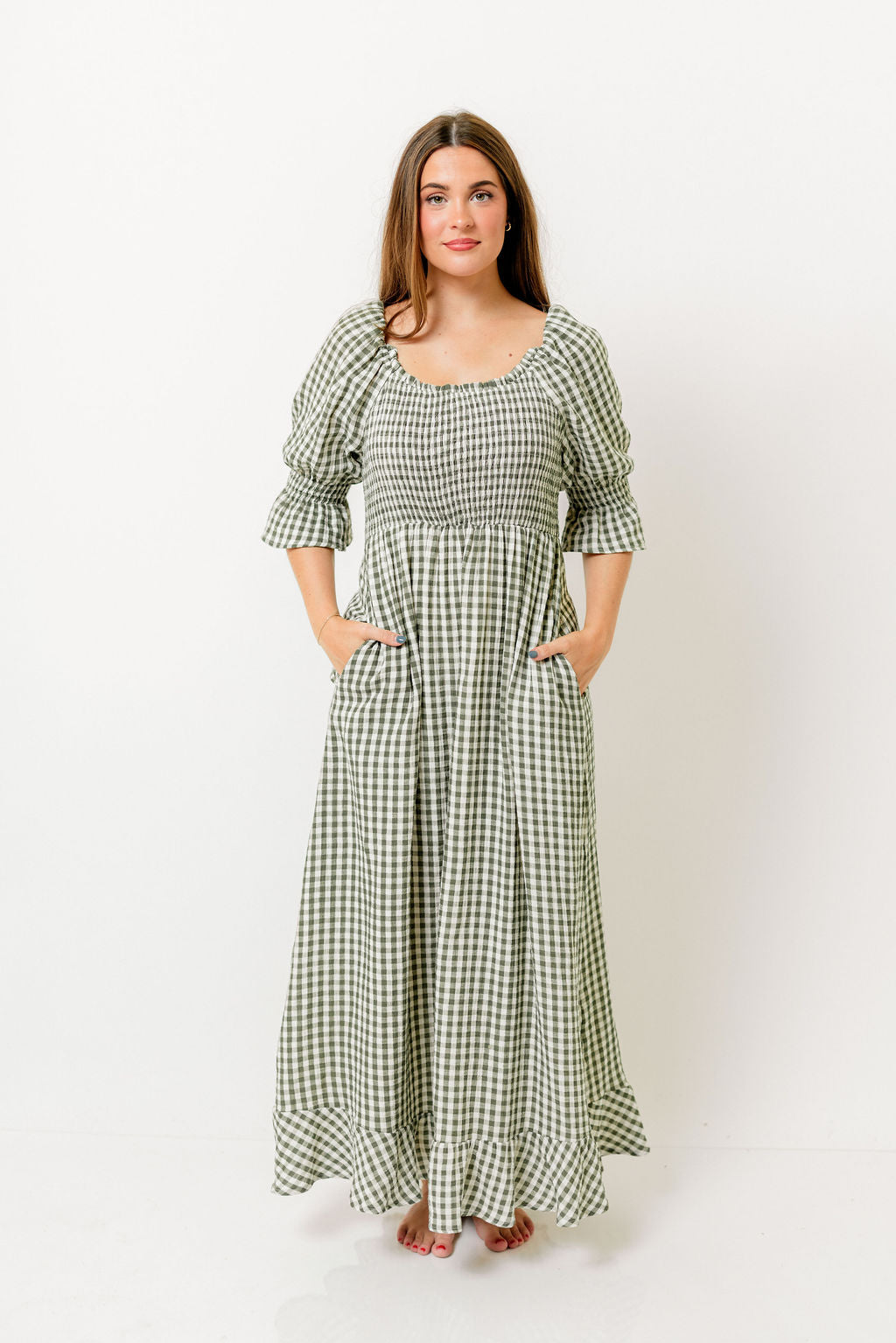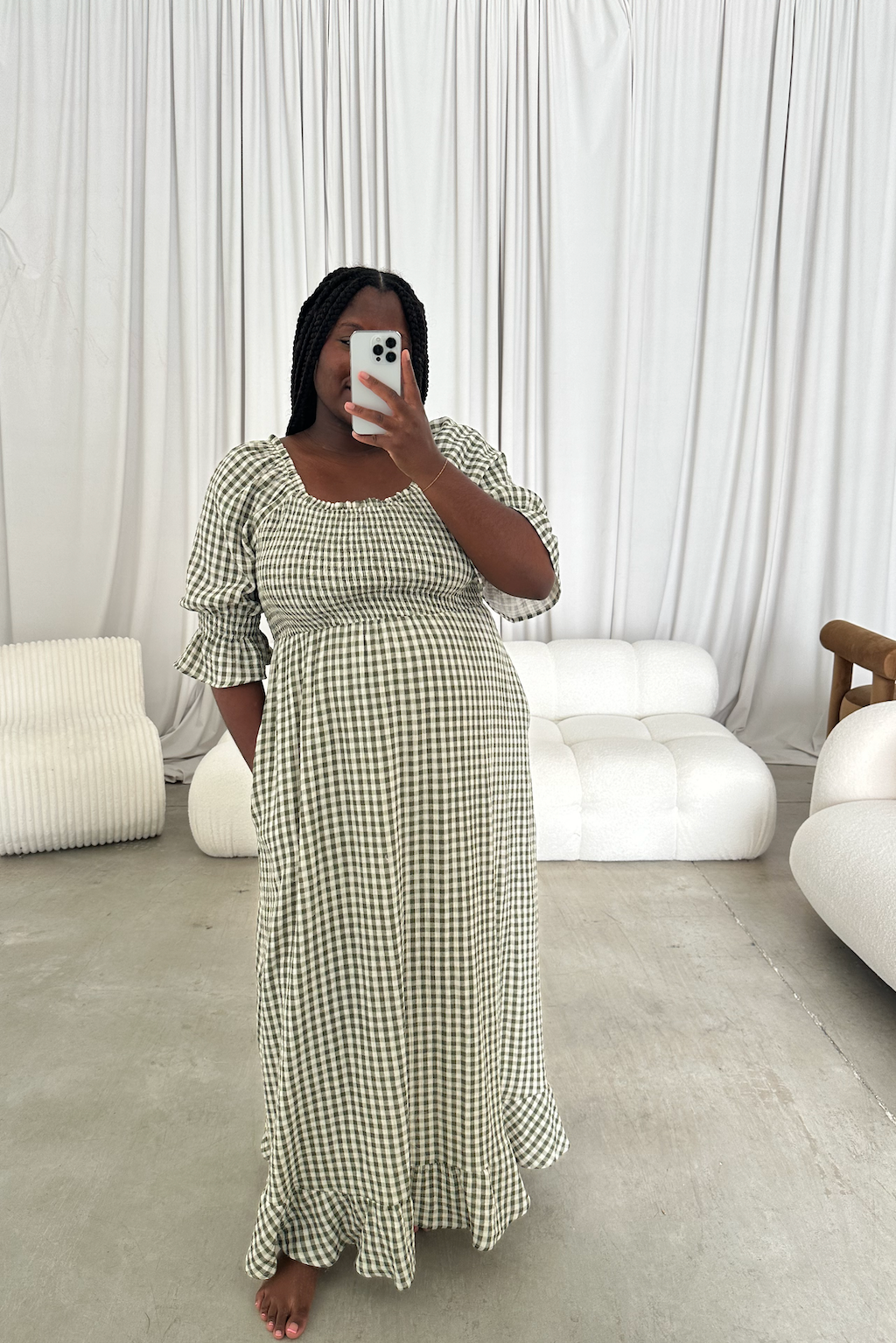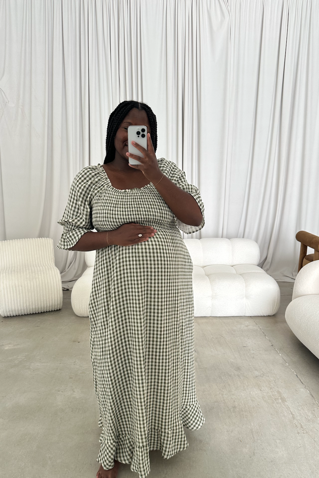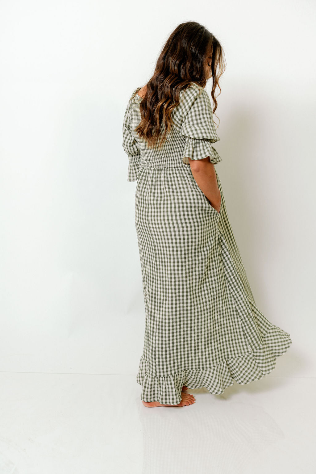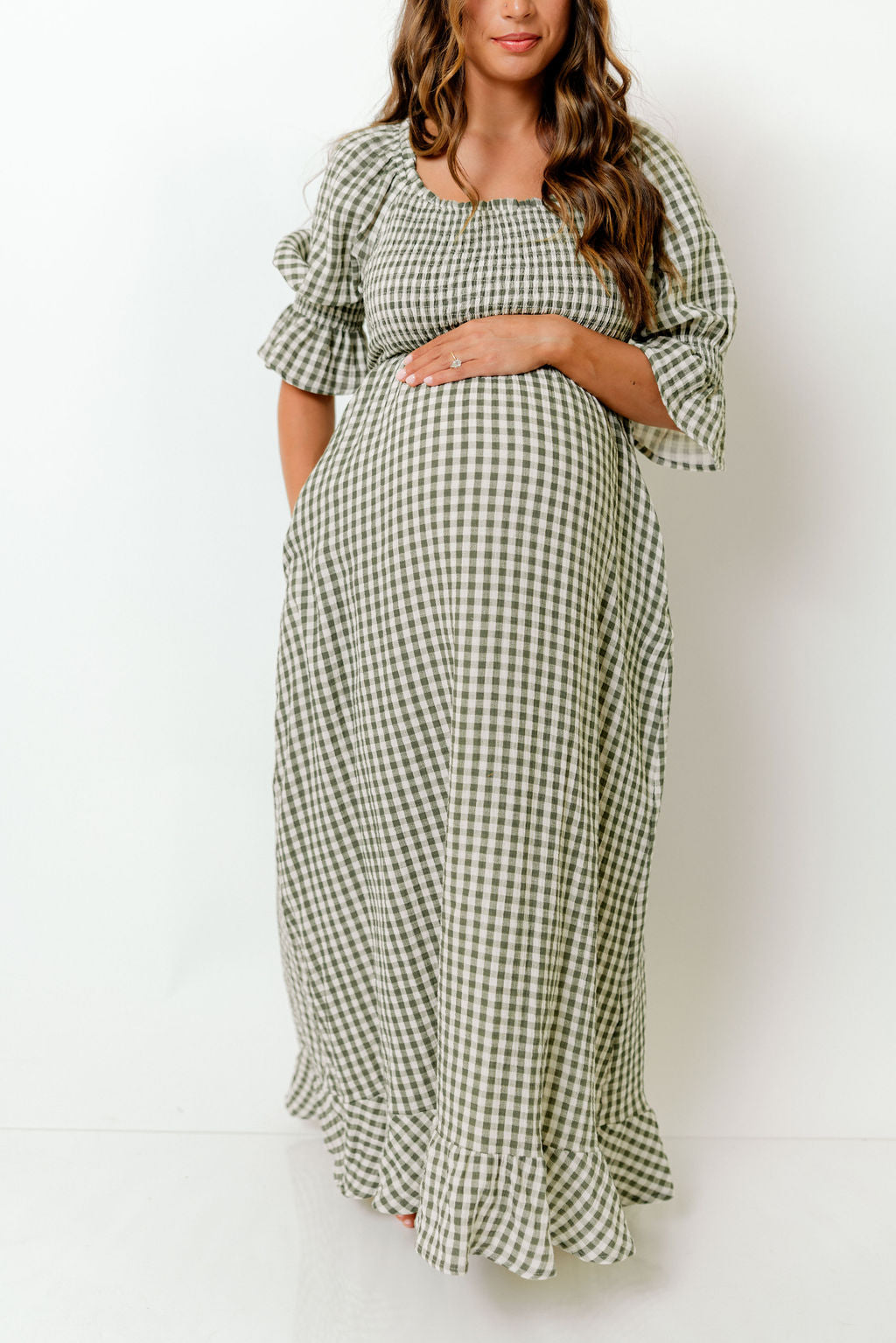 Sienna 100% Cotton Puff Sleeve Maxi Dress in Forest Plaid - Bump Friendly