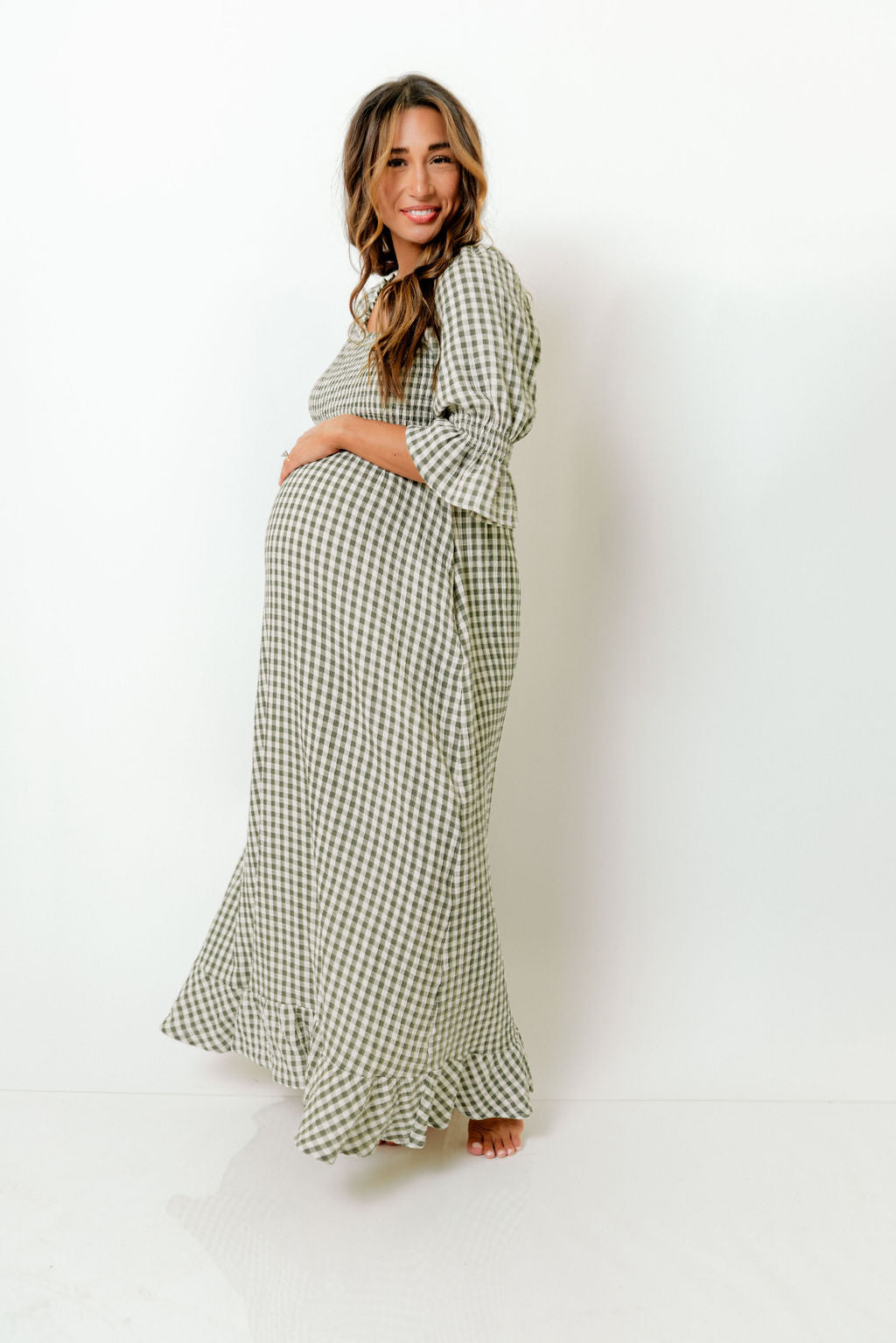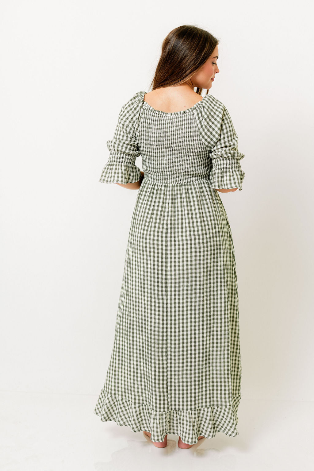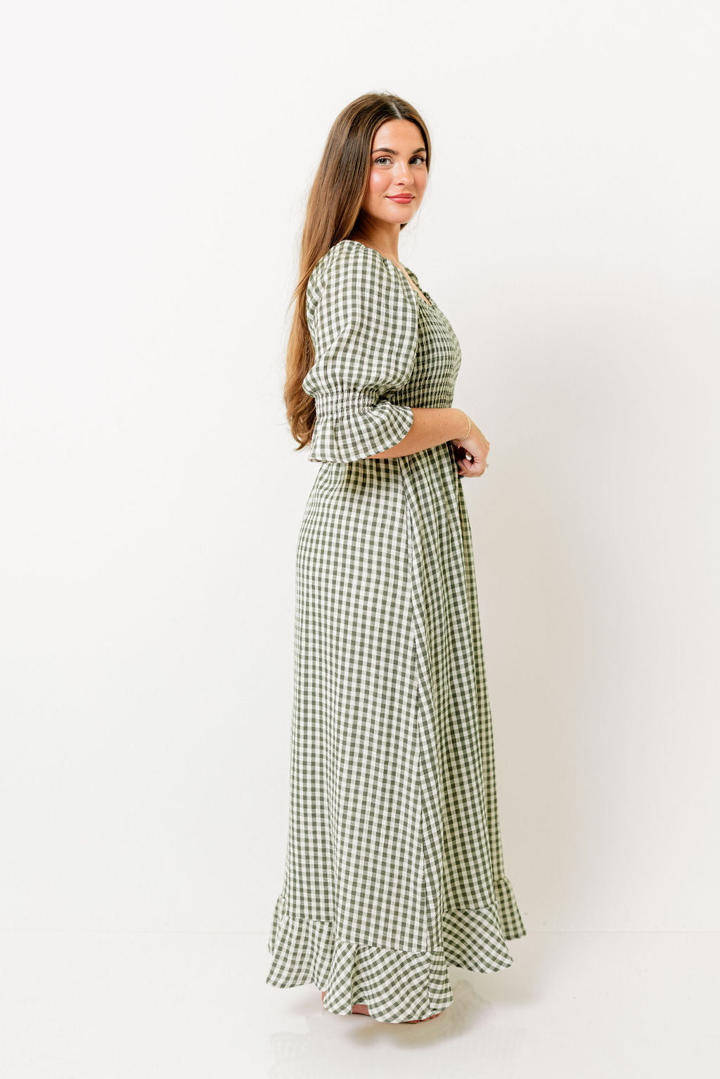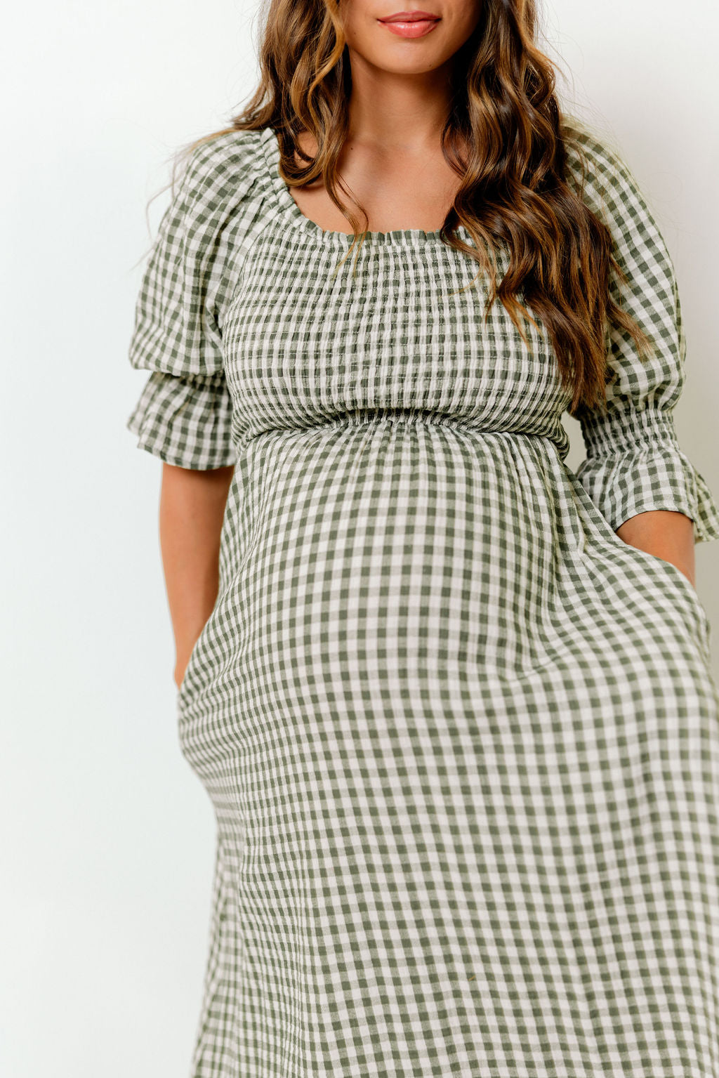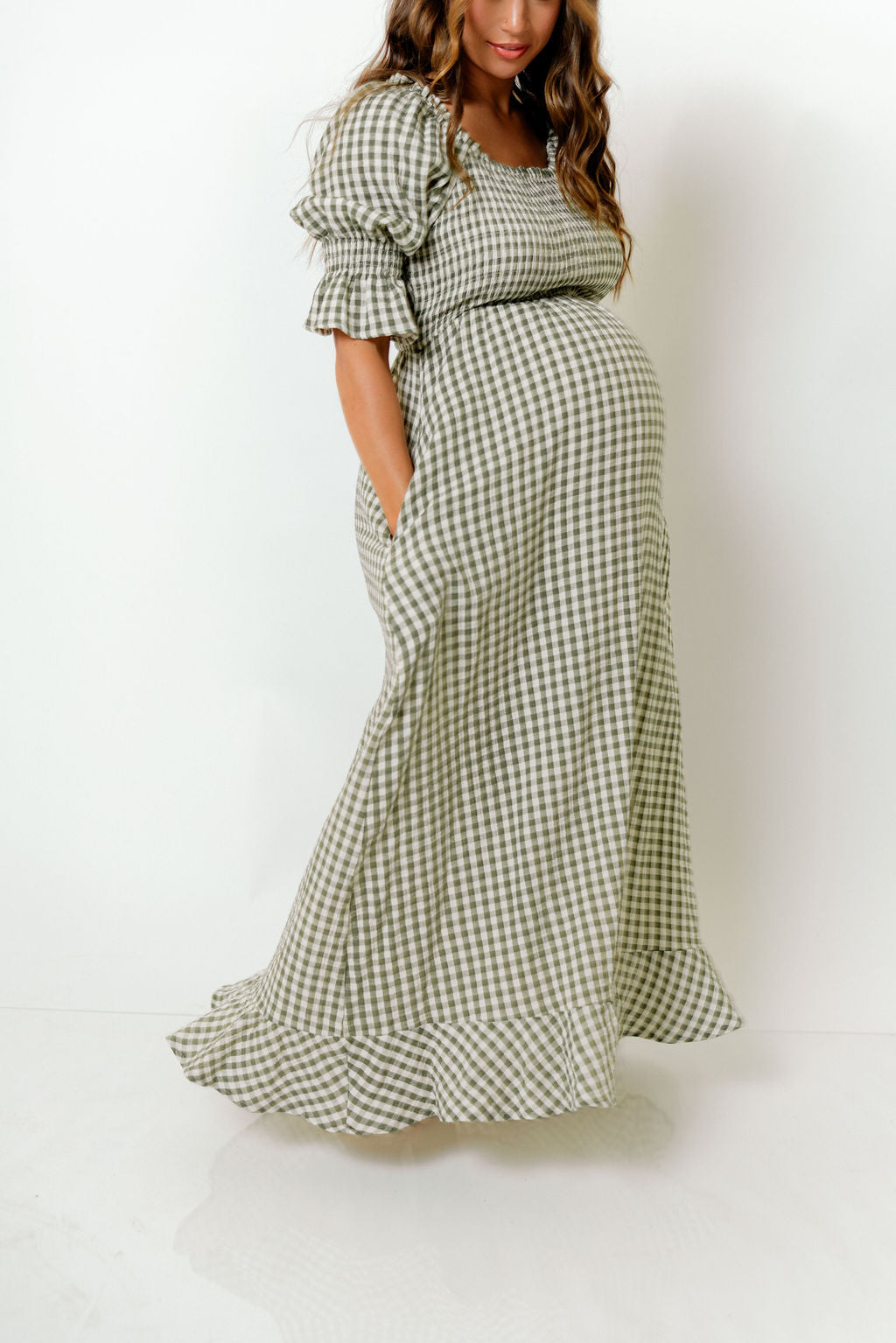 Sienna 100% Cotton Puff Sleeve Maxi Dress in Forest Plaid - Bump Friendly