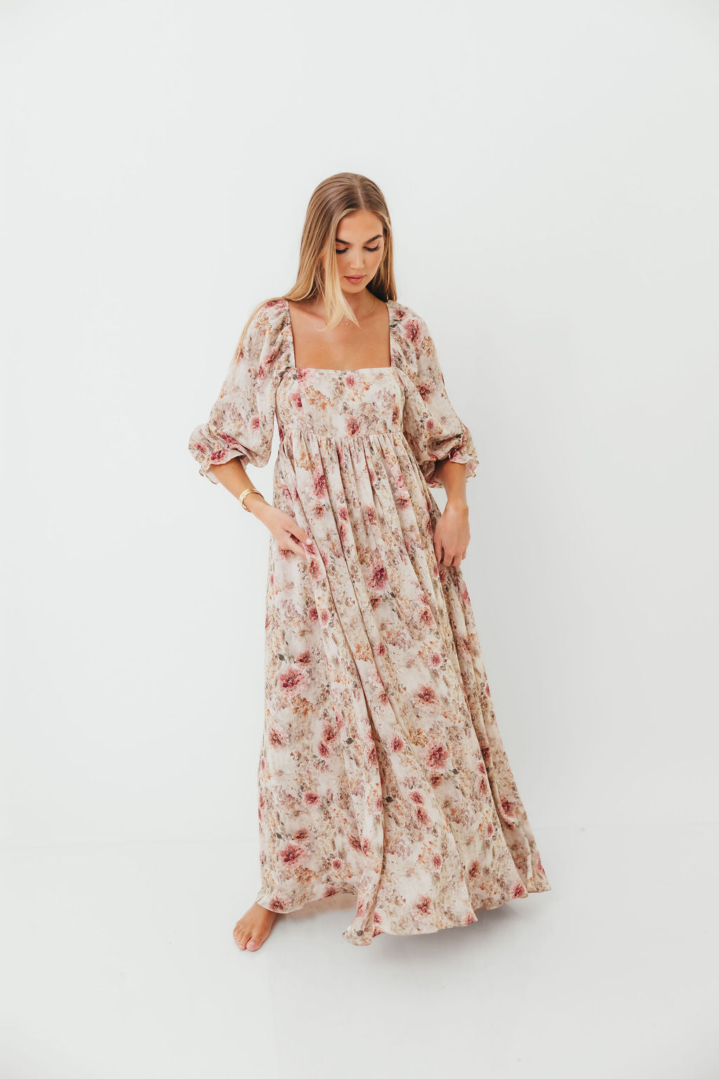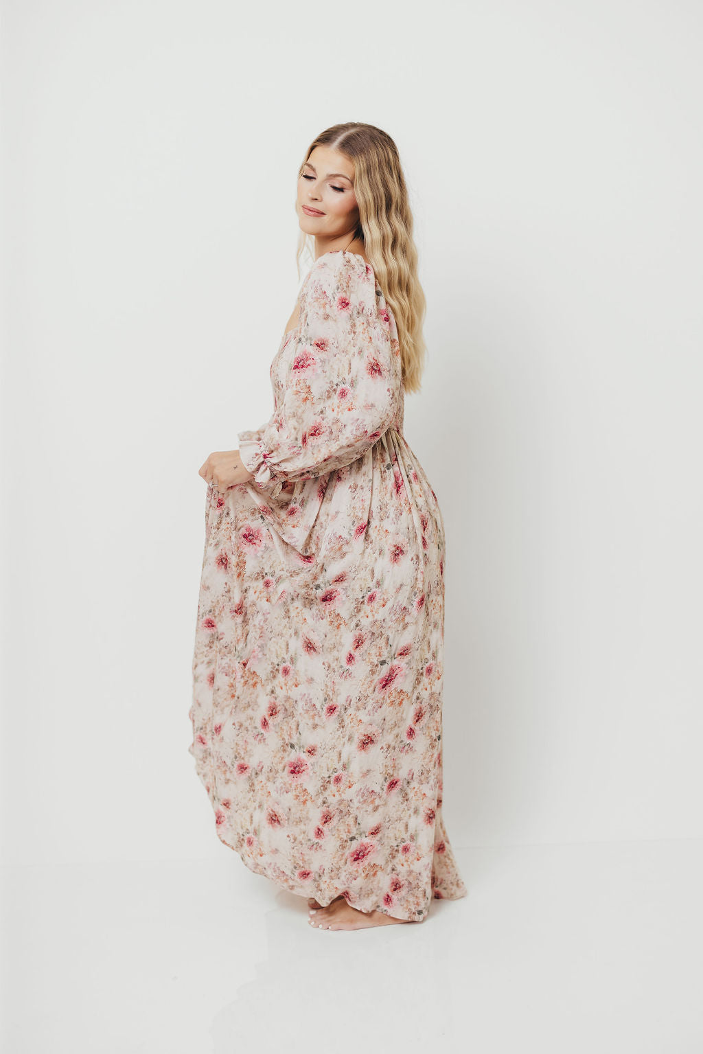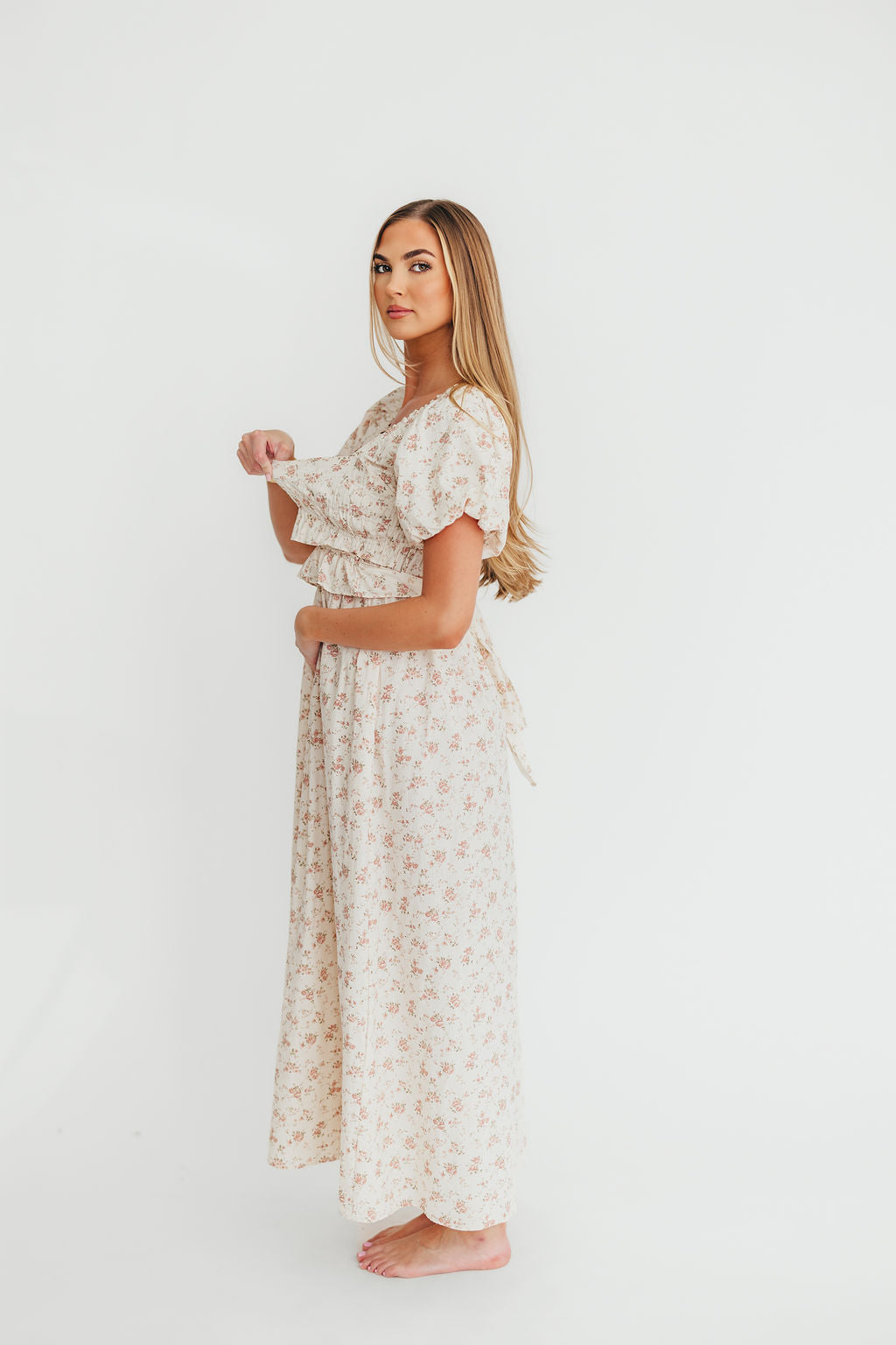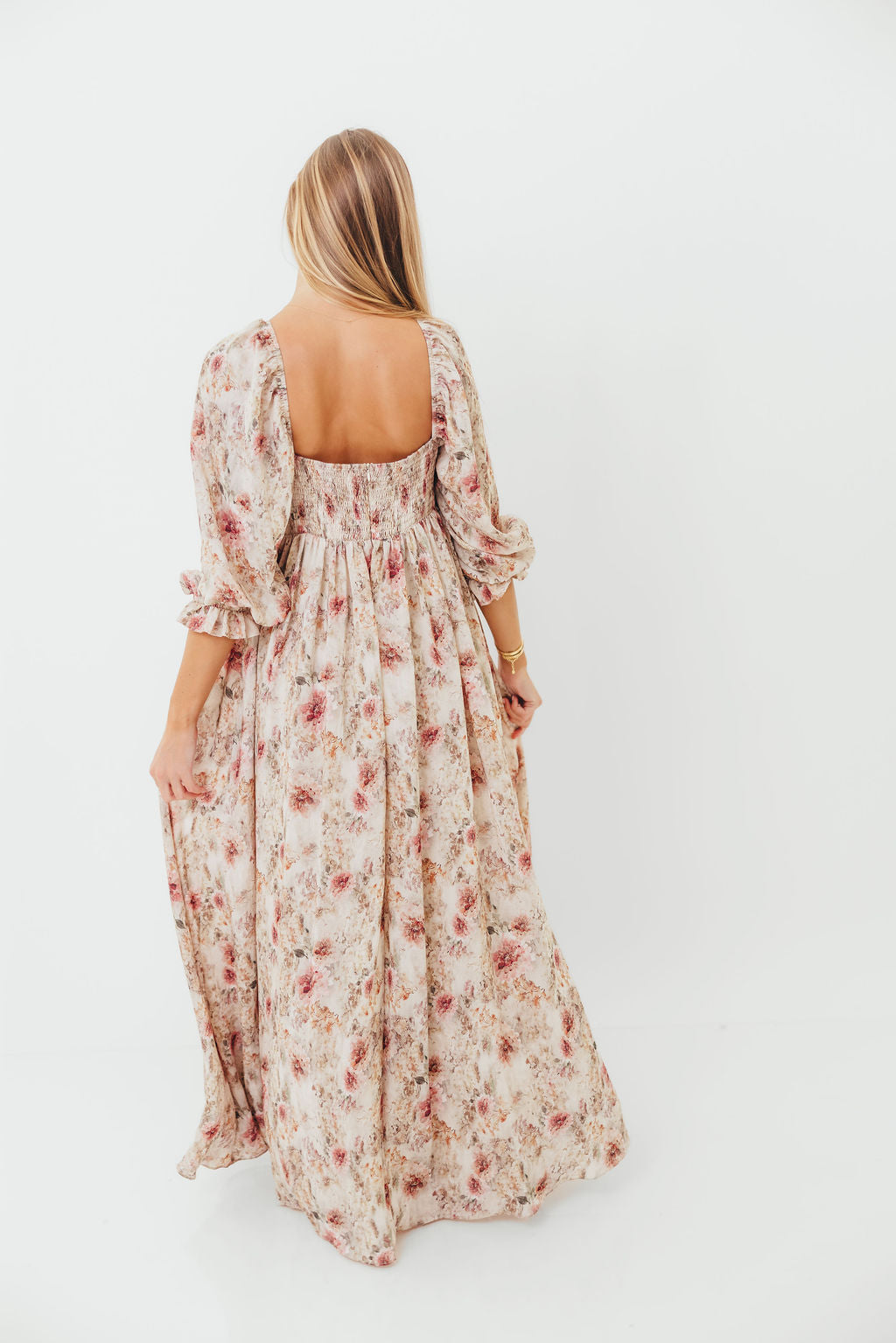 Mona Maxi Dress with Smocking in Pink/Beige Multi Floral - Bump Friendly