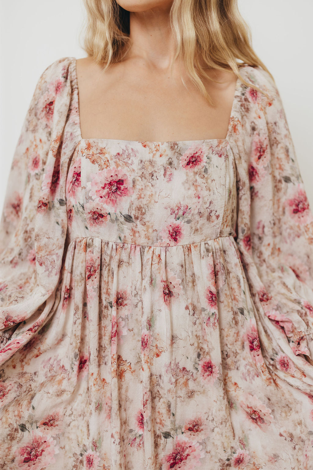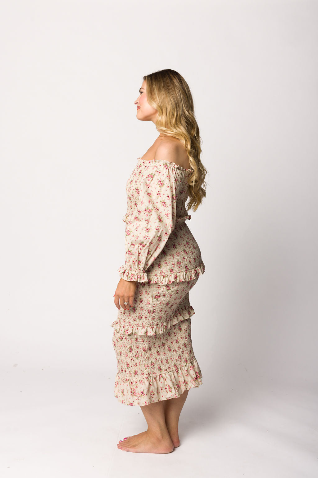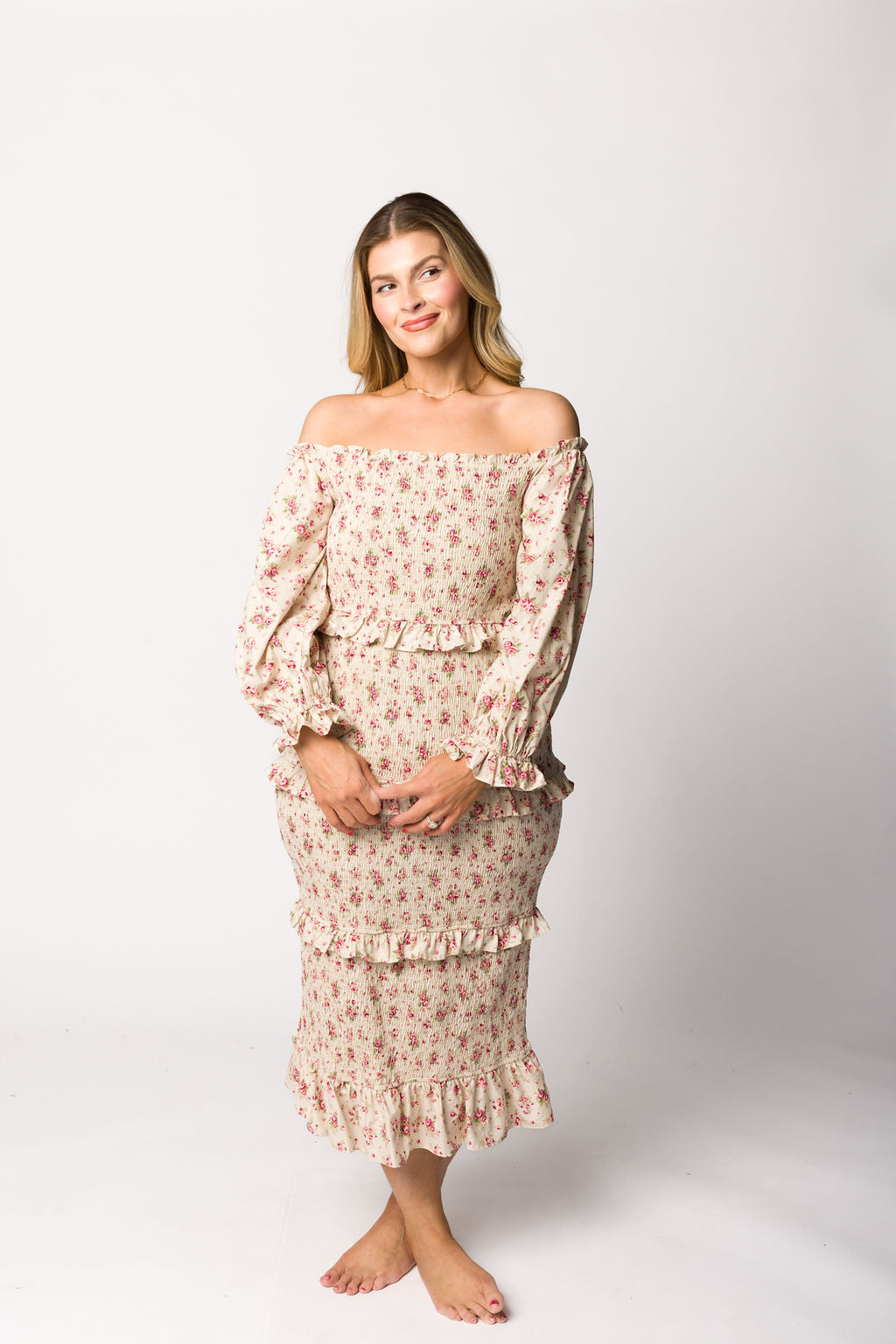 Mona Maxi Dress with Smocking in Pink/Beige Multi Floral - Bump Friendly