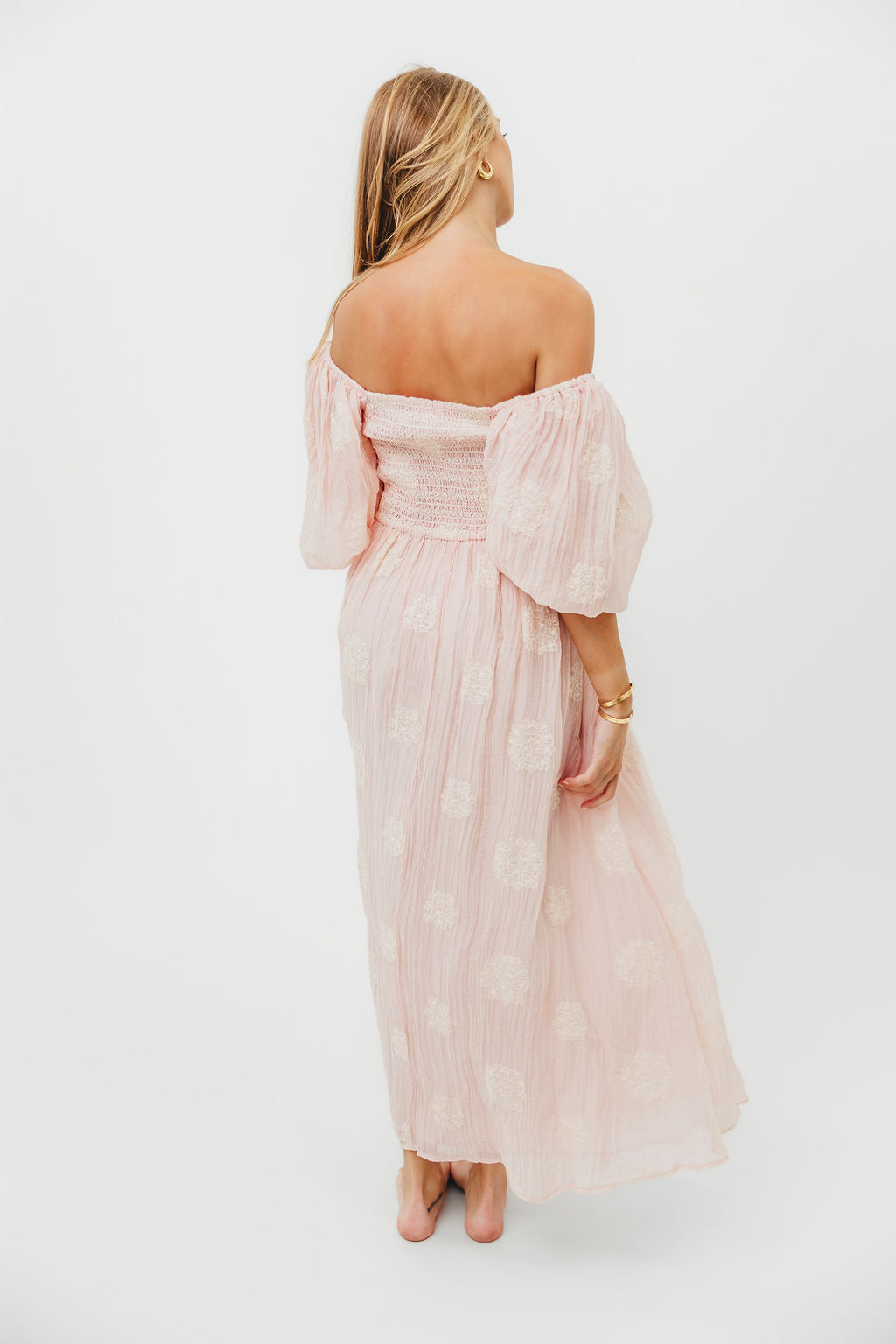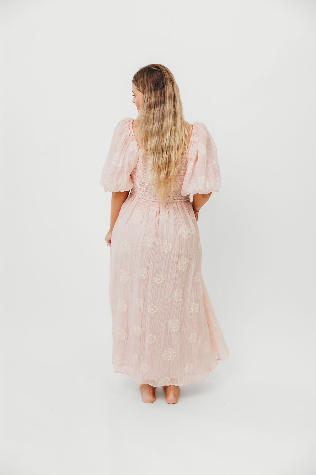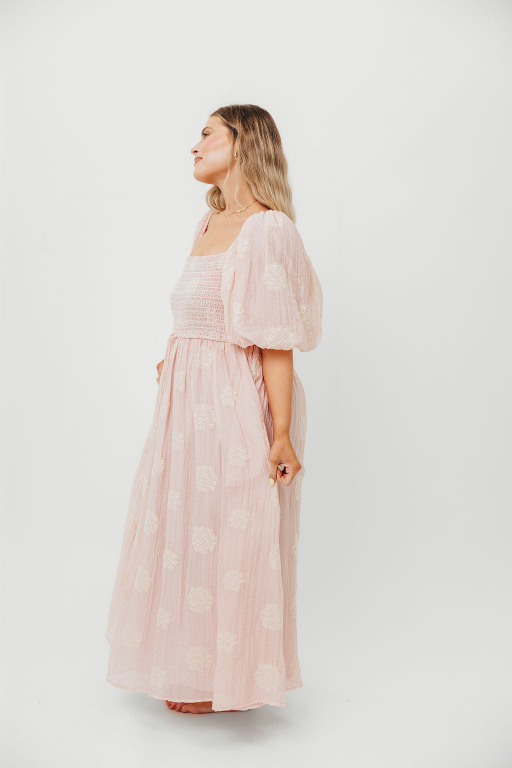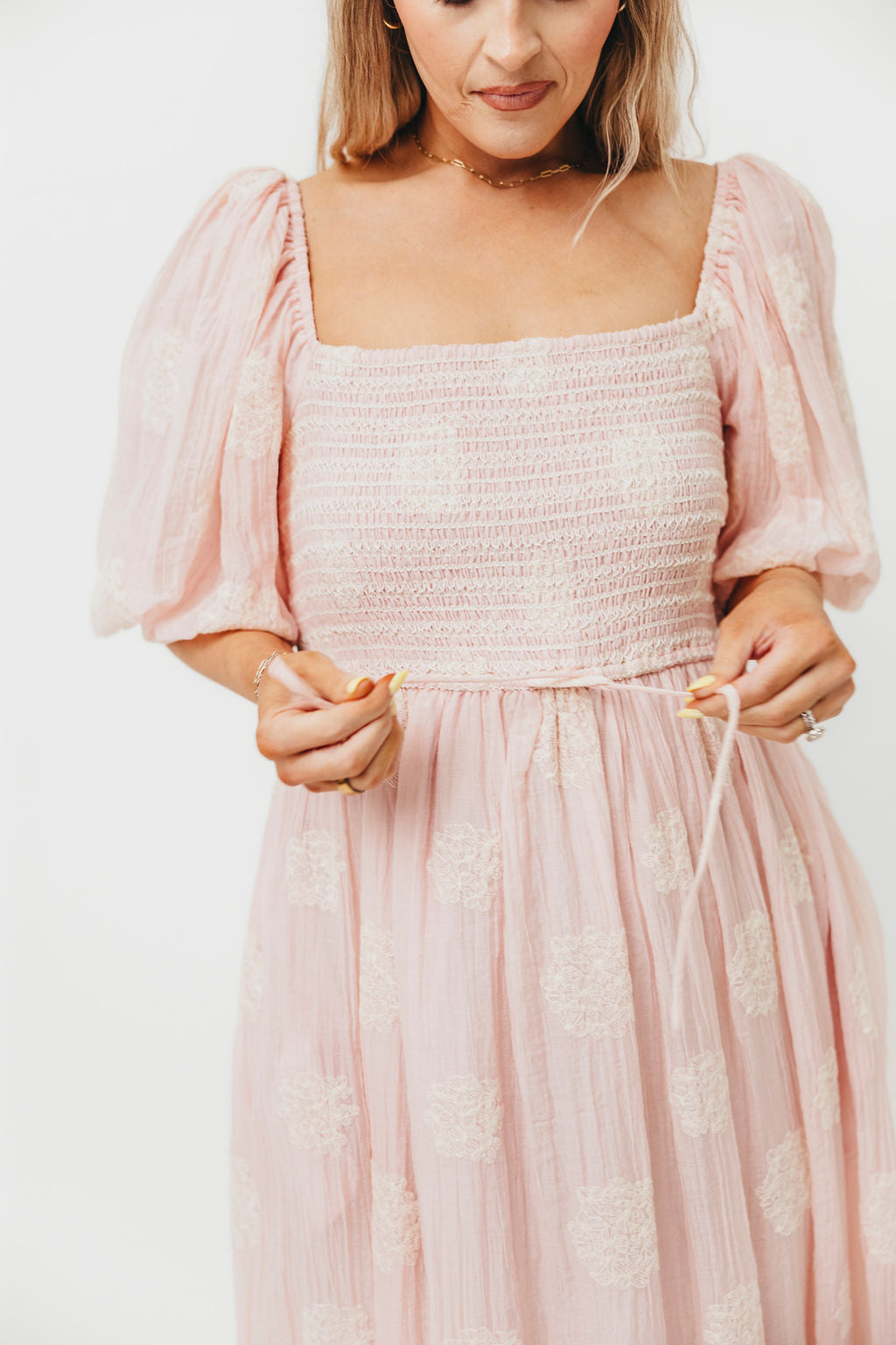 Aimee Smocked Embroidered Floral Midi Dress in Blush