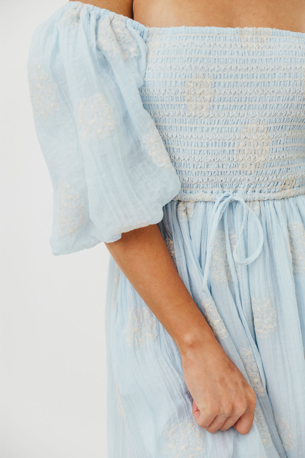 Aimee Smocked Embroidered Floral Midi Dress in Blue