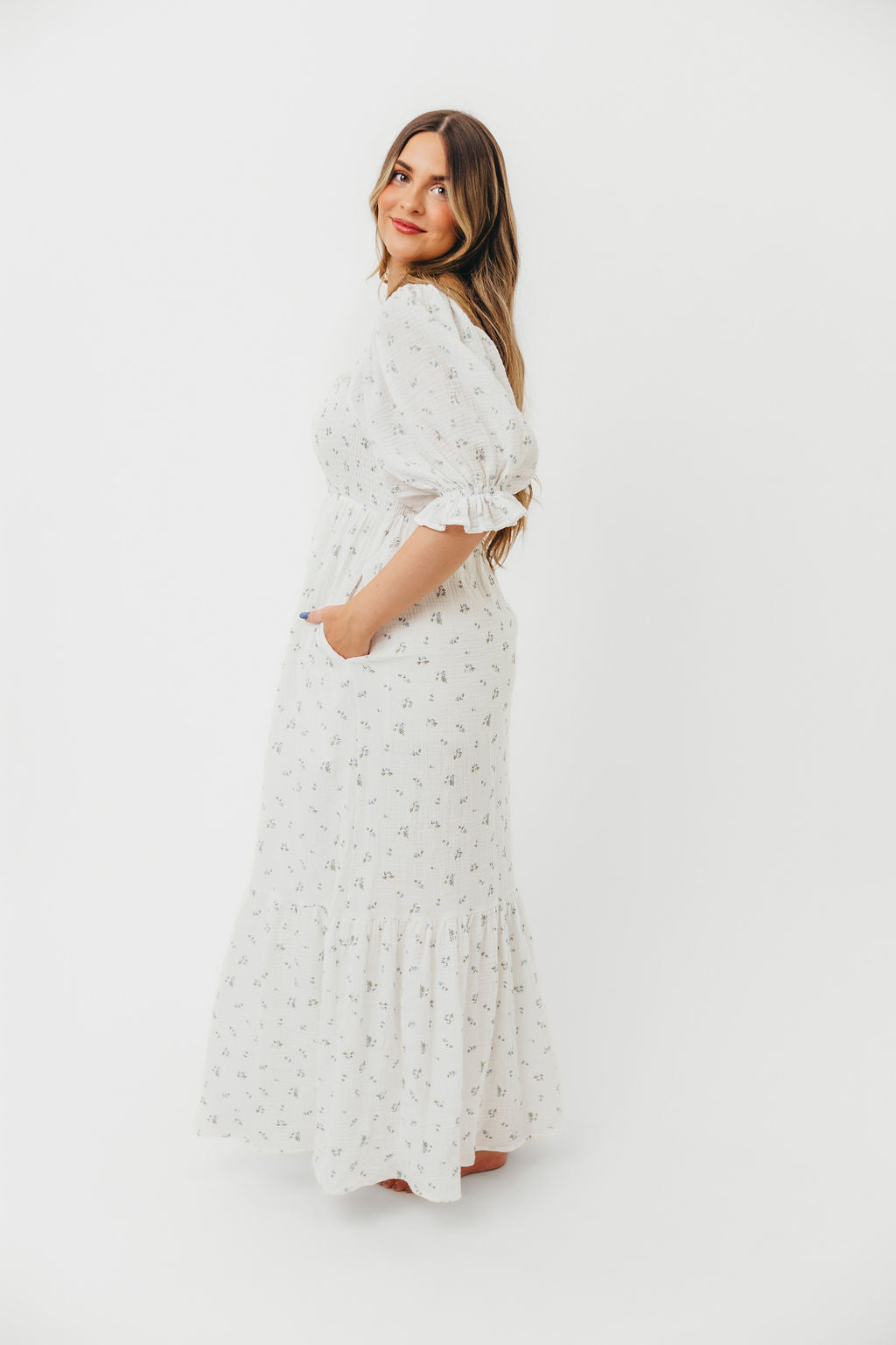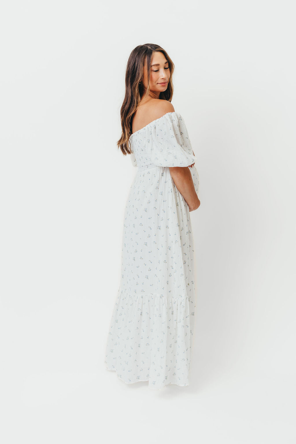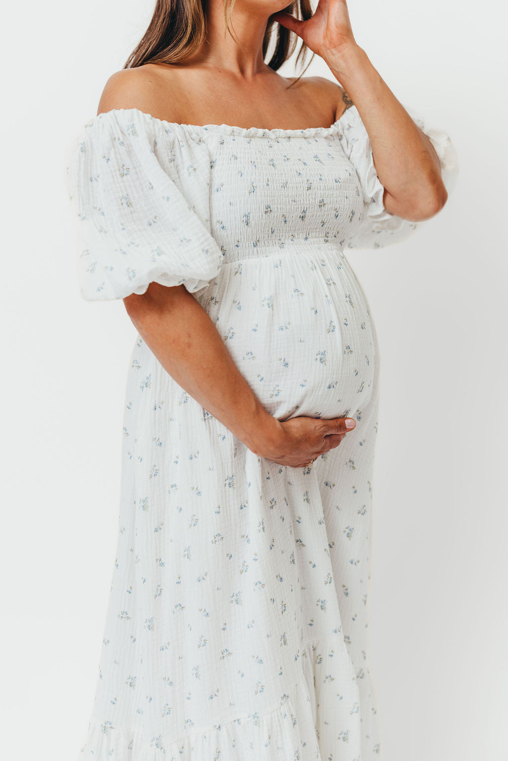 Livvy 100% Cotton Maxi Dress in Off-White / Blue Floral - Bump Friendly & Inclusive Sizing