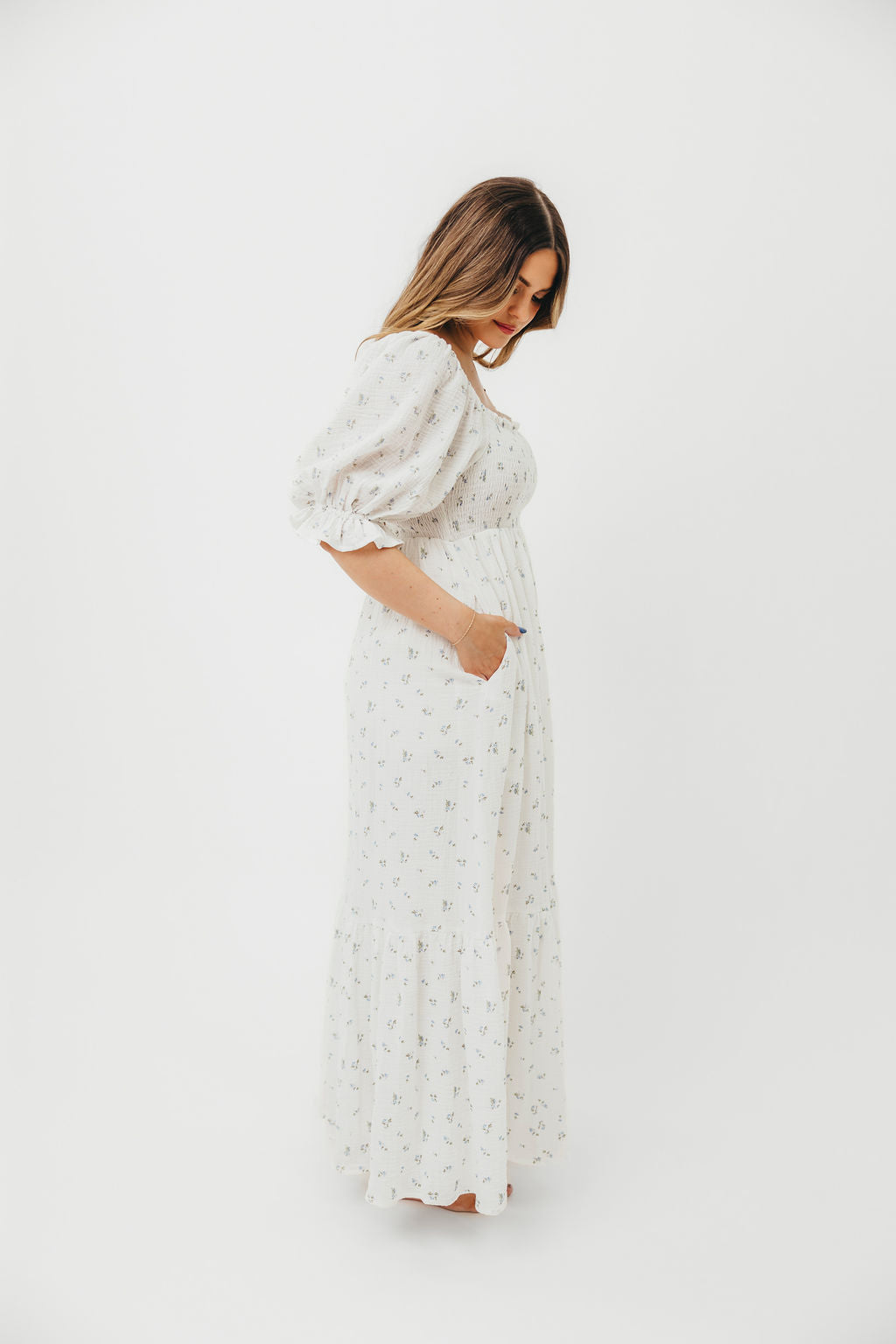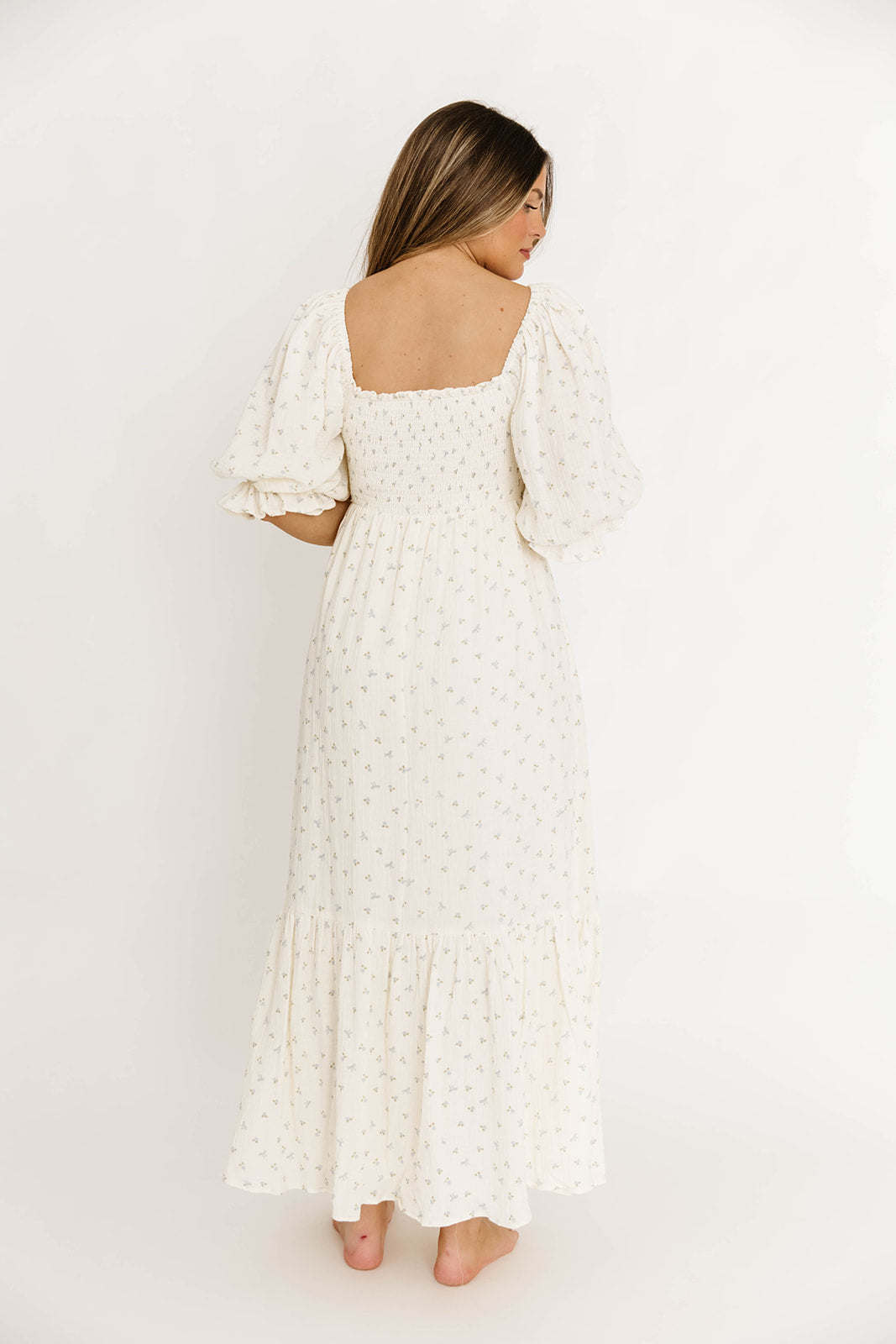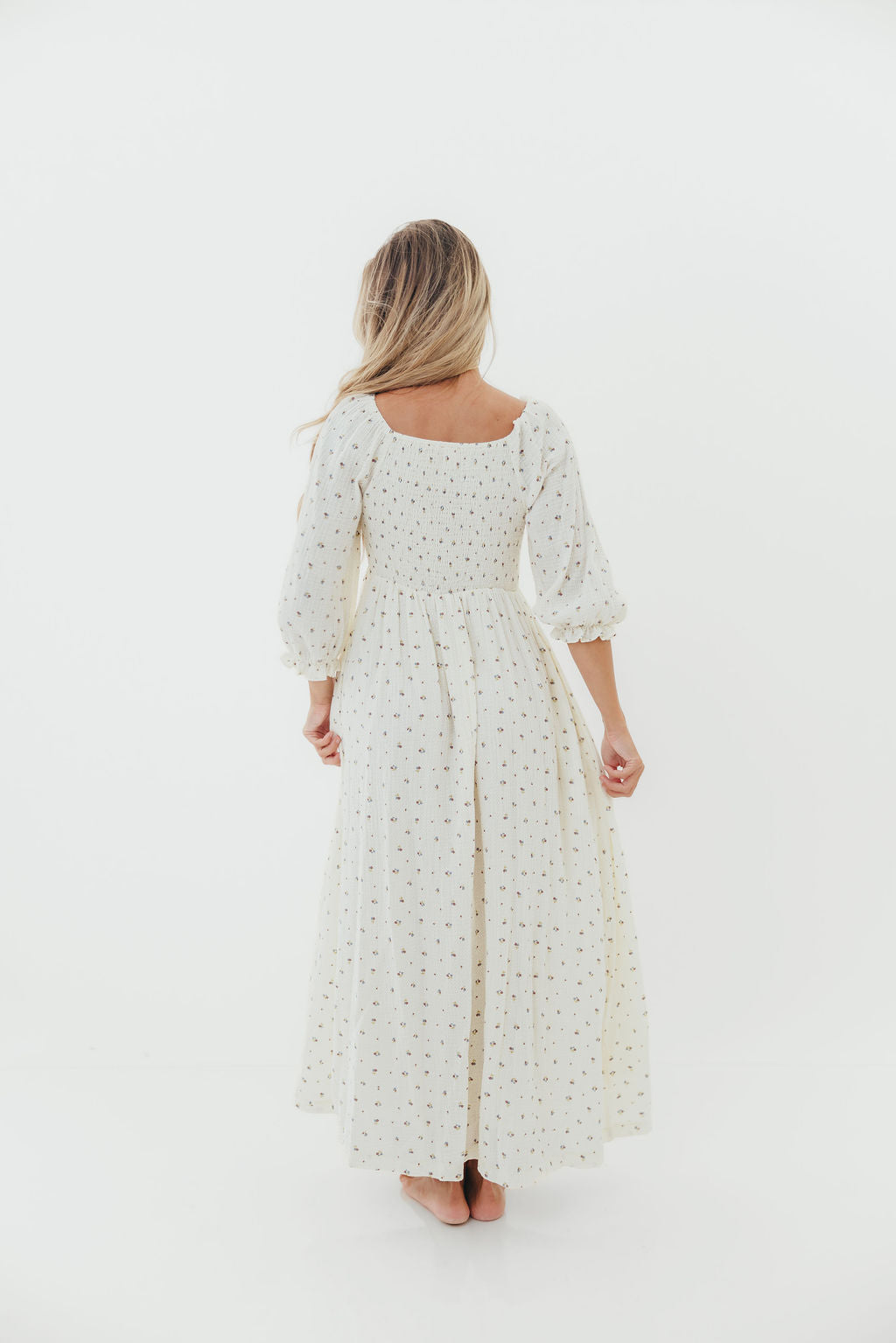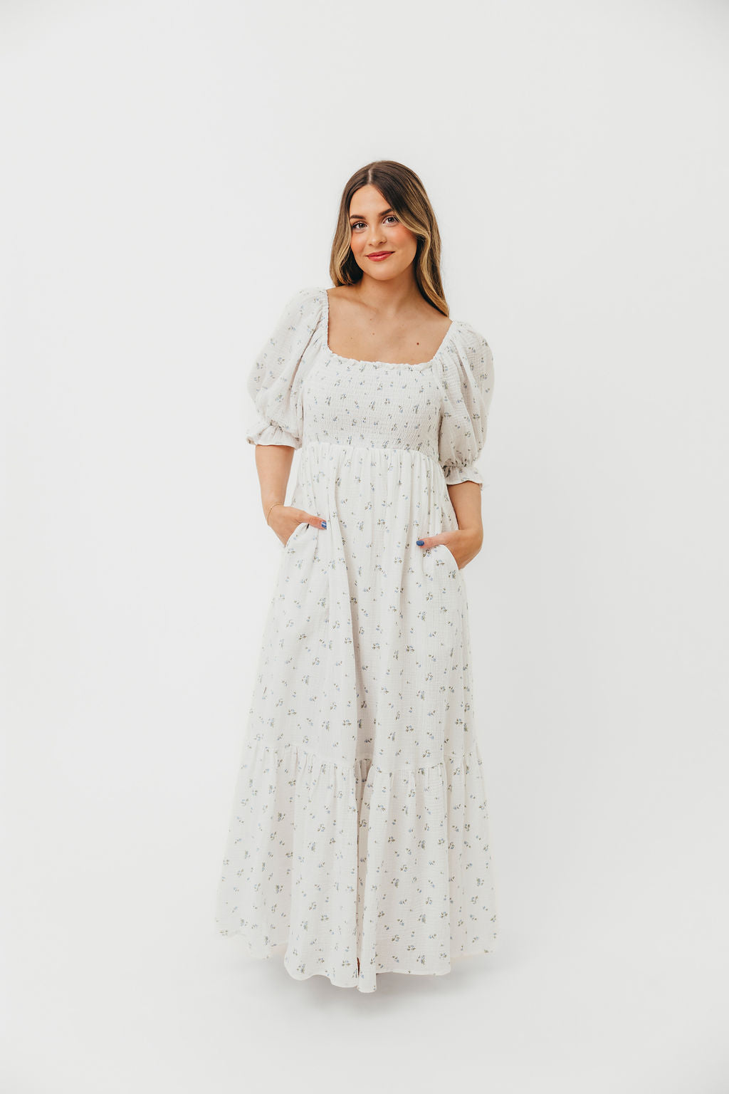 Aimee Smocked Embroidered Floral Midi Dress in Ivory