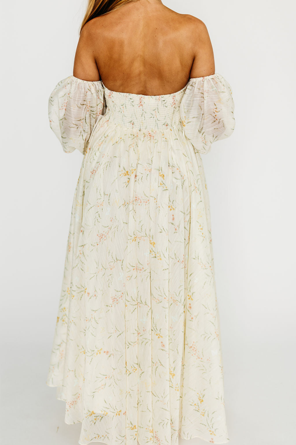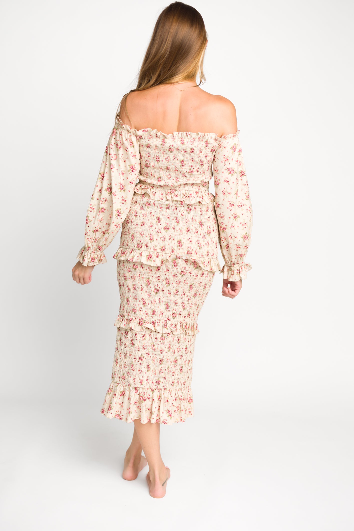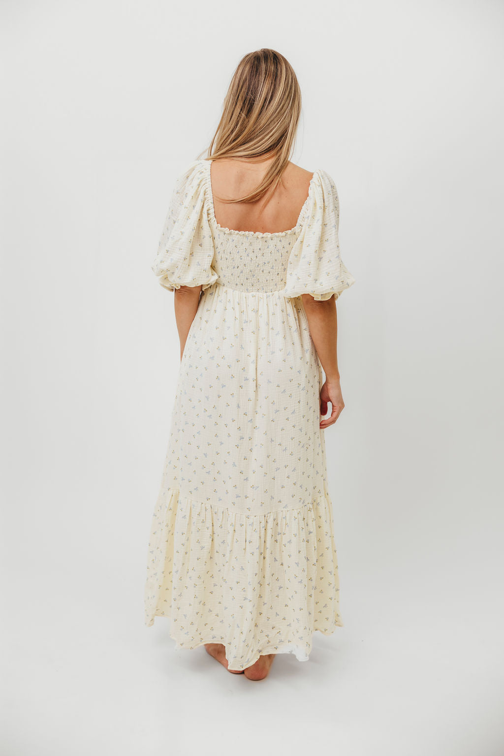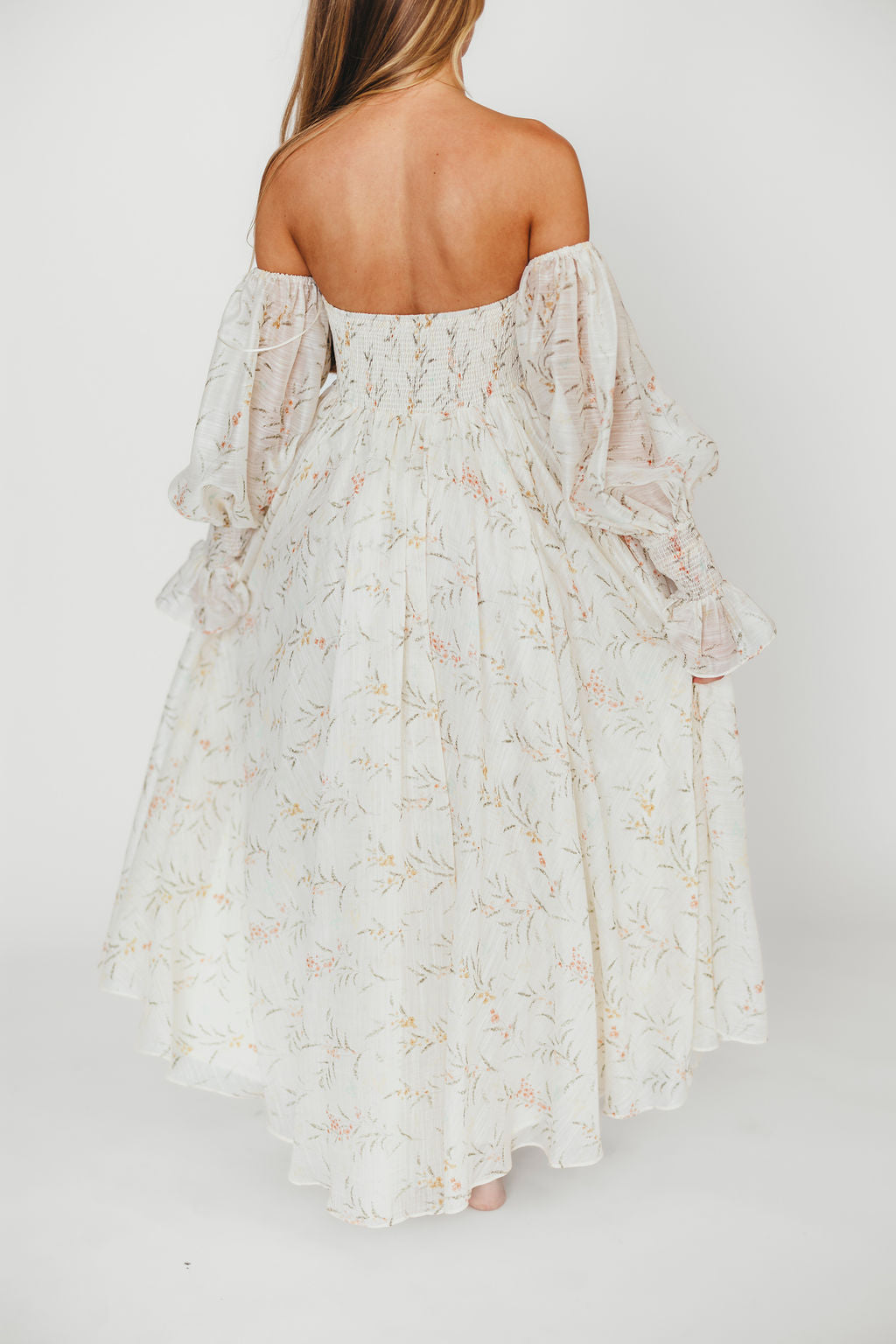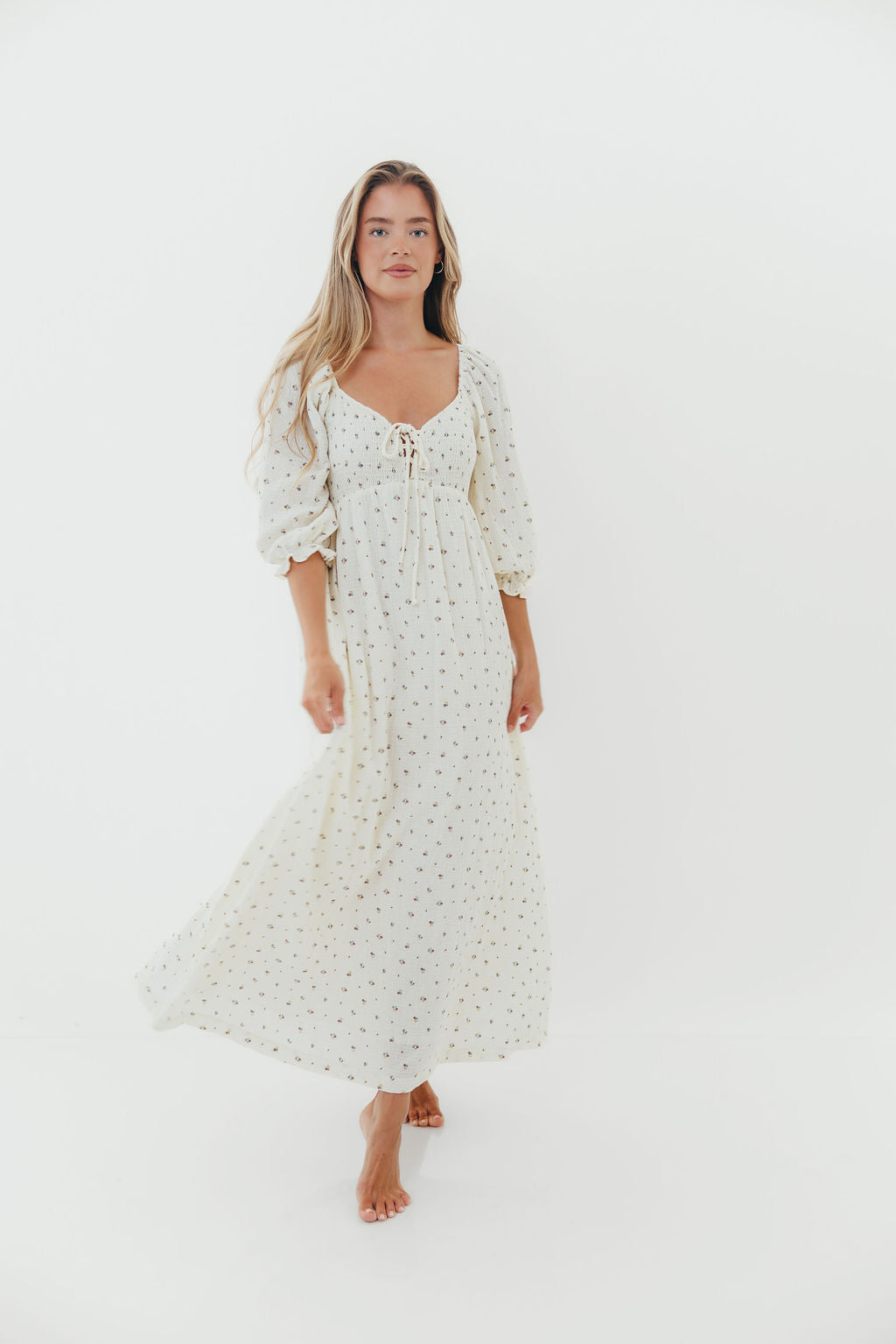 Aimee Smocked Embroidered Floral Midi Dress in Ivory