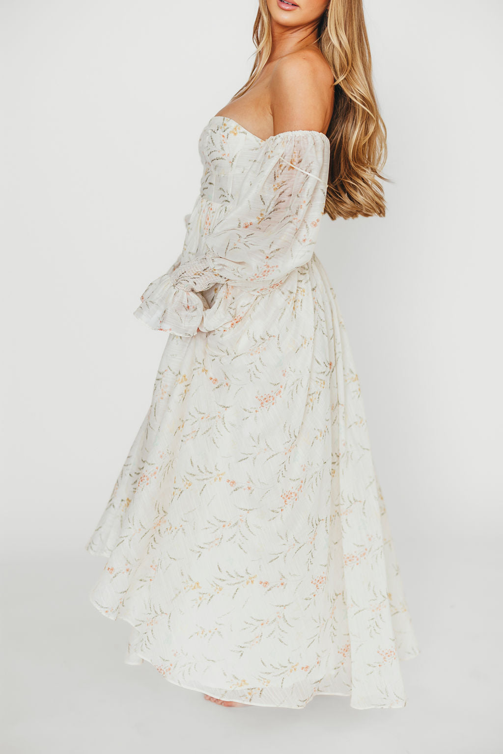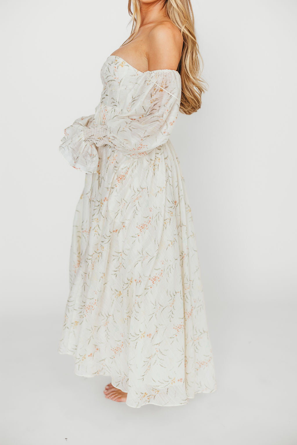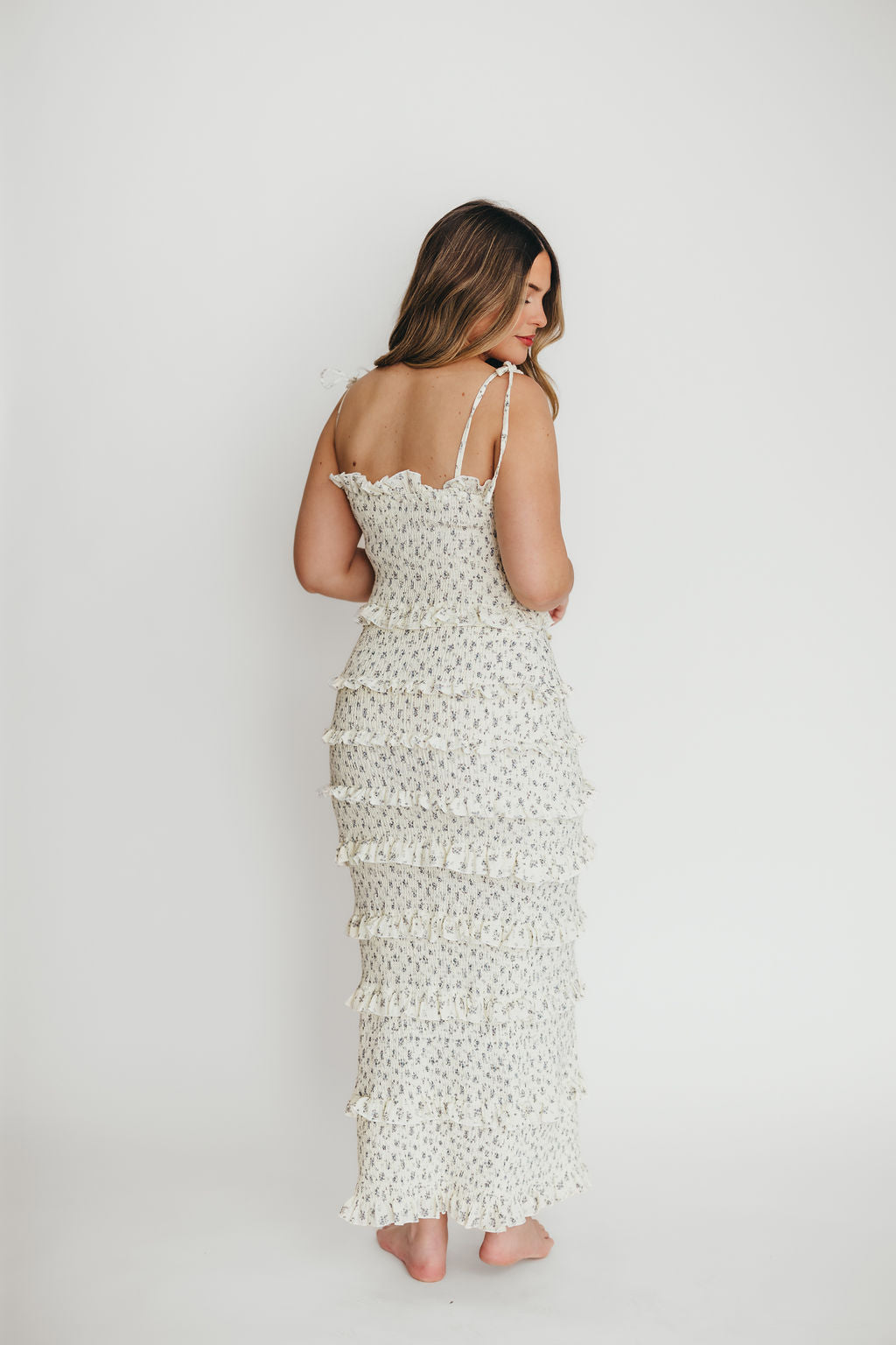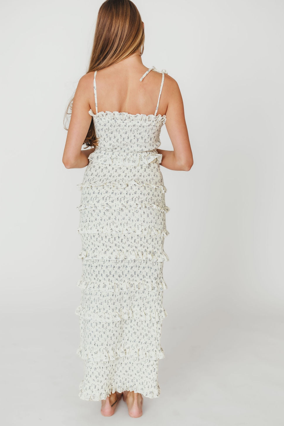 Aimee Smocked Embroidered Floral Midi Dress in Ivory