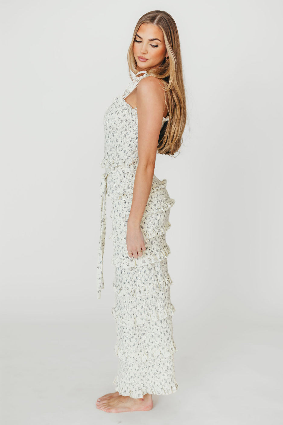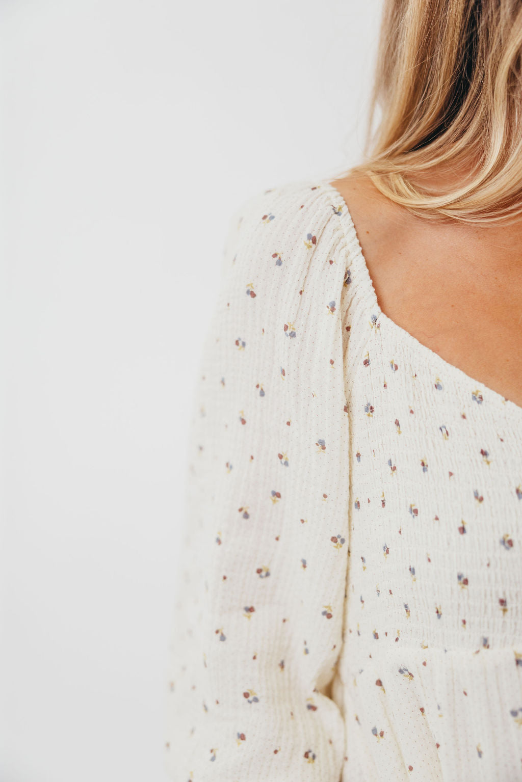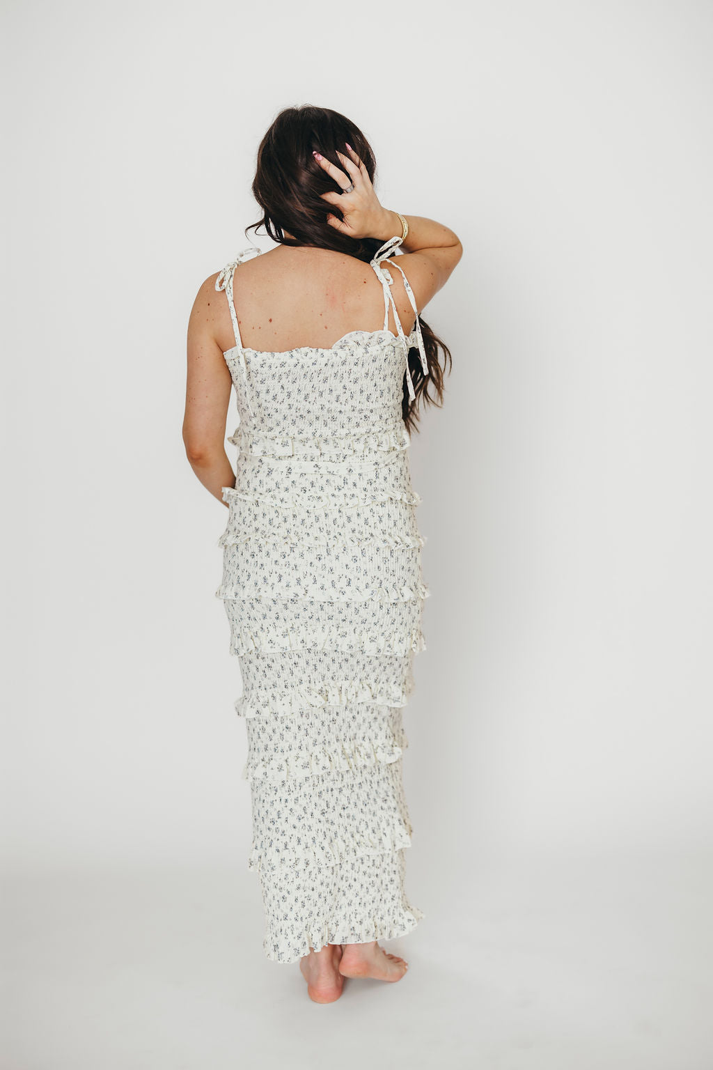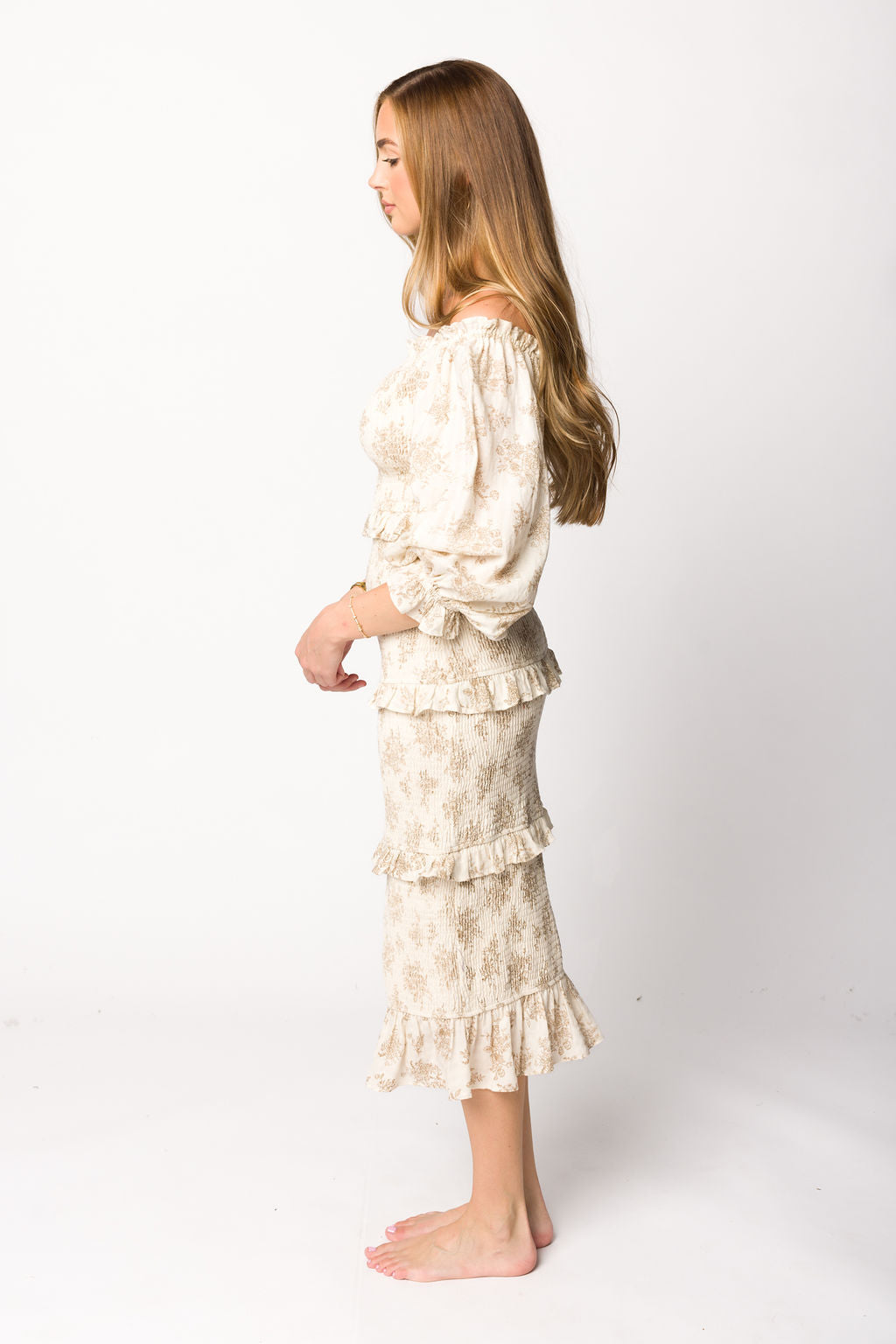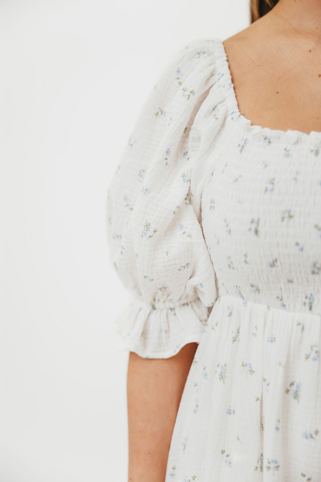 Aimee Smocked Embroidered Floral Midi Dress in Ivory