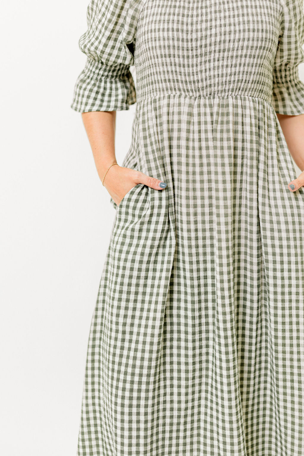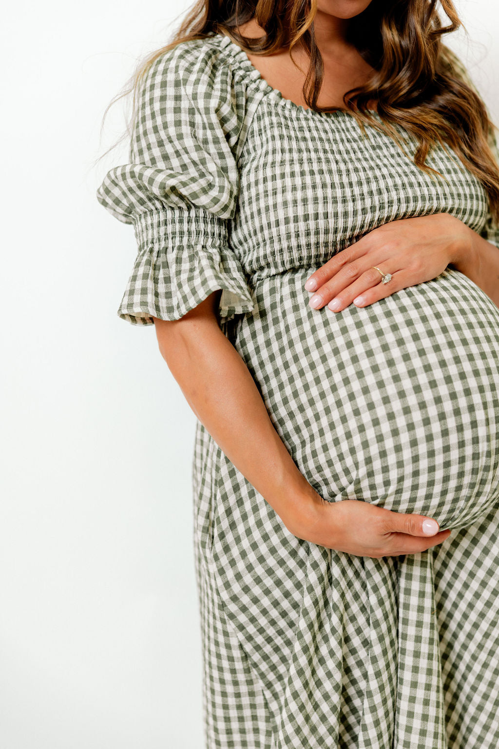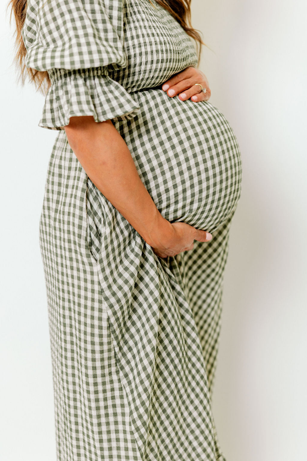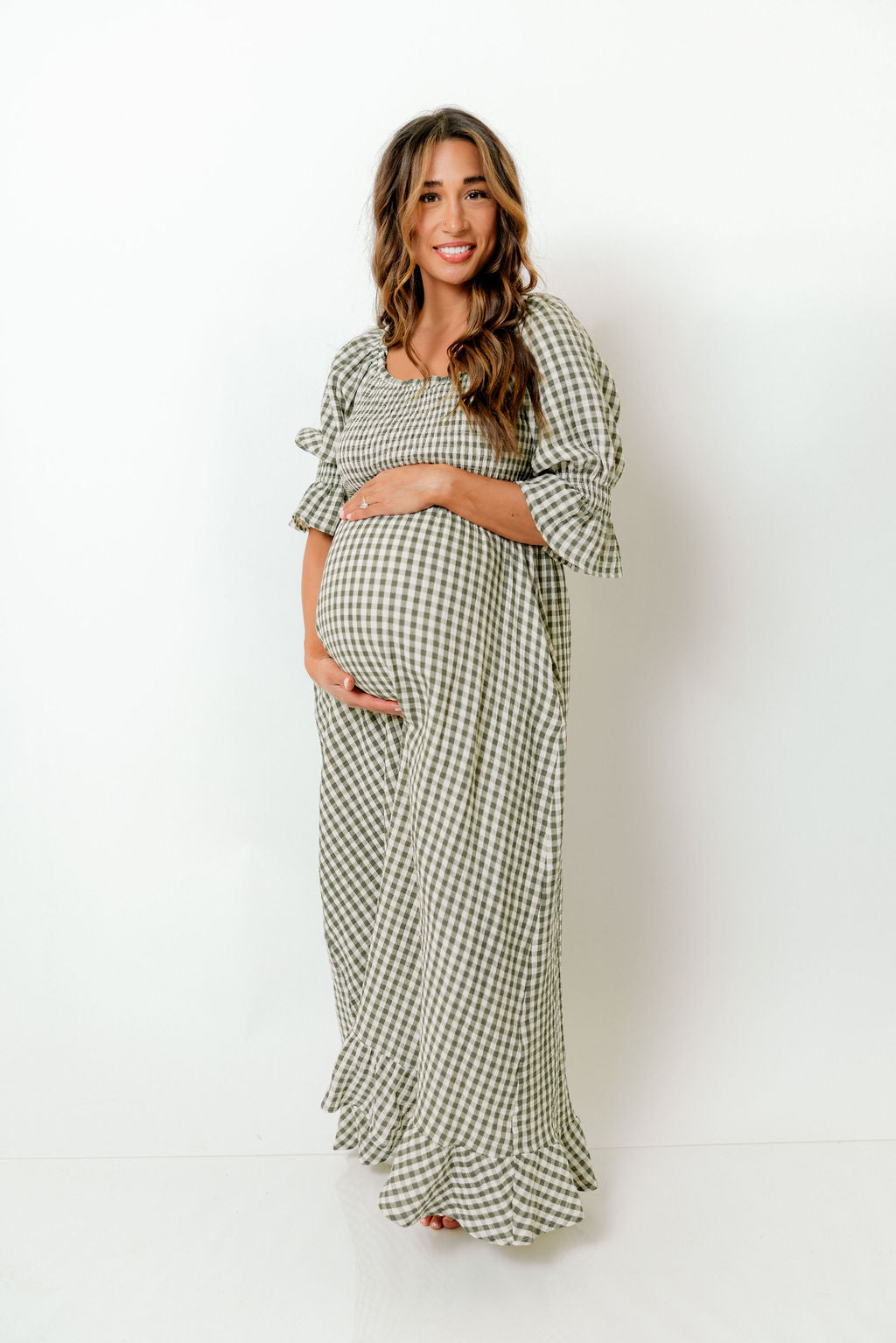 Cecilia 100% Cotton Smocked Maxi Dress in Muted Gold Plaid - Bump Friendly
