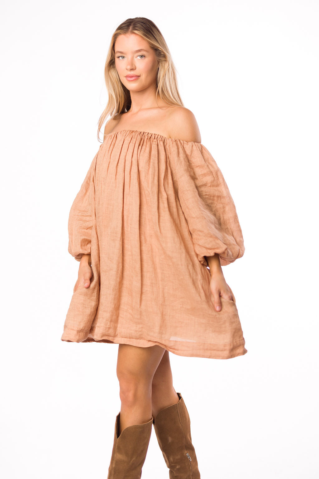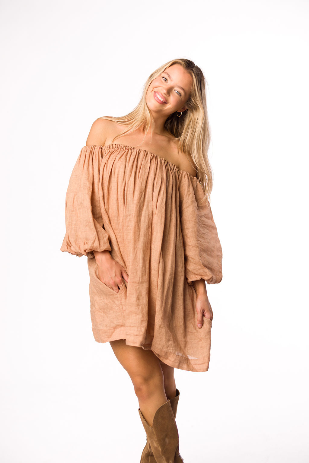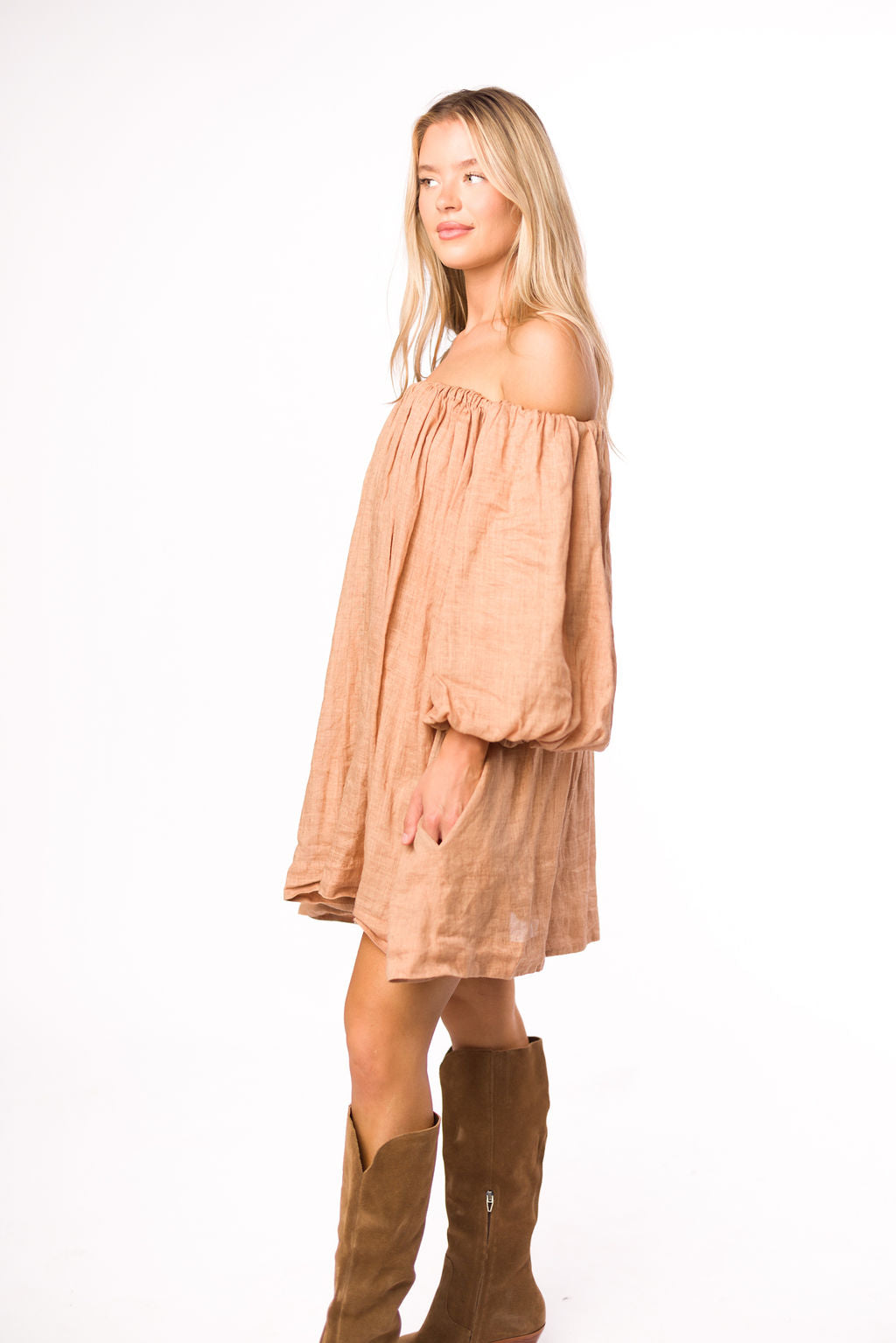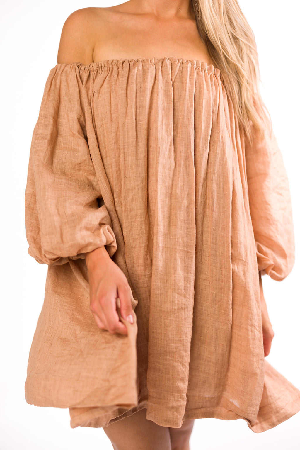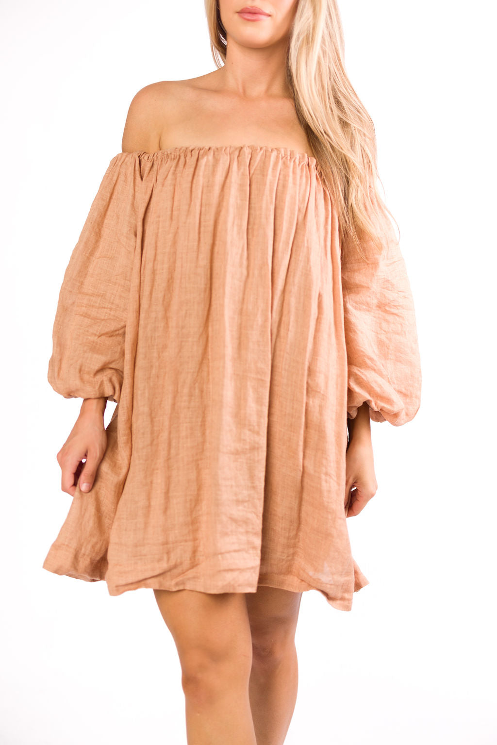 Cassidy 100% Linen On/Off Shoulder Mini Dress in Mocha *Final-Sale*