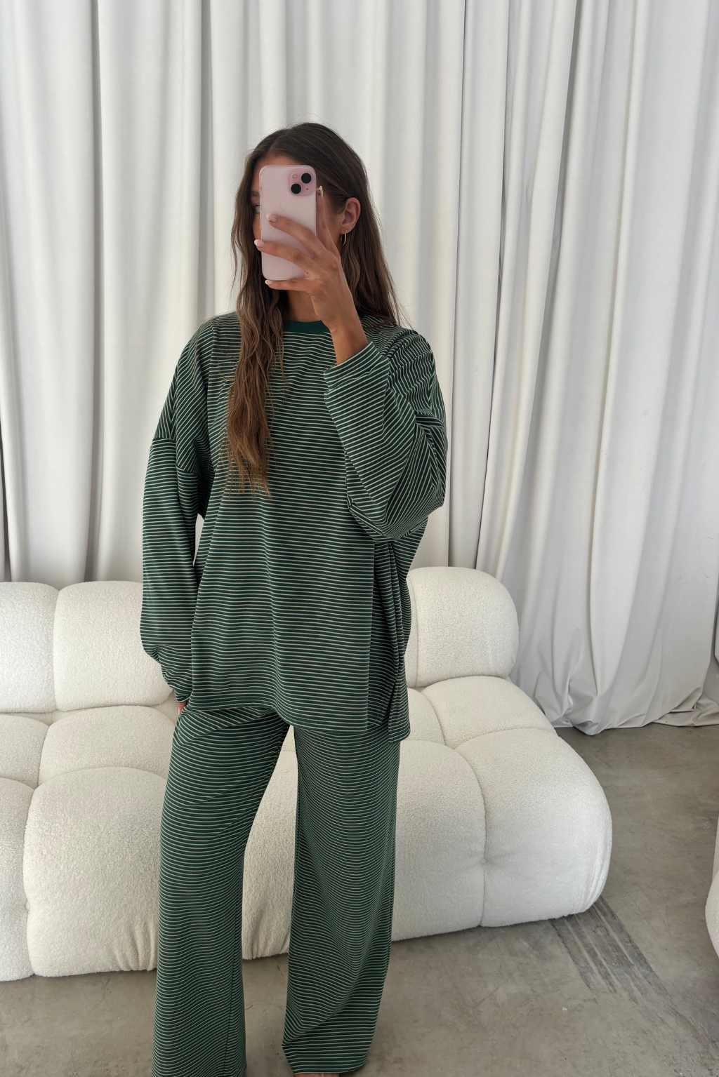 Naomi Striped Fleece Oversized Long Sleeve Top in Forest Green