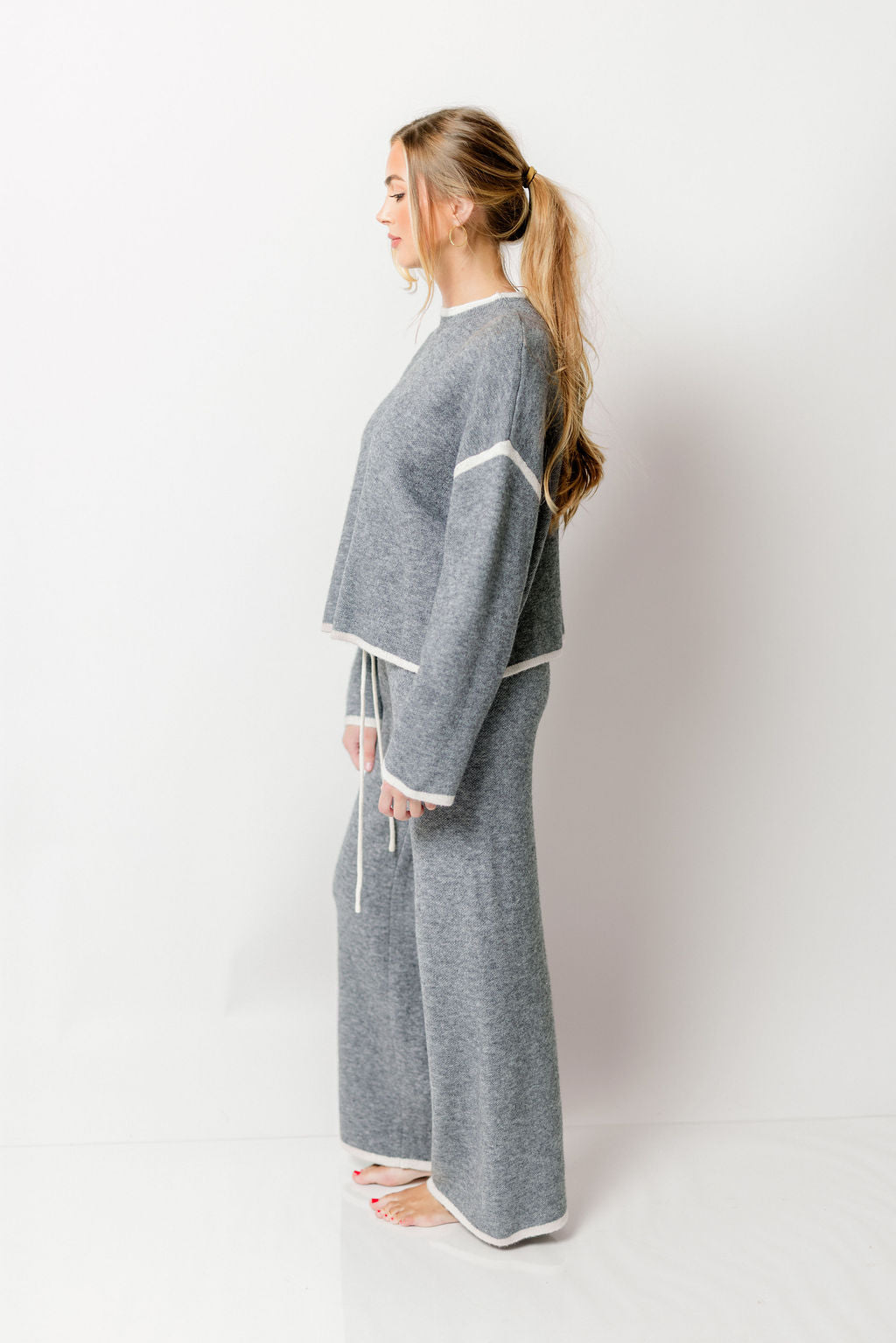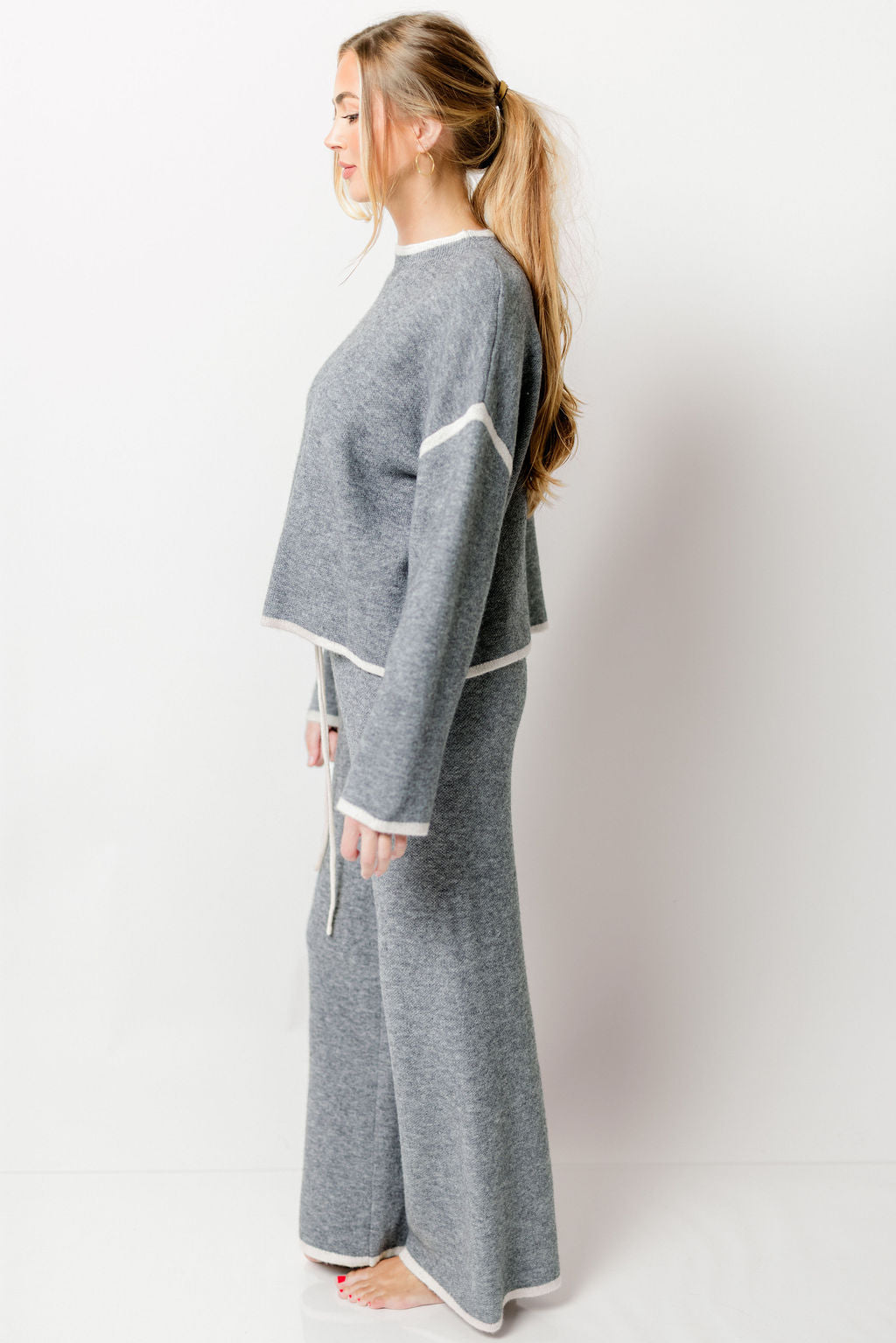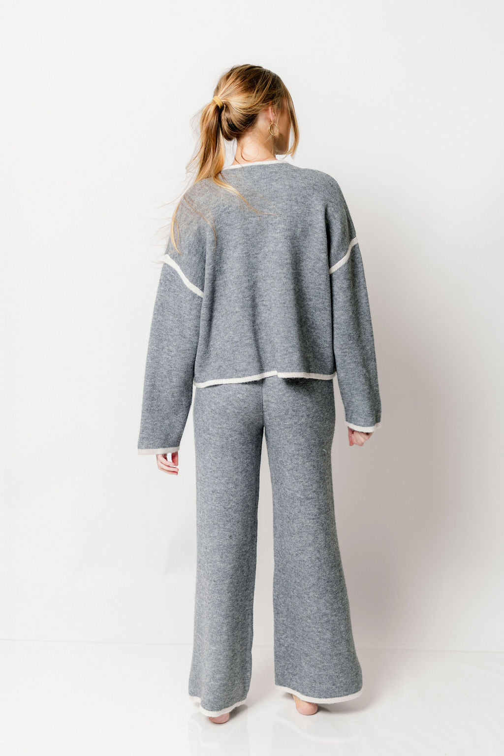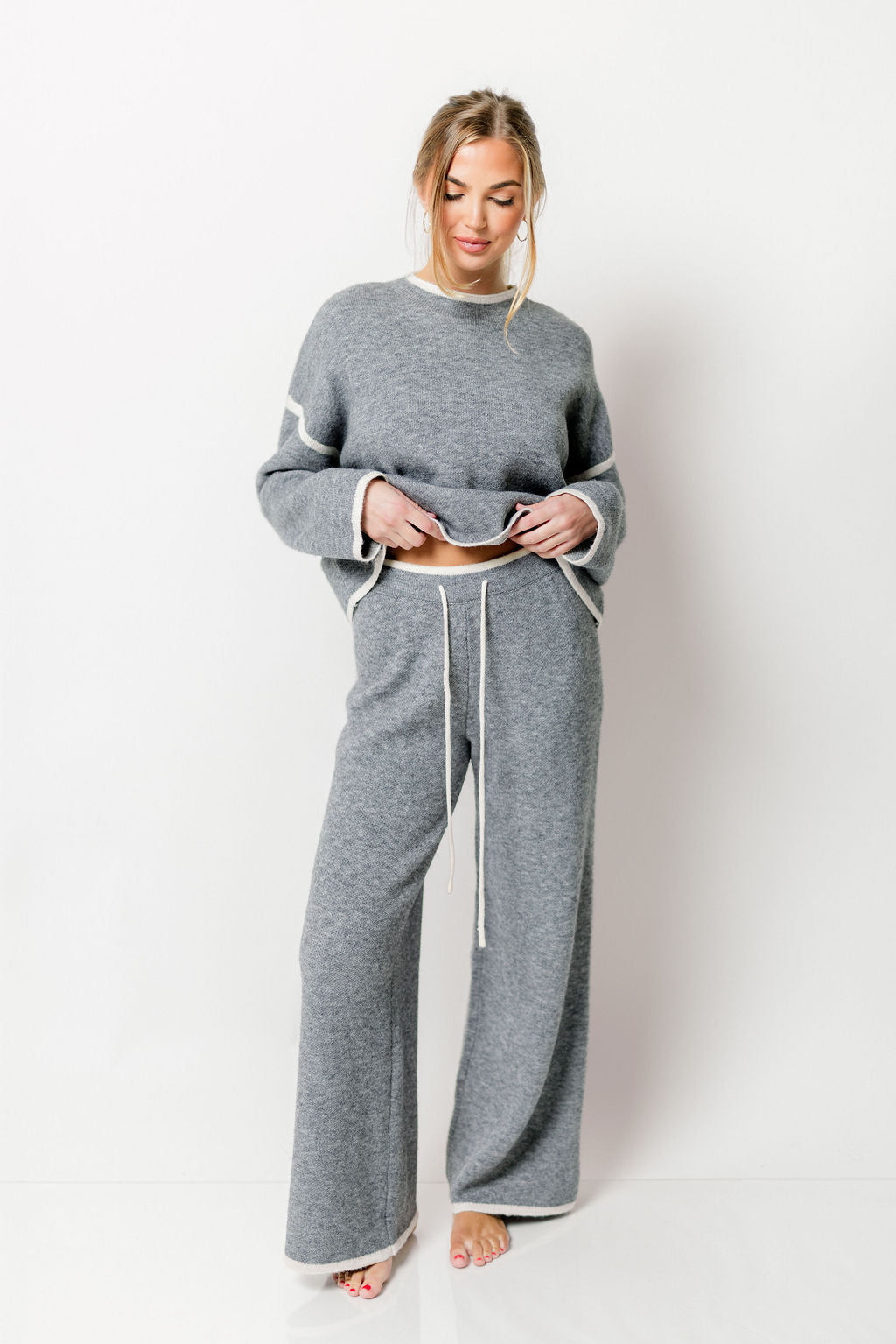 GARMENT DETAILS: Cozy sweater knit set. Features a relaxed fit, with contrast color trim. Pants features an elasticated waistband with drawstring.