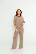 GARMENT DETAILS: Cozy wool-blend top and pants set. Top features a rounded neckline and relaxed fit, with contrast color neckline, dropped shoulders, and rolled edge short sleeves. Matching pants feature elasticated waistband and full length with relaxed silhouette.
