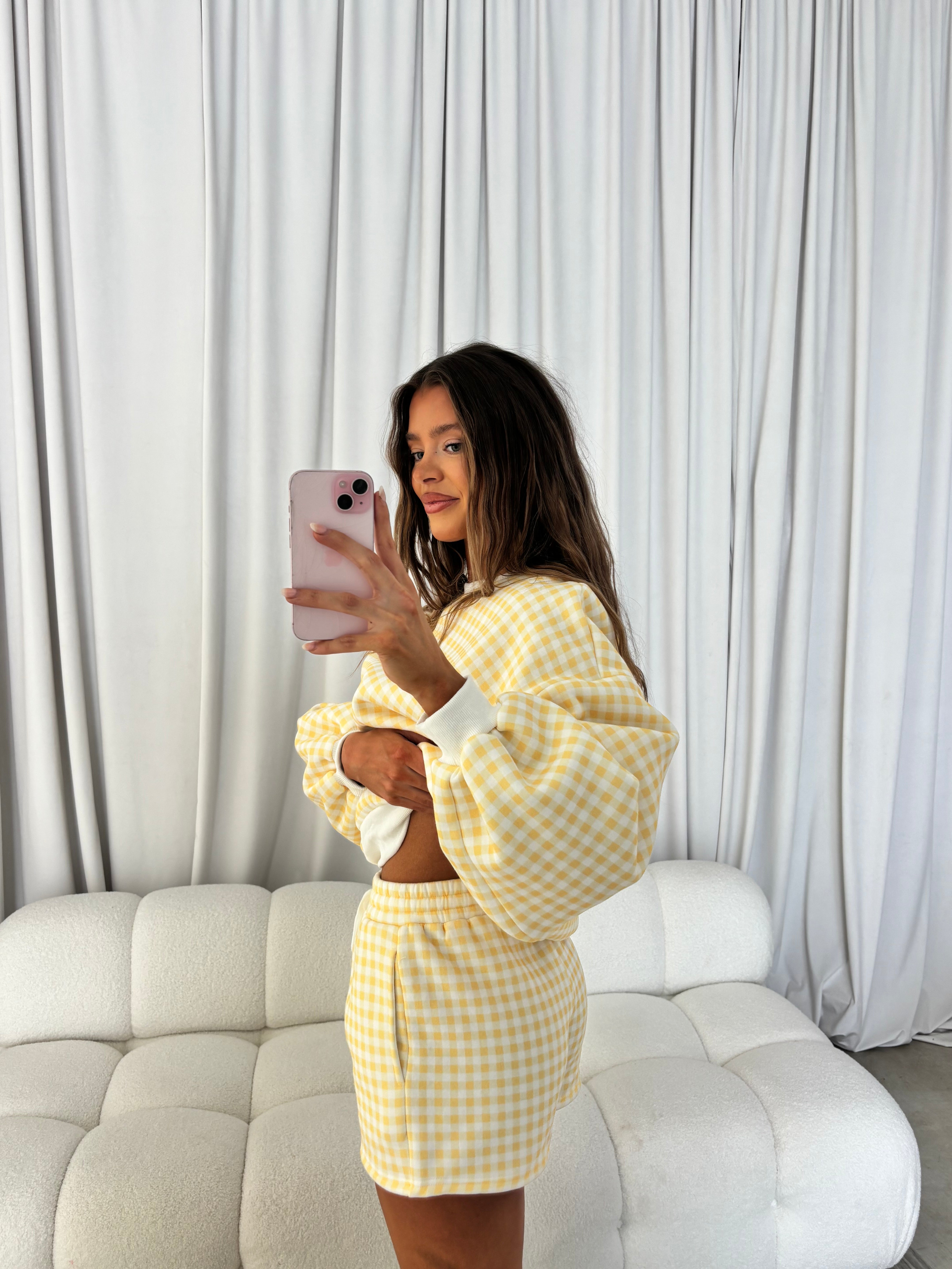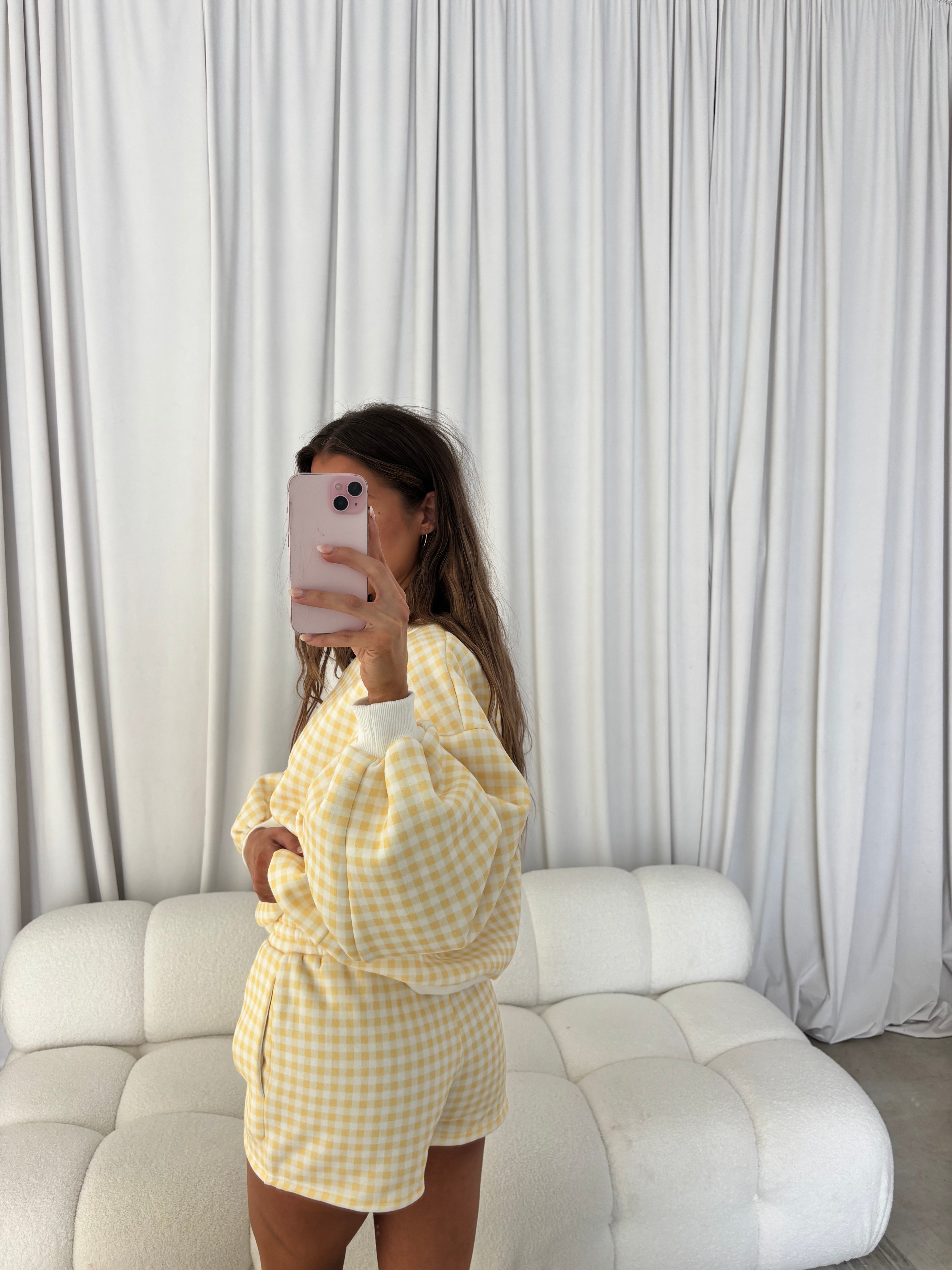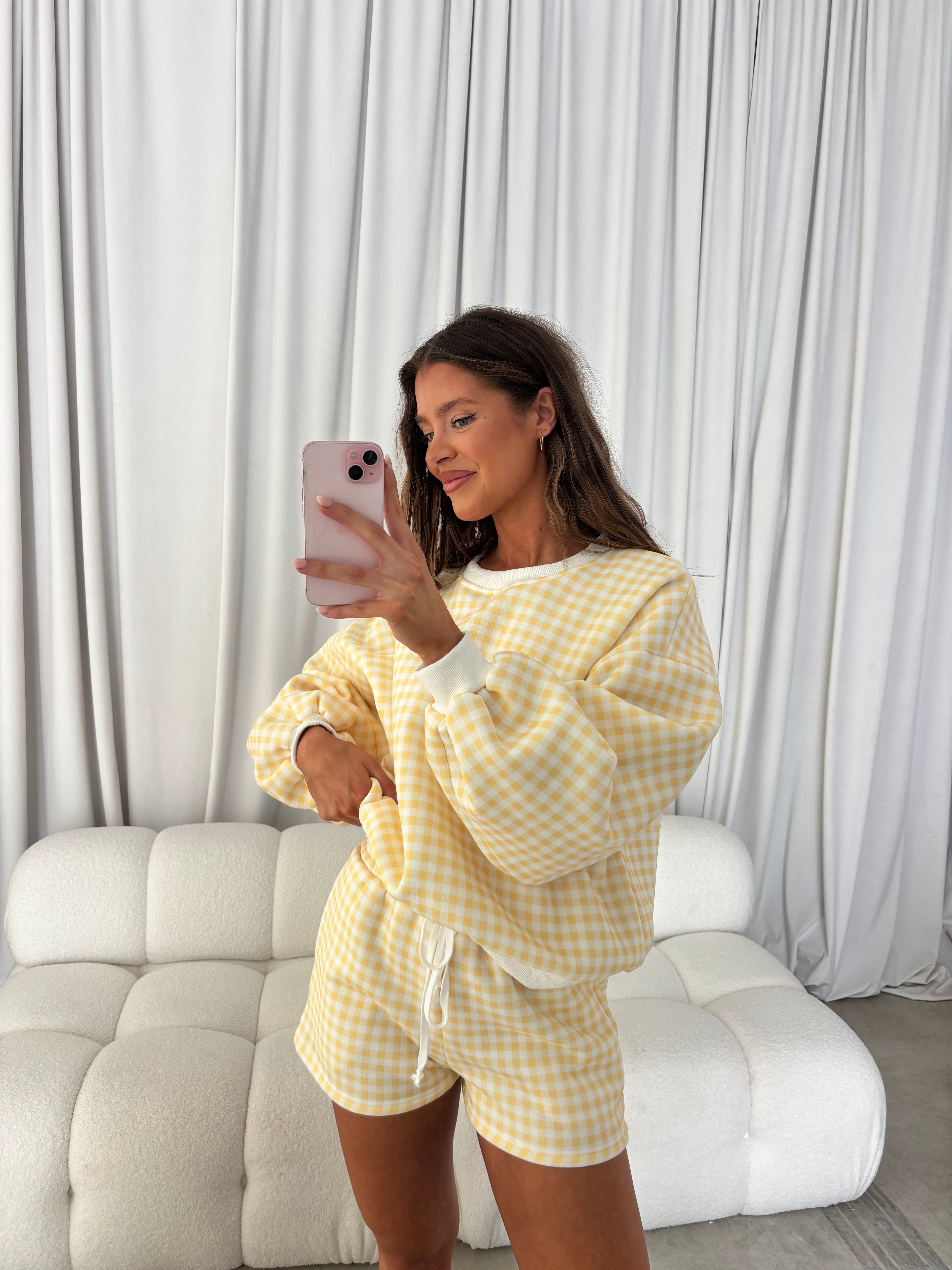 Relax in style with this effortlessly chic lounge set. The soft gingham fabric is designed with a cozy oversized top and drawstring shorts, bringing comfort and a playful modern edge to your everyday look. The relaxed fit and subtle ribbed details make it an easy choice for lounging at home or styling for casual outings.