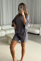 GARMENT DETAILS: Lounge set in a soft, ribbed material. Top features a crewneck, relaxed fit, and short sleeves, with asymmetrical hem. Shorts feature an elasticized, wide waistband in a biker-short length.