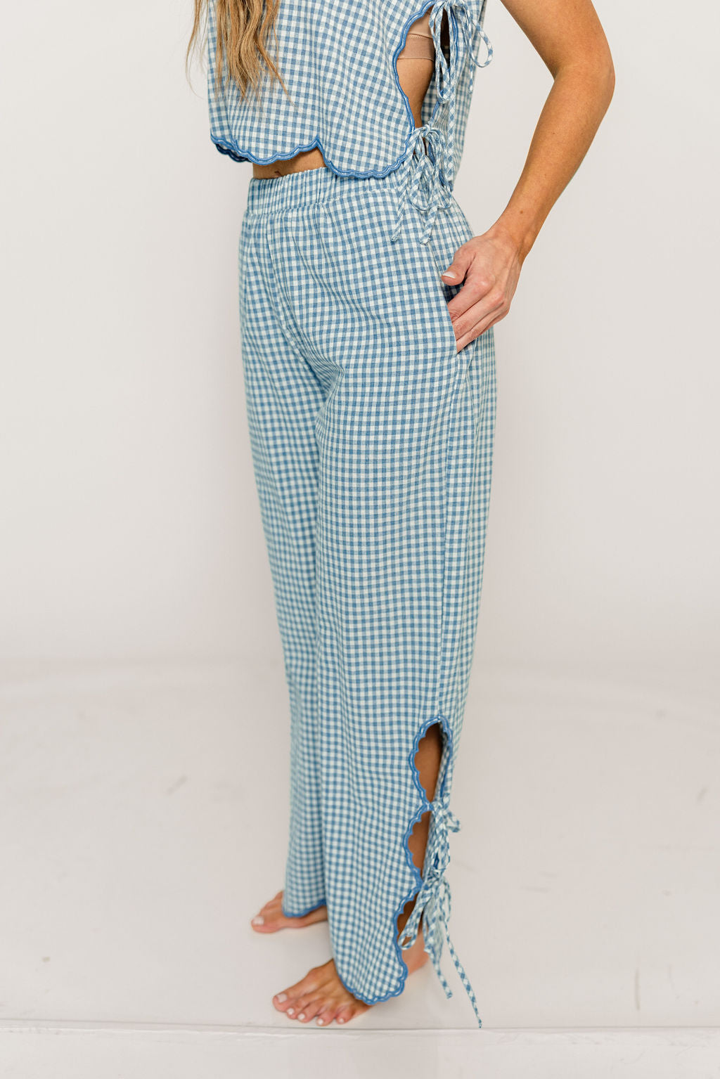 GARMENT DETAILS: Charming gingham-print pants with elasticated waistband, wide-leg silhouette, and adjustable side ties at the hem. Features contrast color trim and dual side pockets.
