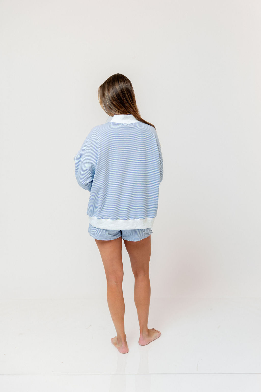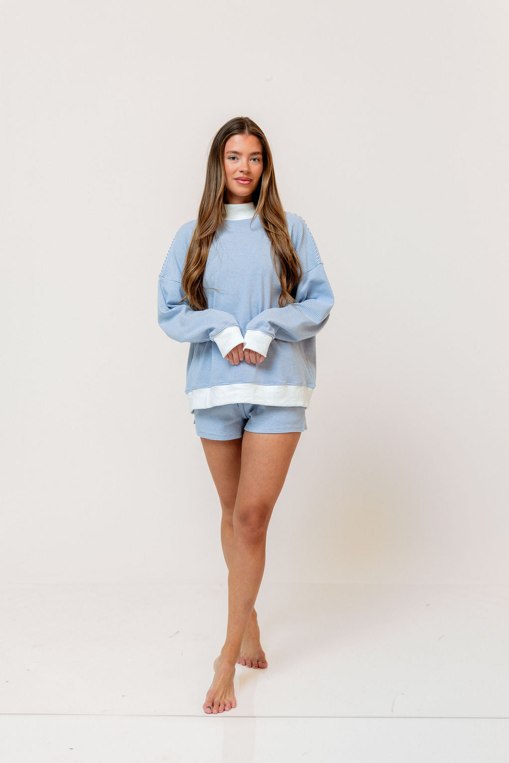 Nate Mock Neck Sweatshirt and Short Set in Light Blue/Cream Stripe