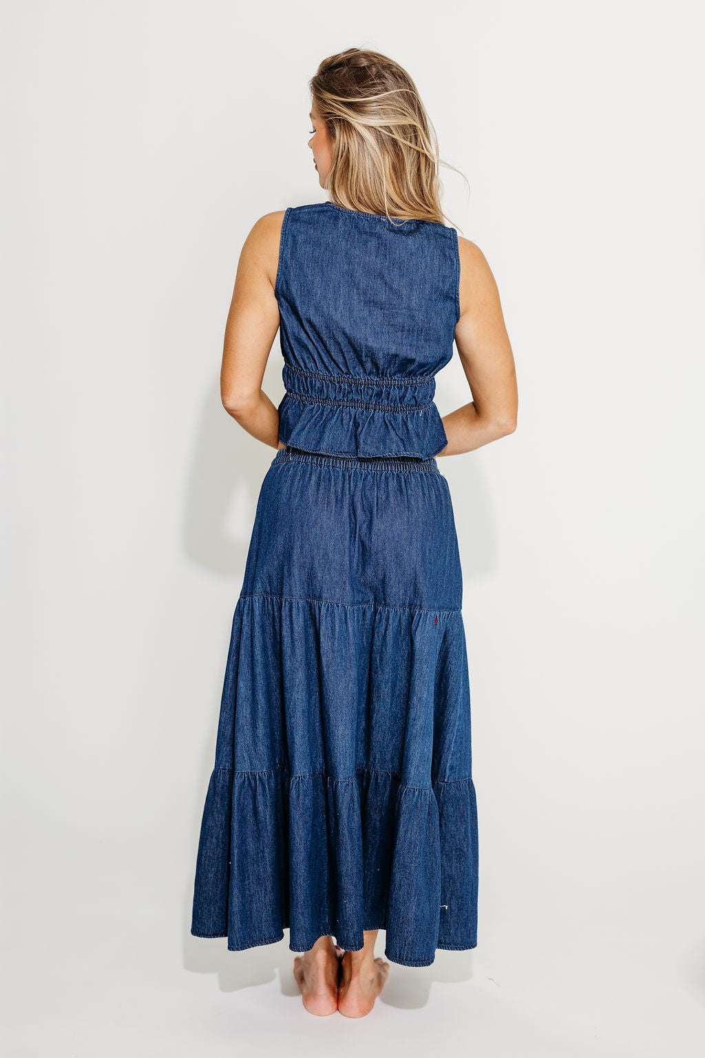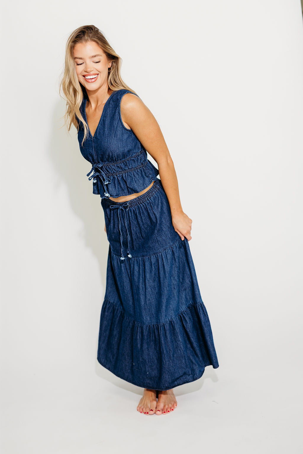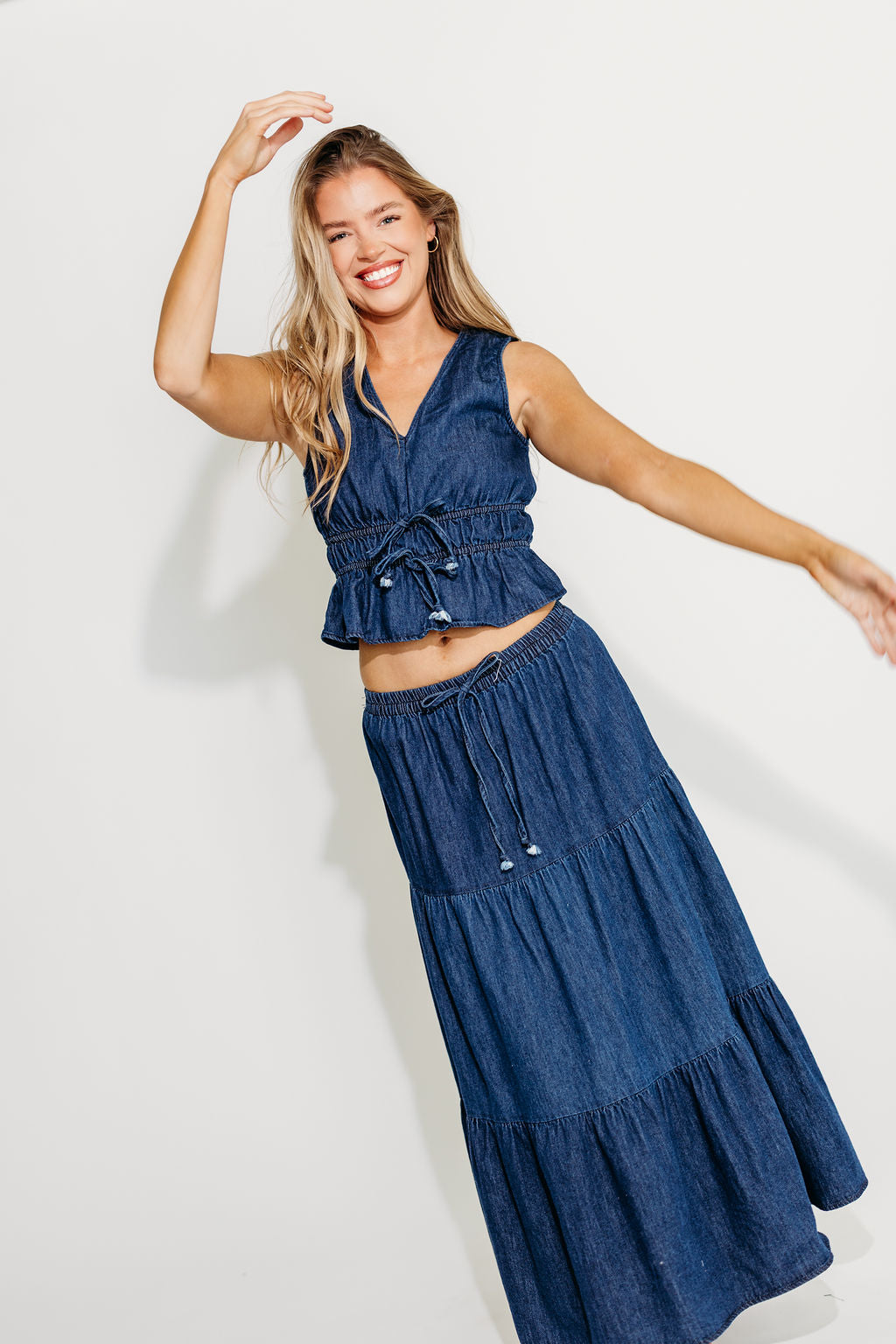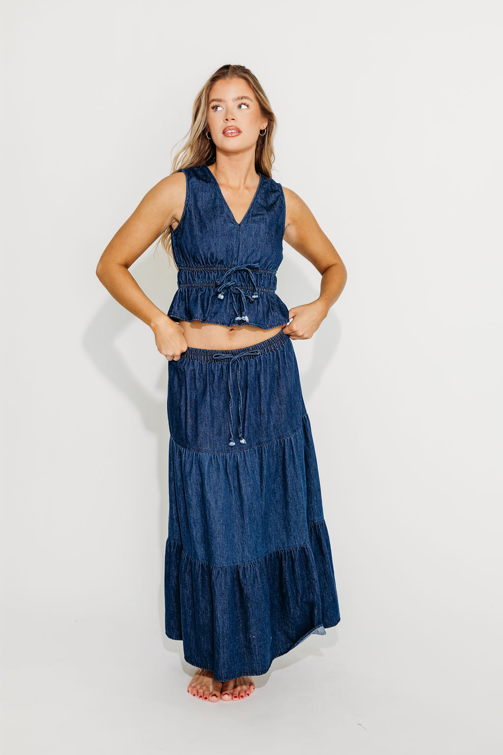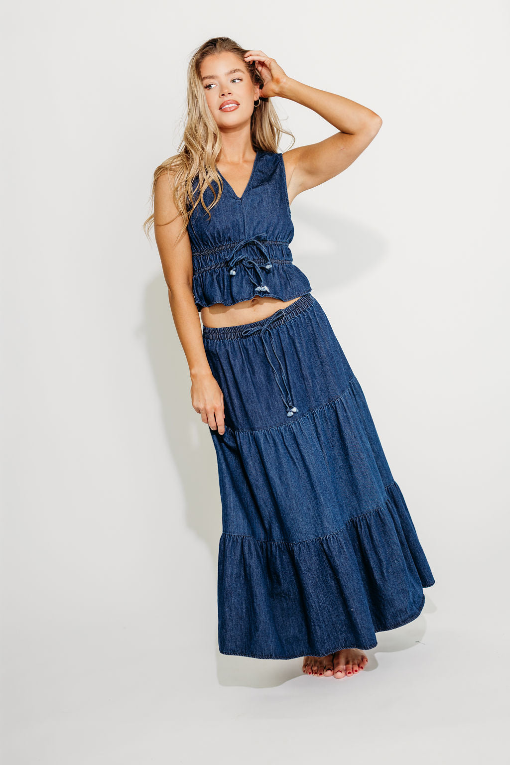 GARMENT DETAILS: Cotton denim top and skirt set. Top features sleeveless design with V-neckline, gathered waist with tie detail, and peplum hem. Long midi skirt features elasticated waistband, tiered design, and beaded drawstring.