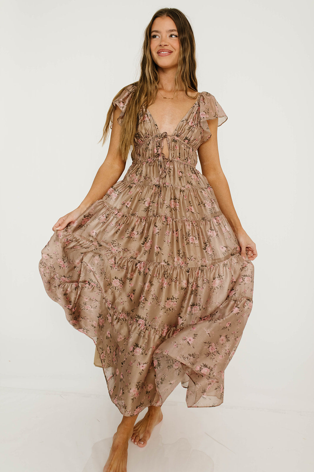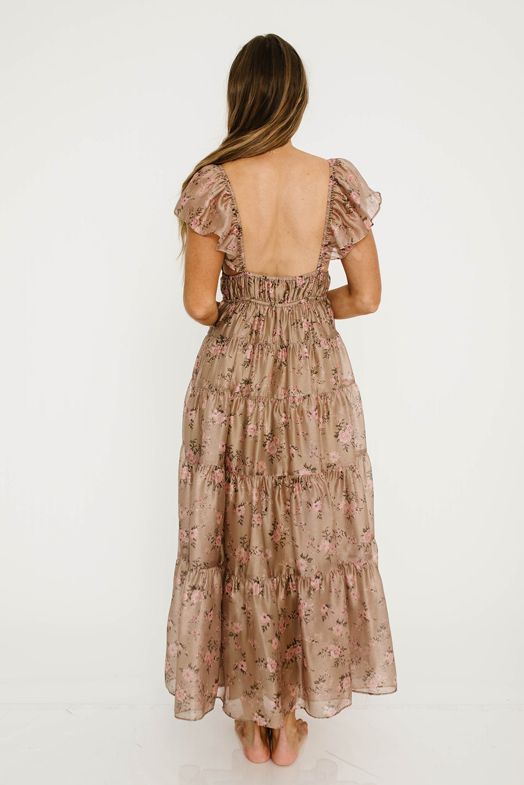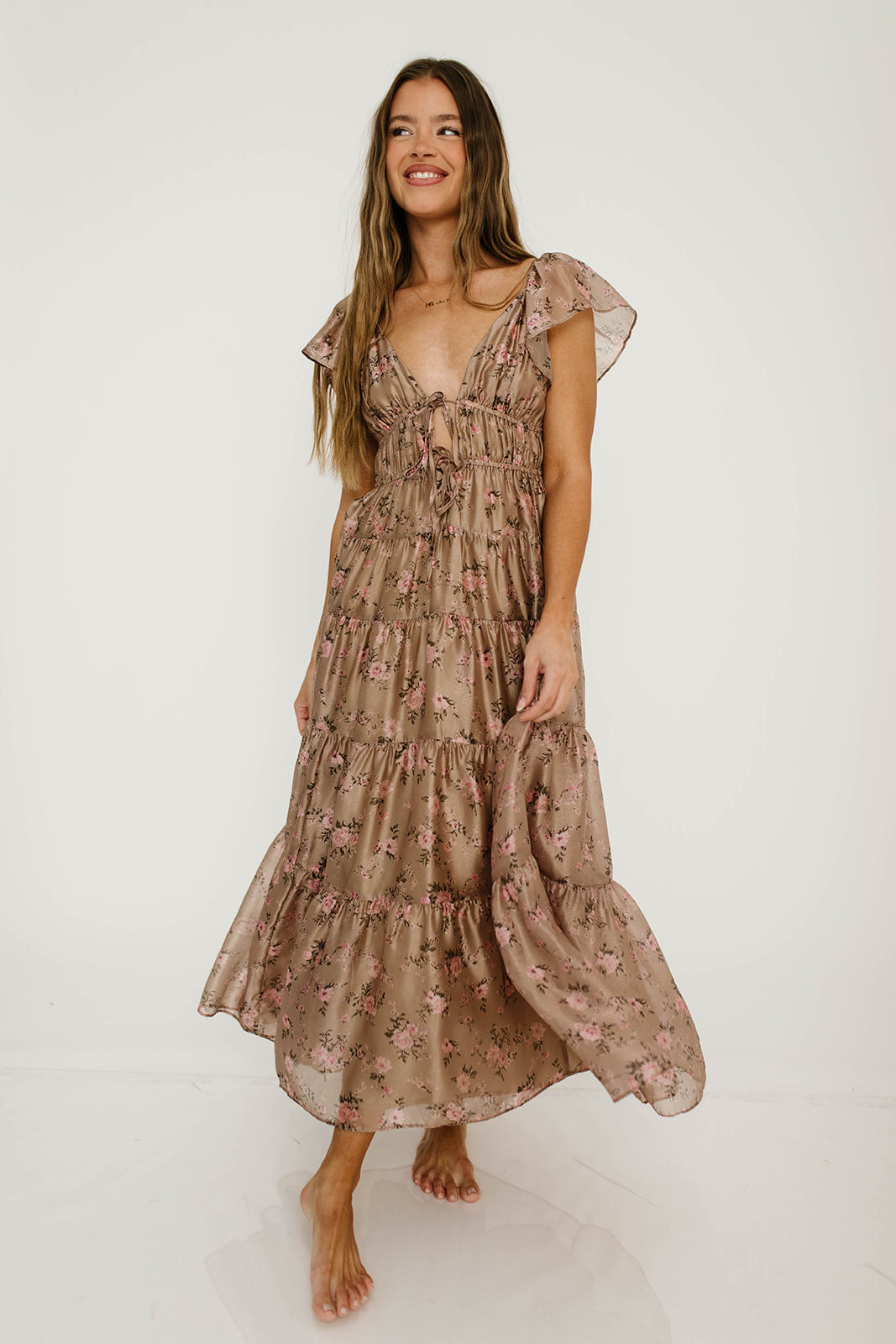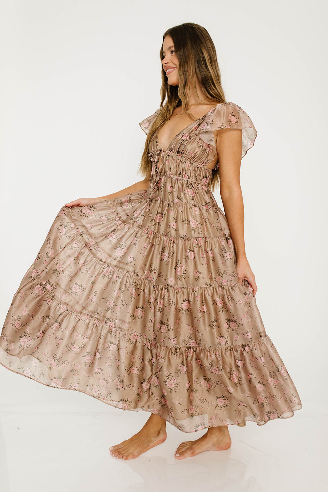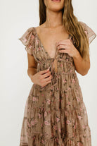 GARMENT DETAILS:  Lightweight maxi dress in a soft floral and gingham print pattern. Features ruffled cap sleeves, with a plunging V-neckline and self-tie details at the empire bodice. Full skirt features multiple ruffled tiers.