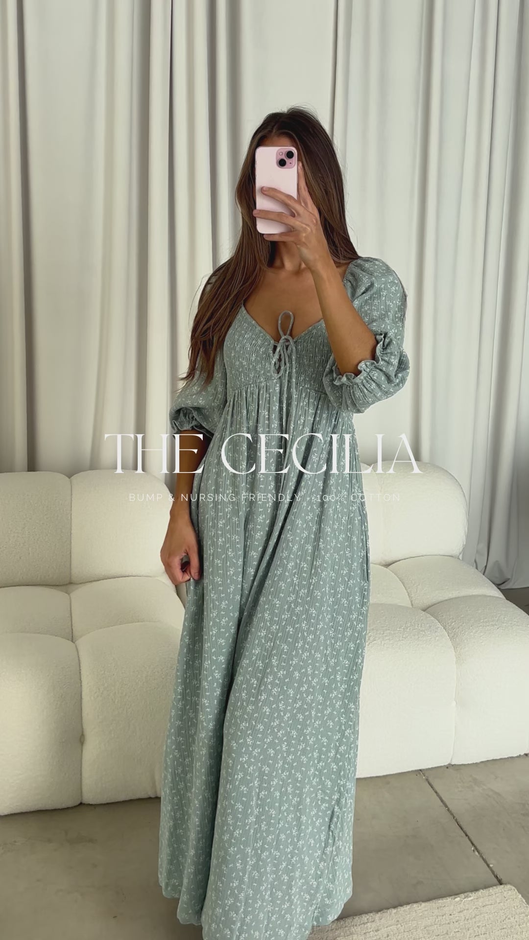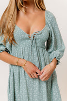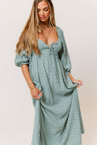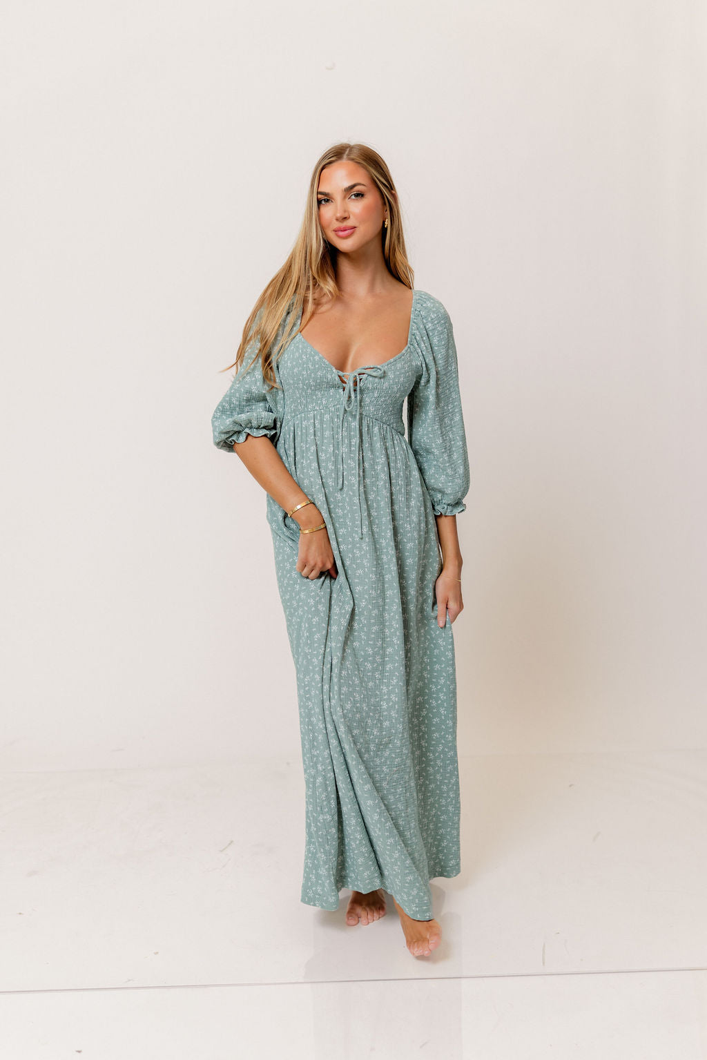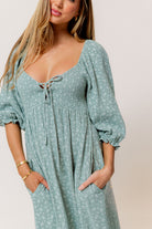 GARMENT DETAILS: Lightweight cotton maxi dress in a charming foliage print, with a sweetheart neckline, 3/4 length sleeves, and an adjustable front tie detail. Features a smocked bodice, side pockets, and ruffle accents. This colorway is not lined.