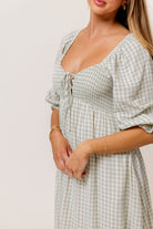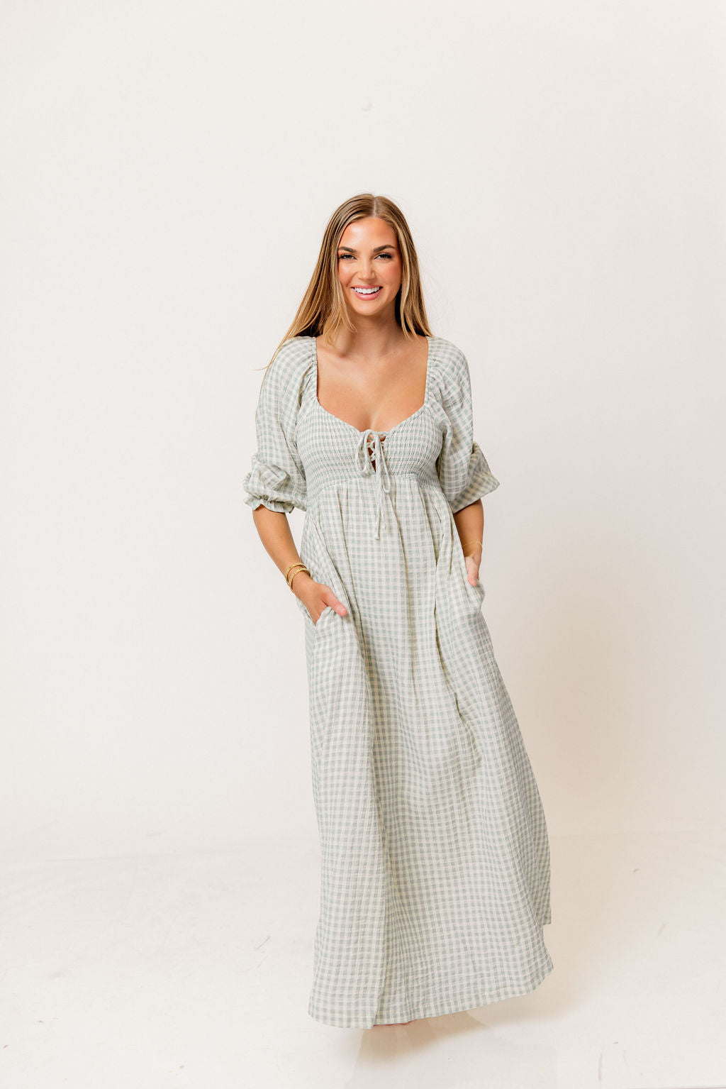GARMENT DETAILS: Lightweight cotton maxi dress in a charming plaid print, with a sweetheart neckline, 3/4 length sleeves, and an adjustable front tie detail. Features a smocked bodice, side pockets, and ruffle accents. This colorway has a full lining.