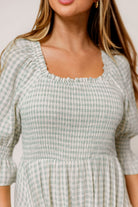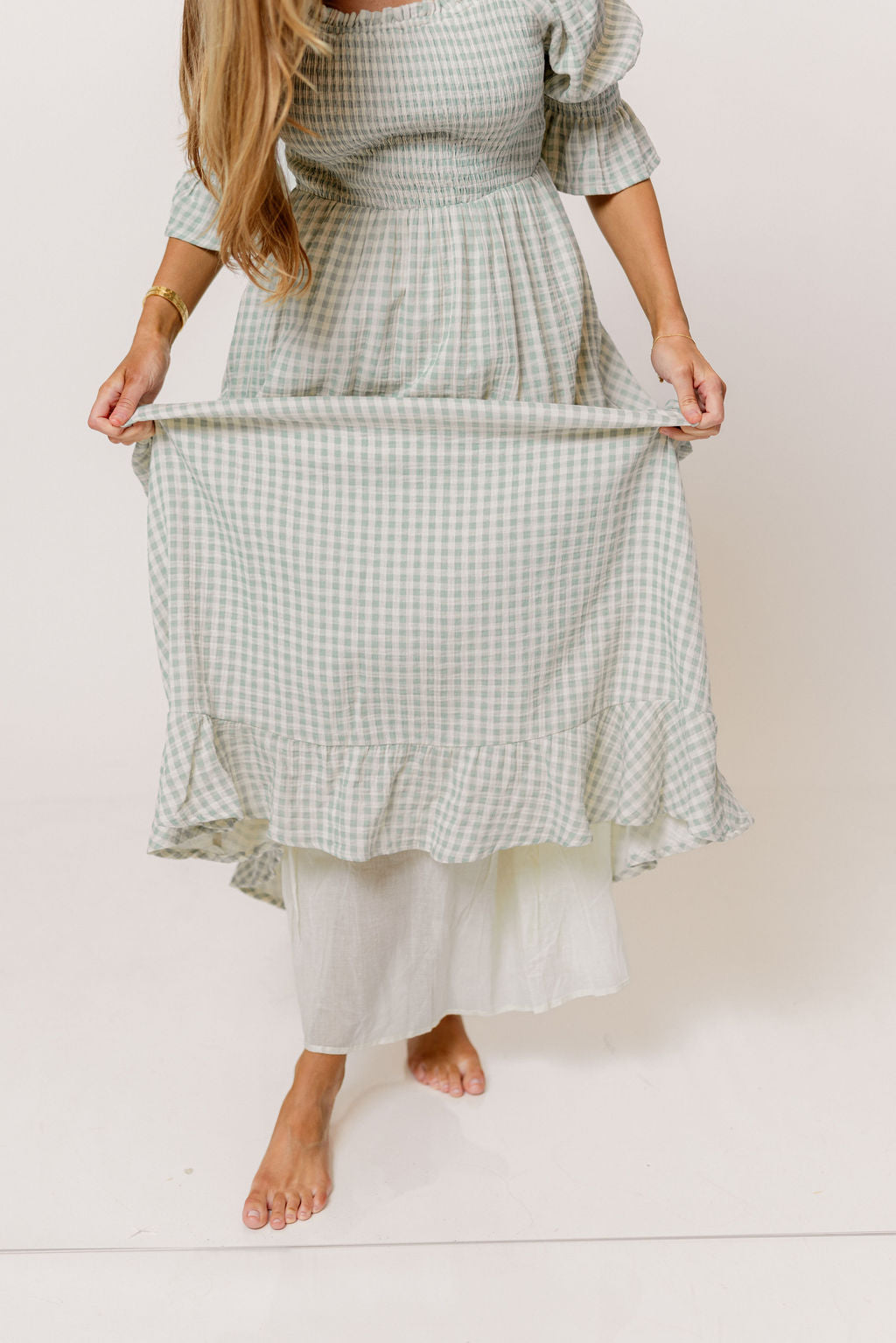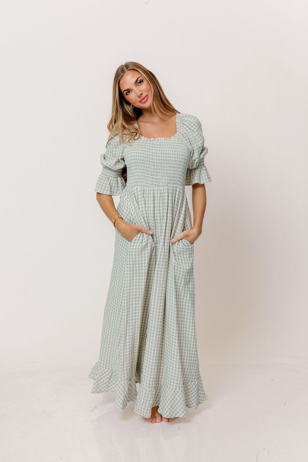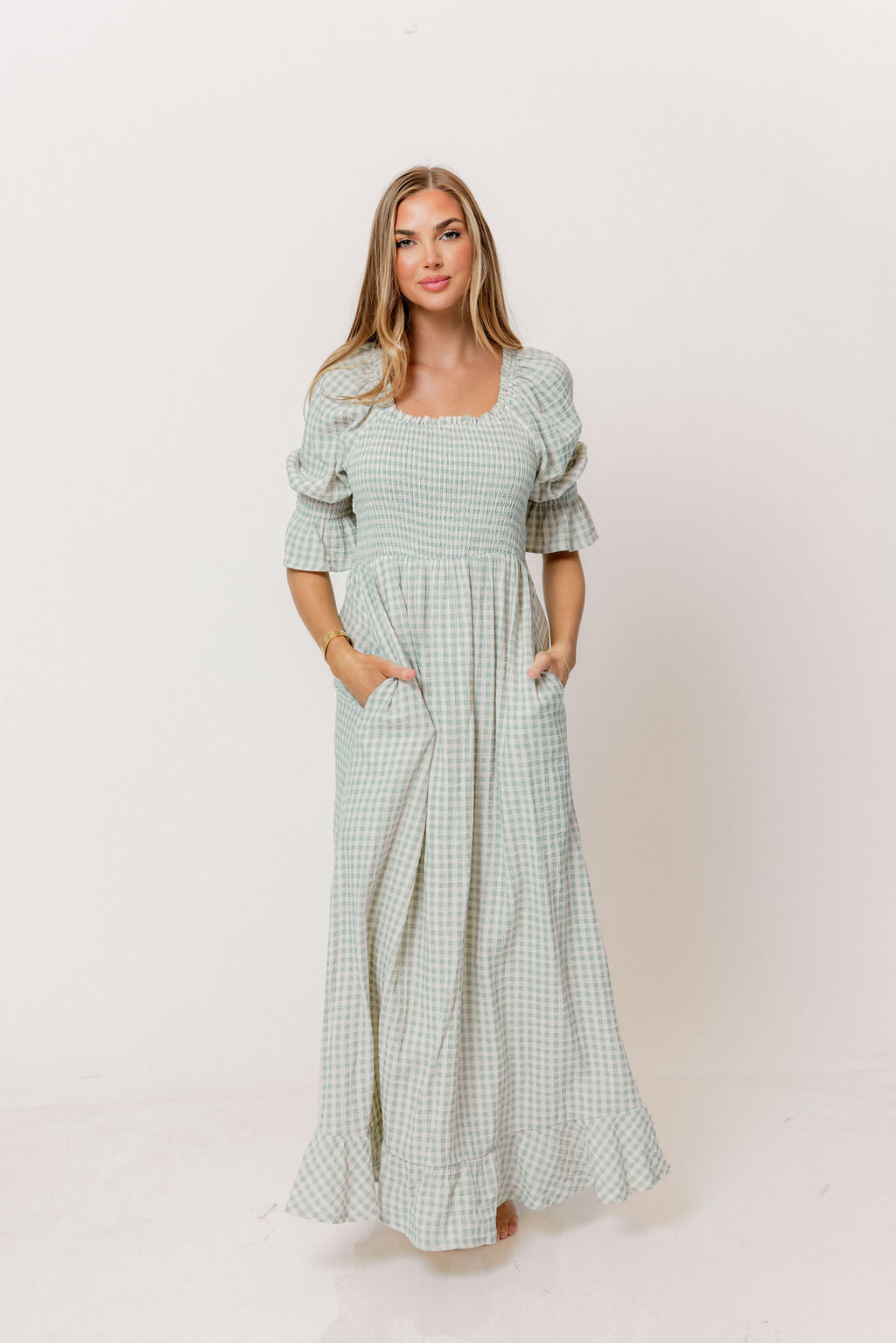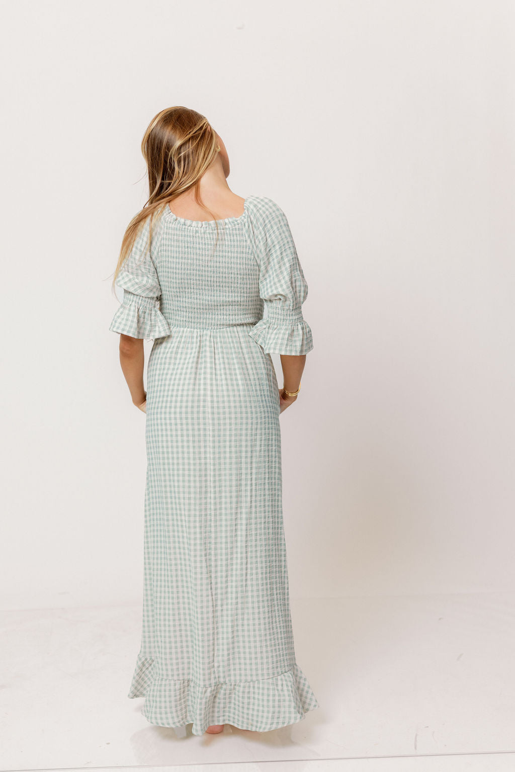 GARMENT DETAILS: Elegant, lightweight maxi dress in a darling gingham plaid print, with stretchy neckline that can be worn on or off the shoulder. Features 3/4 length puffed sleeves with ruffle, and a stretchy, smocked bodice. This colorway features a full lining.