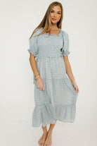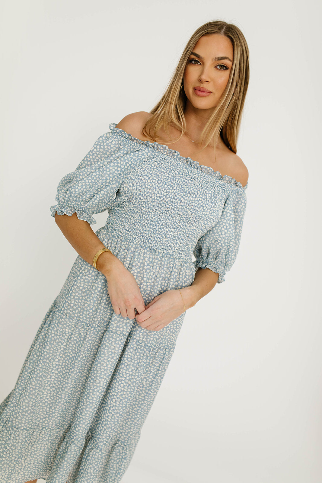 GARMENT DETAILS: Lightweight ditsy floral midi dress with elasticated neckline that can be worn on or off the shoulder. Features fully smocked bodice, puffed sleeves with ruffles, and a multi-tiered skirt with lining.