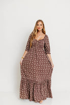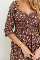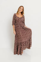 GARMENT DETAILS: Lightweight floral-printed maxi dress with sweetheart neckline, smocked bodice with stretchy waist, and 3/4 length sleeves with elasticated, ruffle cuffs. Finished with an extra-wide tiered skirt, wooden front buttons, and side pockets.